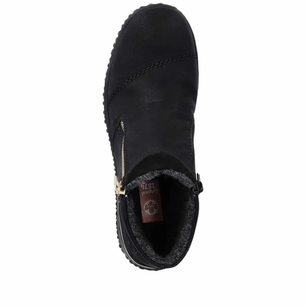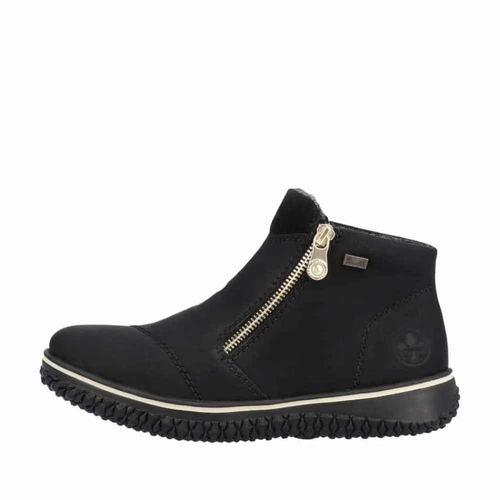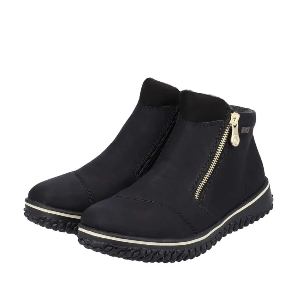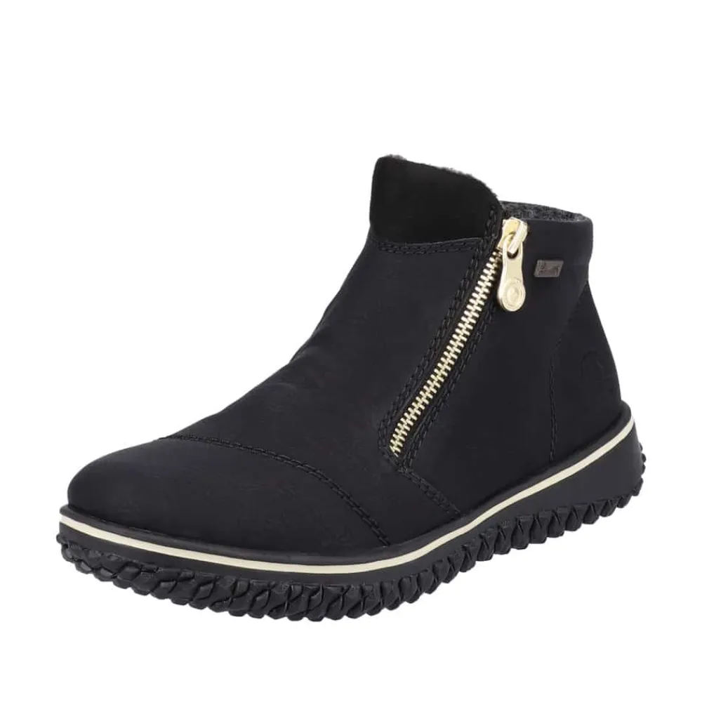 Rieker ankelstøvle i sort til dame. Tag verden med storm i alle slags vejr med denne elegante Rieker støvle! Den sorte støvle er ikke kun et stilfuldt statement, men også en praktisk løsning til den moderne kvinde. Lynlåse på begge sider gør det hurtigt og nemt at hoppe i støvlerne, perfekt til dig, der er på farten. Det luksuriøst bløde, varme foer holder dine fødder dejligt varme hele dagen, mens RiekerTex-teknologien sikrer en imponerende vandafvisende beskyttelse. Uanset om det regner eller sner, er disse støvler dine trofaste følgesvende, der kombinerer komfort, stil og funktionalitet.