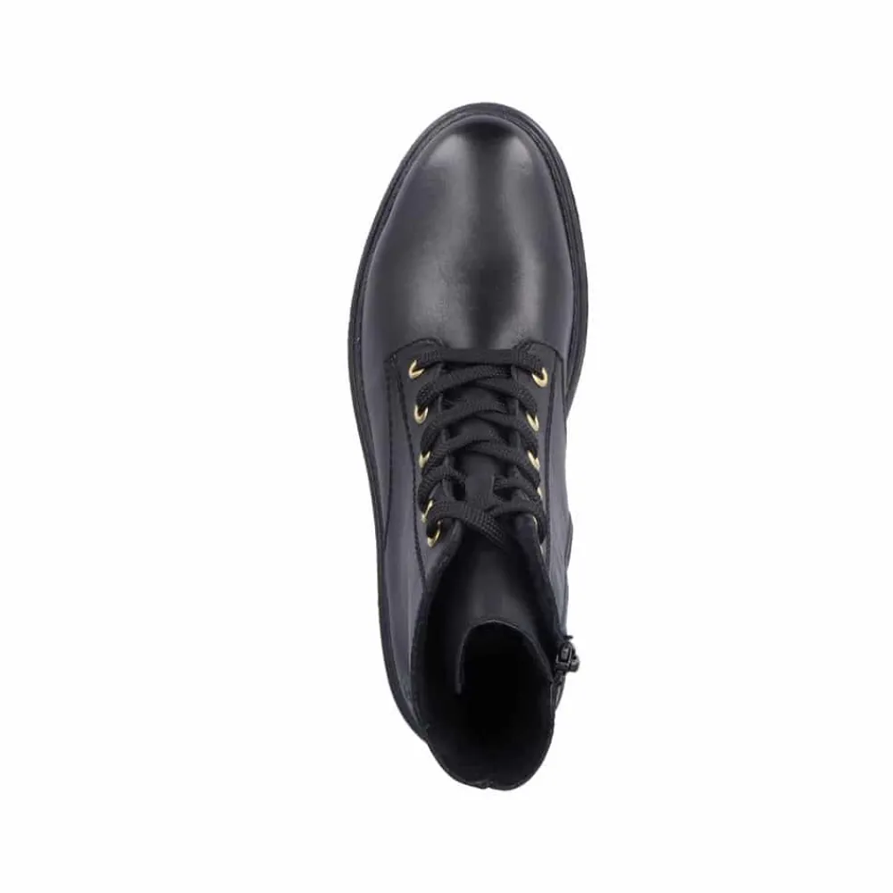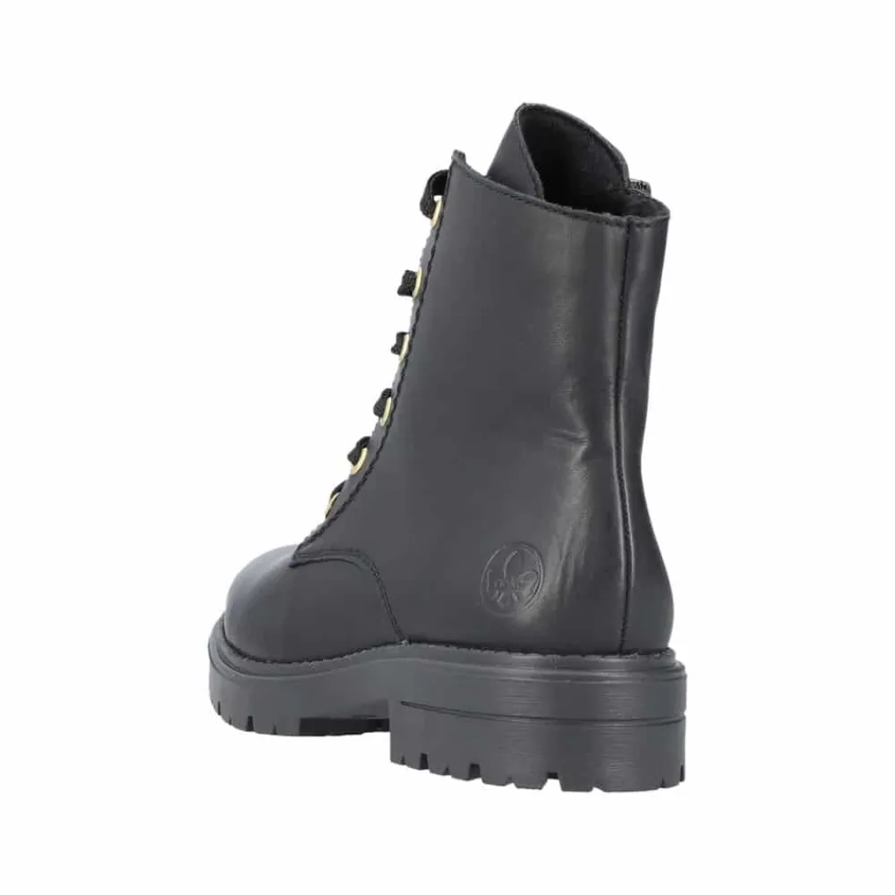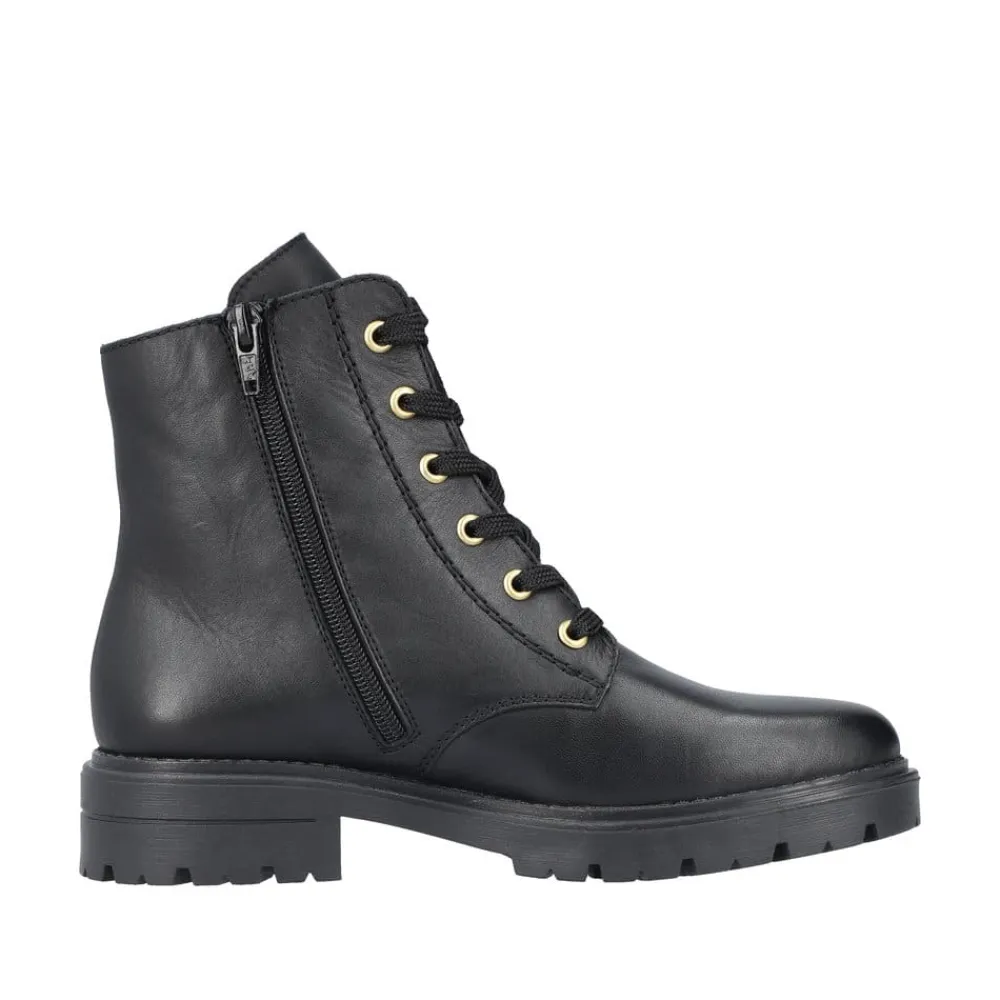 Rieker støvle til dame i sort. Denne sorte støvle i skind kombinerer moderne stil med praktiske detaljer. Støvlen har både snørebånd og en funktionel lynlås, der gør det nemt at tage den af og på, samtidig med at du kan tilpasse pasformen til din fod. Indvendigt sørger en let foring og en blød sål for behagelig komfort hele dagen. Ydersålen er mønstret og stødabsorberende, hvilket giver øget støtte og skridsikkerhed.