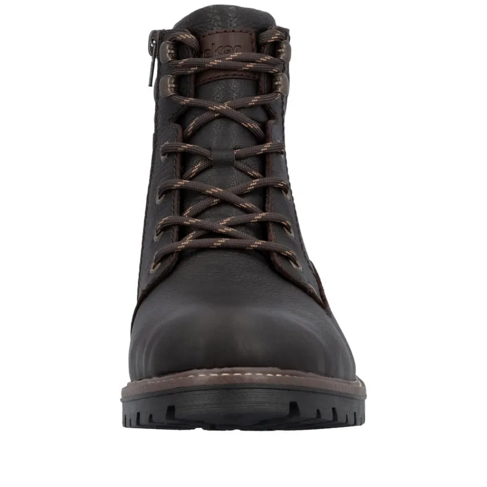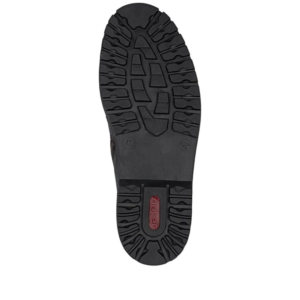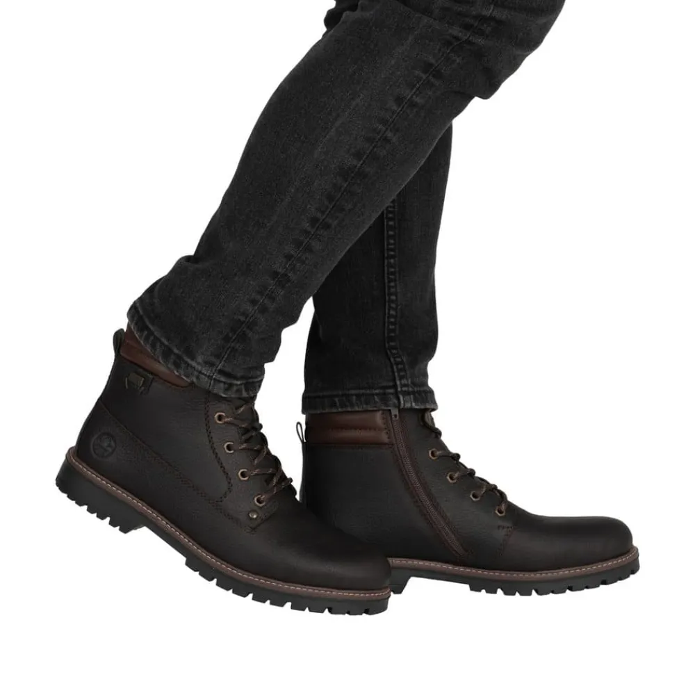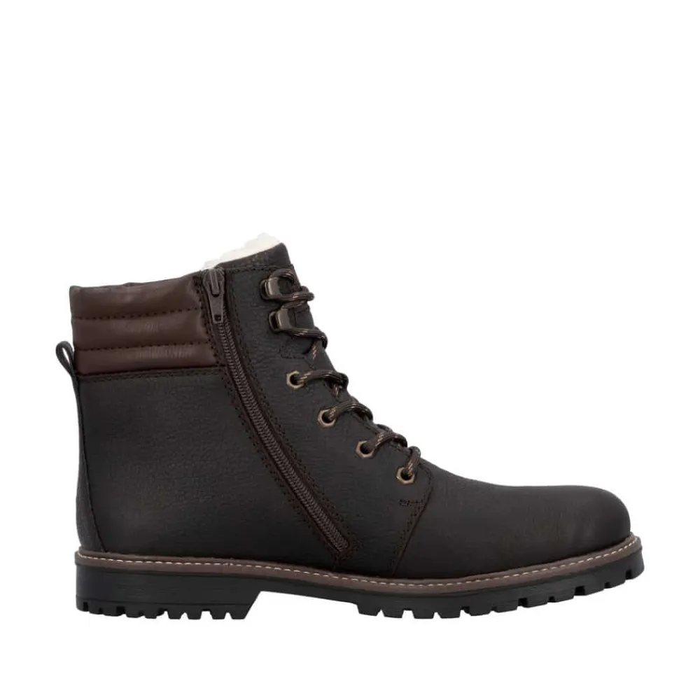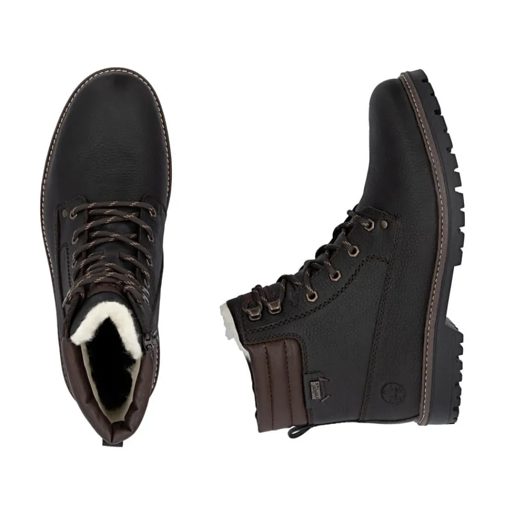 Rieker støvle til herre i mørkebrun. En flot mørkebrun vinterstøvle i skind med praktiske og stilfulde detaljer. Snørebåndene foran giver mulighed for at justere pasformen, og lynlåsen på indersiden gør støvlen let at tage på. Indvendigt finder du en varm uldforing og en blød indersål med ekstra bredde G, som sikrer komfort og rummelighed. Rieker-Tex gør støvlen kraftigt vandafvisende, mens den slidstærke ydersål med stødabsorbering og mønster giver øget skridsikkerhed og støtte på vinterens underlag.