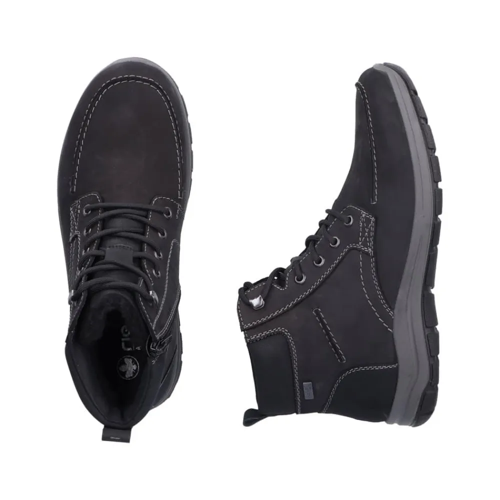 Rieker vinterstøvle til herre i sort. Snørestøvler til herrer fremstillet med en overdel i ægte ruskind. Støvlerne byder på et klassisk design kombineret med fremragende komfort. Den praktiske kombination af snørebånd og lynlås sikrer en perfekt pasform og gør det nemt at tage støvlerne af og på. Den lette og stødabsorberende sål giver dine fødder maksimal komfort hele dagen. Med en polstret og udtagelig indersål føles hvert skridt som ren forkælelse. Den ekstra brede pasform (H) giver rigelig plads til tæerne, mens den vandafvisende RiekerTEX-membran beskytter mod vind og vejr. Det bløde, varme foer holder fødderne behageligt lune, selv på kolde vinterdage. Perfekt til at kombinere funktionalitet og elegance i vinterens udfordringer.