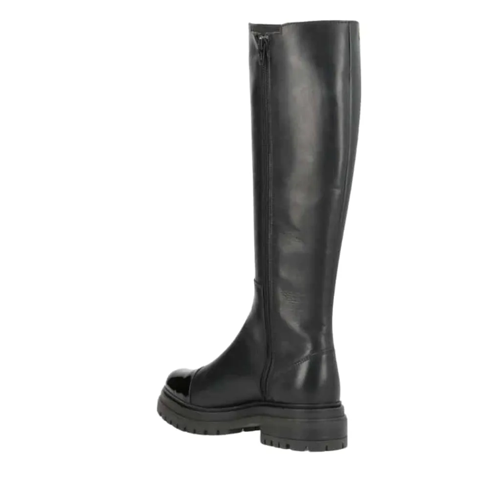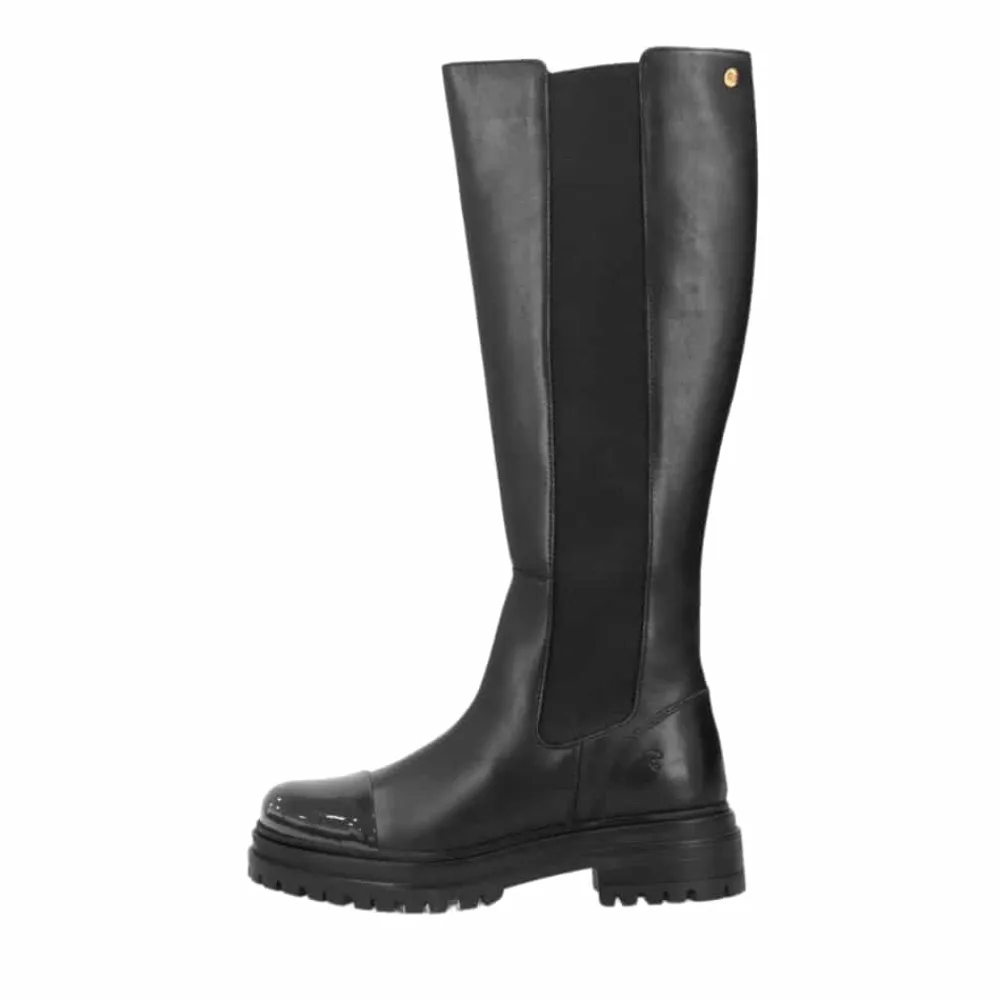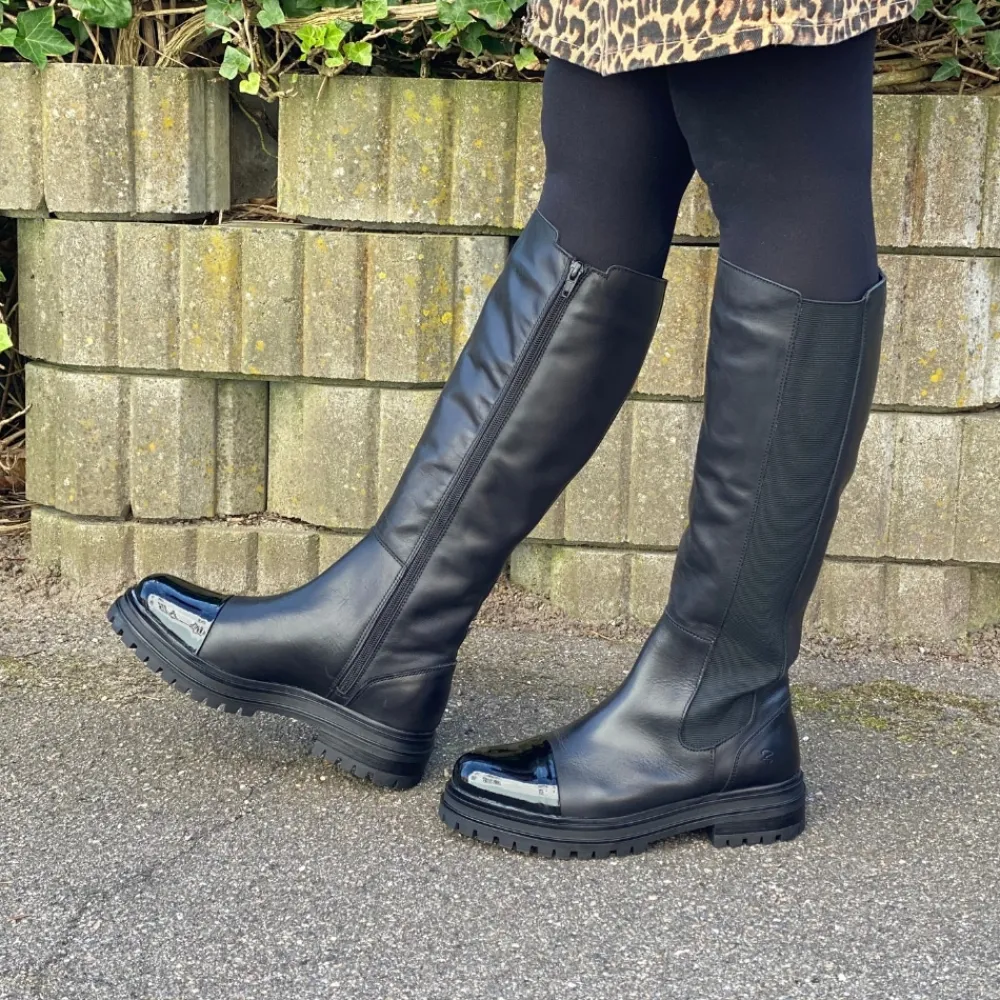 Shoedesign Copenhagen Hasta La Vista P lang støvle til dame i sort. Moderne sort støvle med flotte detaljer og en laksnude, der tilfører et stilfuldt touch. Overdelen er fremstillet i blødt skind, som sikrer en behagelig pasform. På indersiden finder du en funktionel lynlås, mens elastikken på ydersiden gør det enkelt at tage støvlen af og på. Den chunky hæl på ca. 4,5 cm giver et elegant løft og fuldender designet, uden at det går ud over komforten.