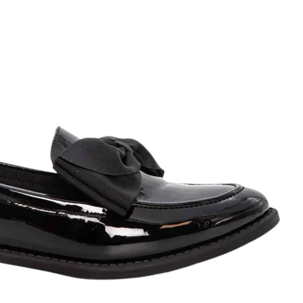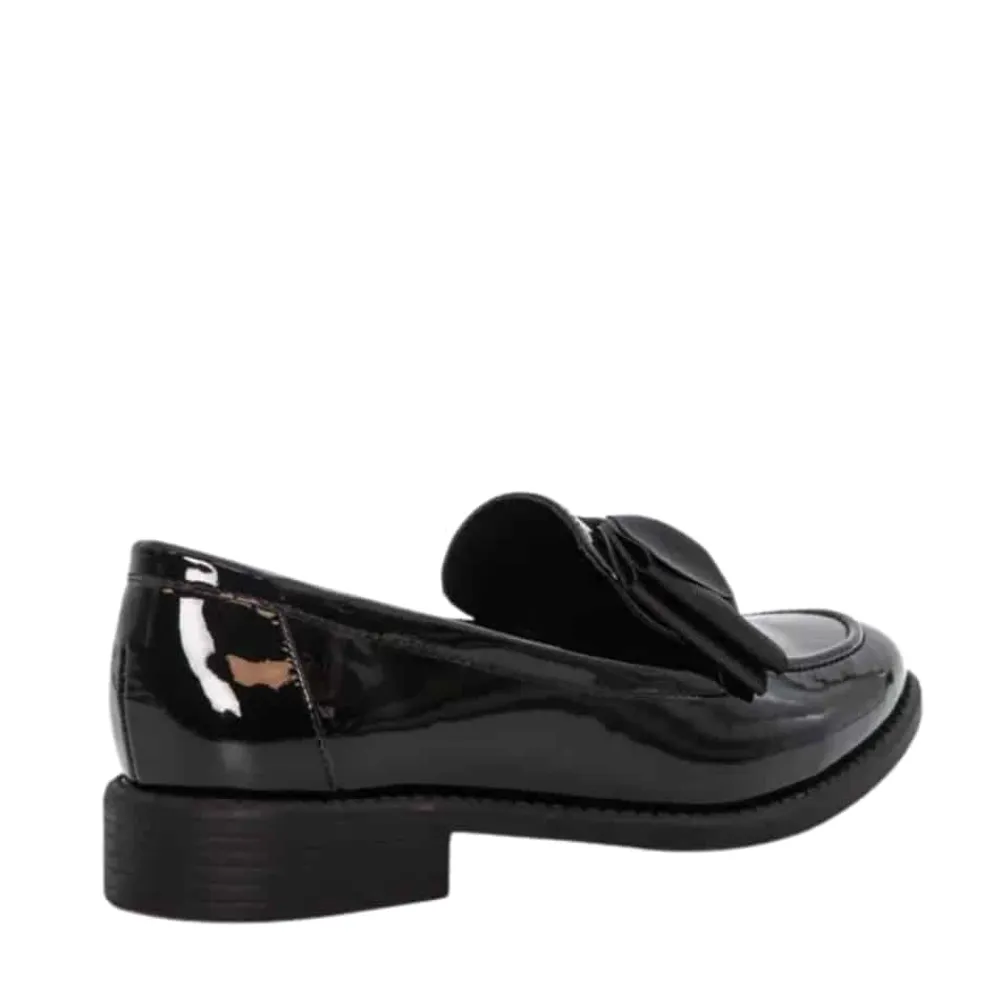 Duffy Francica Sette loafers til dame i sort lak. Disse loafers til dame kombinerer sort lakoverdel med en elegant sløjfe detalje for et feminint udtryk. Skoen er praktisk i hverdagen og let at komme i og af, samtidig med at den kan bruges til pænere lejligheder. Indvendigt finder du en blød indersål, der giver god komfort dagen lang. Den lille hæl på ca. 3 cm giver et diskret løft og bidrager til stabil støtte.