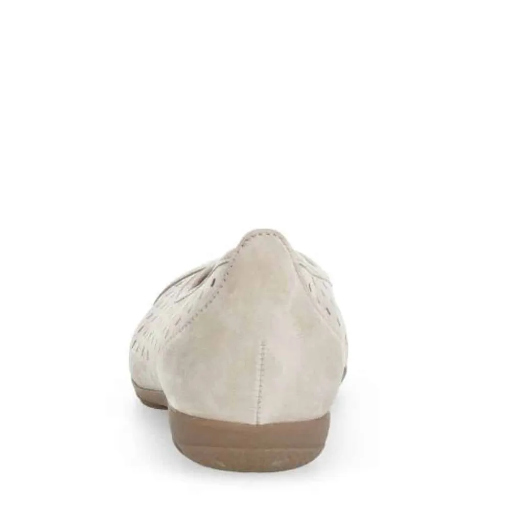 Gabor ballerinasko til dame i beige. Gør dit skridt stilfuldt med disse elegante ballerinasko, der er fremstillet af førsteklasses læder både udvendigt og indvendigt. De smukke, markante syninger foran og bagpå tilføjer et strejf af elegance. Desuden har skoen også smarte huller på siderne sikrer optimal åndbarhed og komfort. Skoen har en dejlig blød sål, med huller, for yderligere komfort. Hvad angår skoens sål, er den god og solid samt udstyret med godt mønster for øget skridsikkerhed.