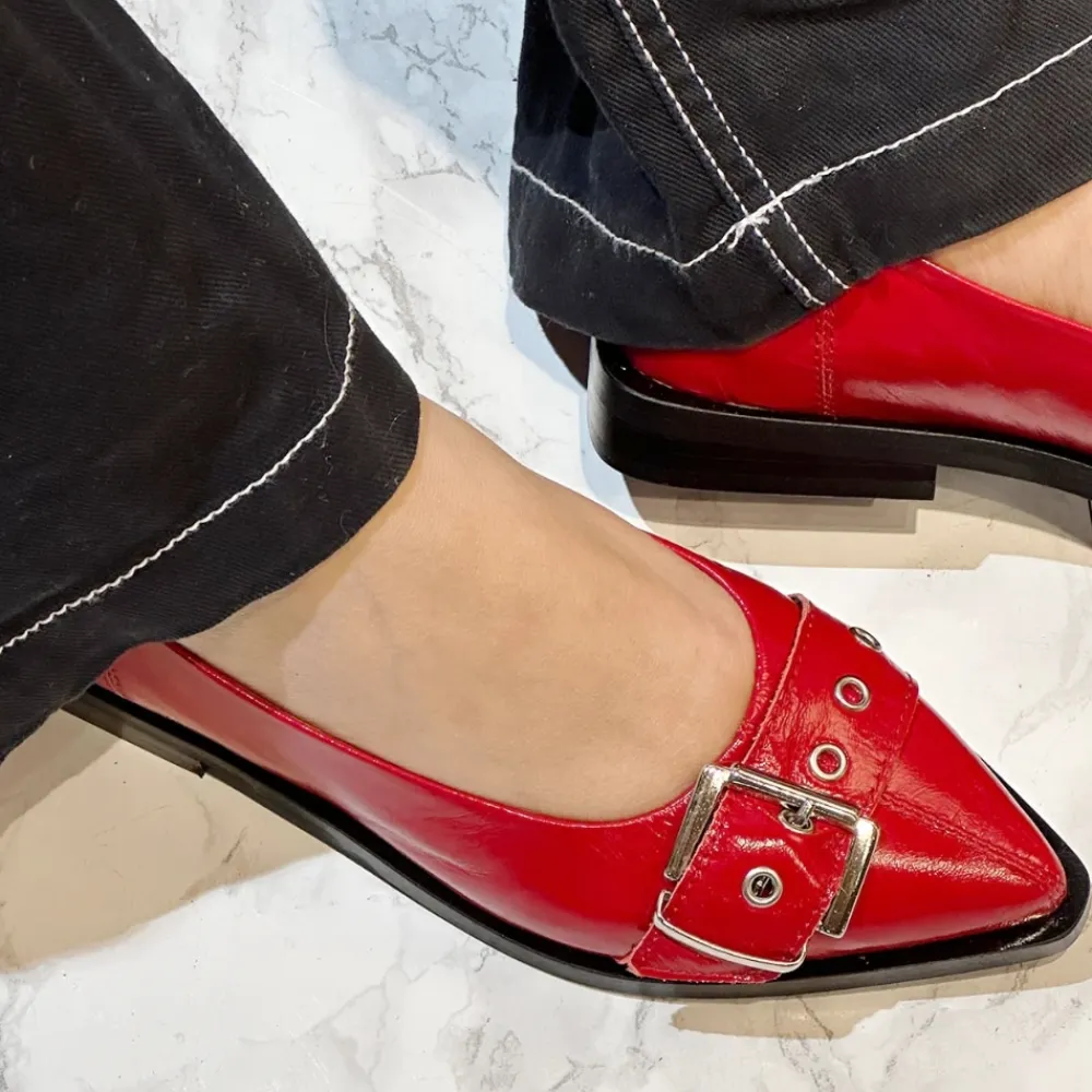 Phenumb Copenhagen MUST ballerinasko til dame i rød. Hop med på trenden med disse flotte ballerinasko i rød lak med smukke spændedetaljer, der giver skoen et råt look. Fremstillet af 100% skind og kvalitetsmaterialer, vil disse sko give dine fødder dejlig støtte og komfort, så du kan have dem på i timevis. Den spidse tå tilføjer et strejf af elegance til skoen som modspil til det rå look, hvilket gør den perfekt til både hverdagsbrug og festlige lejligheder. Disse sko er størrelsessvarende og vil være et stilfuldt valg til enhver lejlighed.