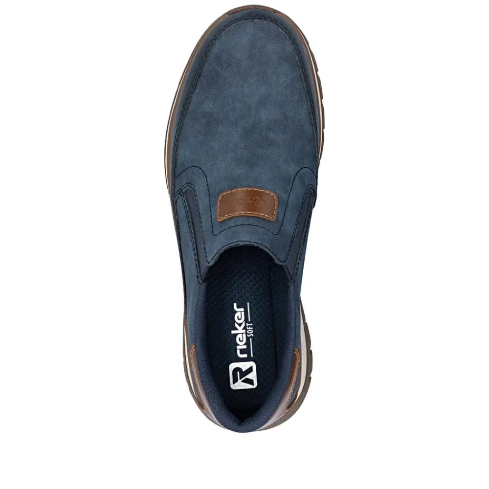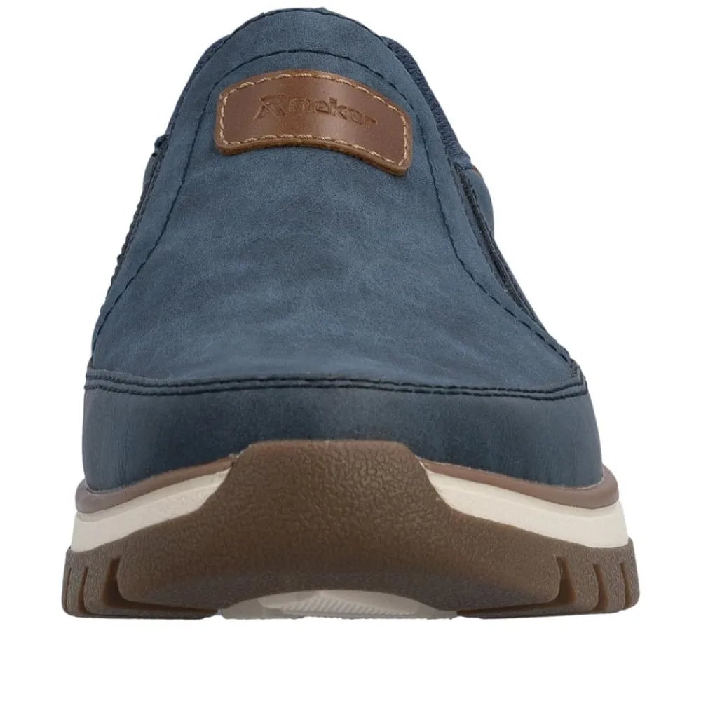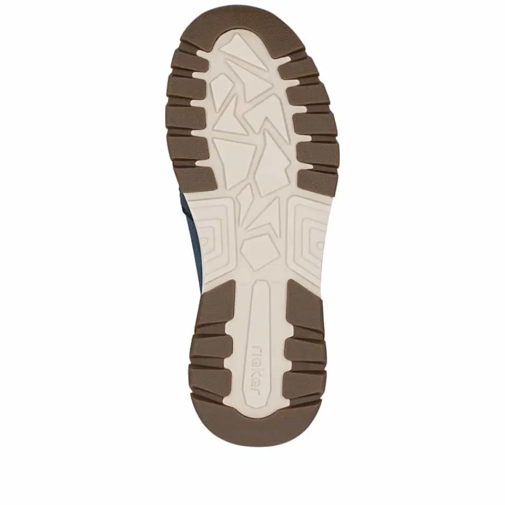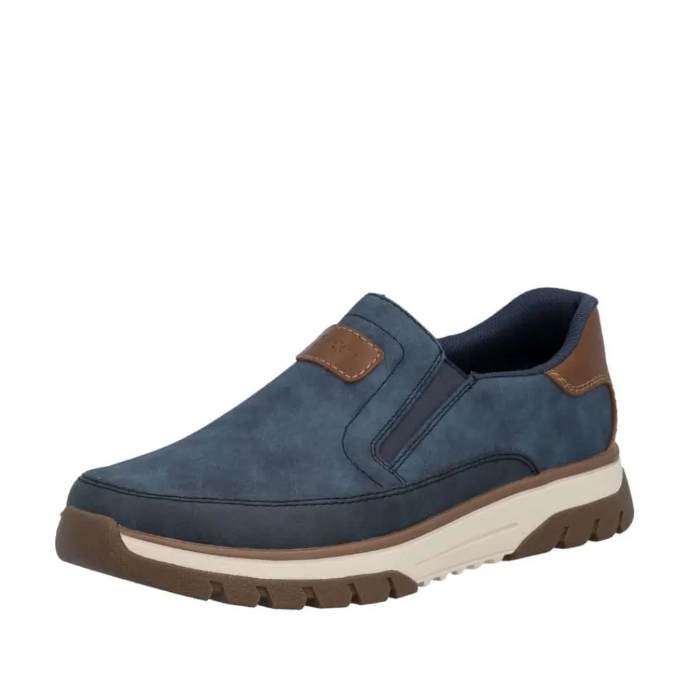Rieker hyttesko herre i blå. Stilfulde og komfortable sko i et praktisk design, hvor pasform og komfort er i fokus. Elastikken ved åbningen gør at du nemt kan komme i skoen. Indvendigt finder du en blød udtagelig indersål, som giver behagelig komfort hele dagen. Med ekstra bredde (H) får du god rummelighed til foden, så skoen føles behagelig at bruge. Den mønstrede ydersål giver øget støtte og skridsikkerhed.
