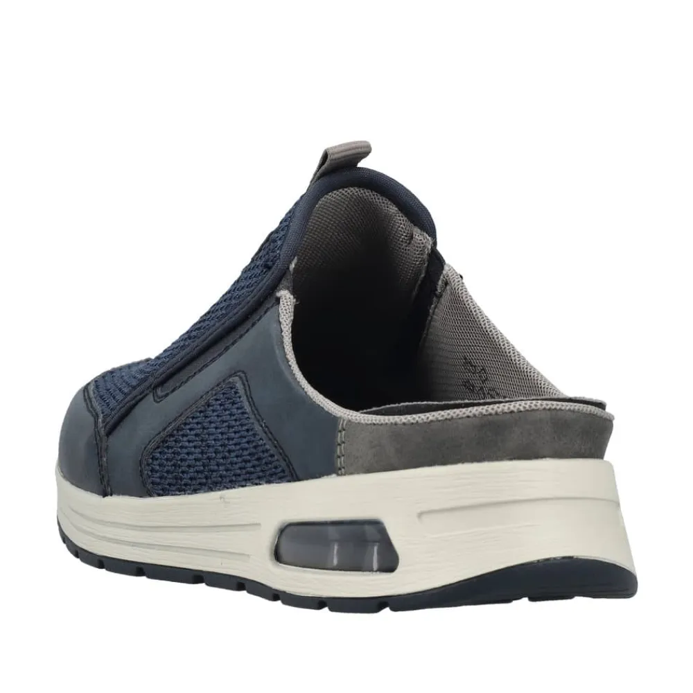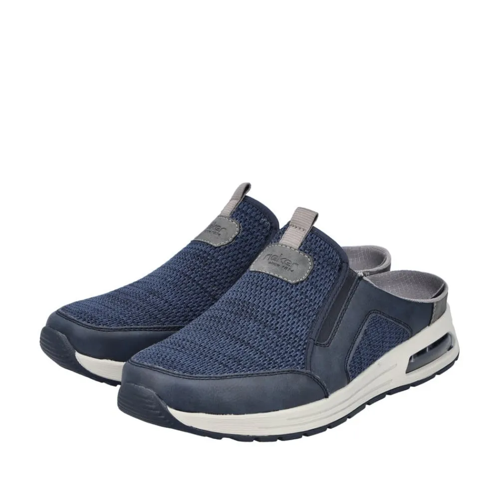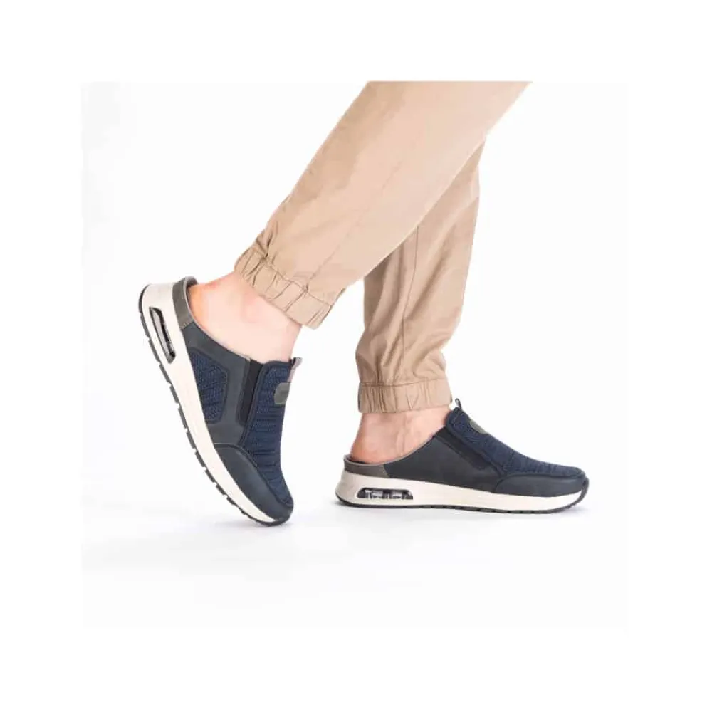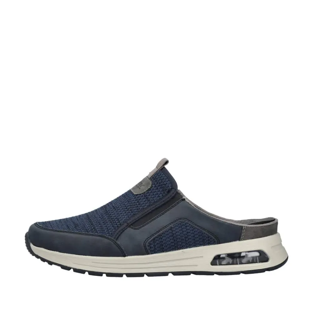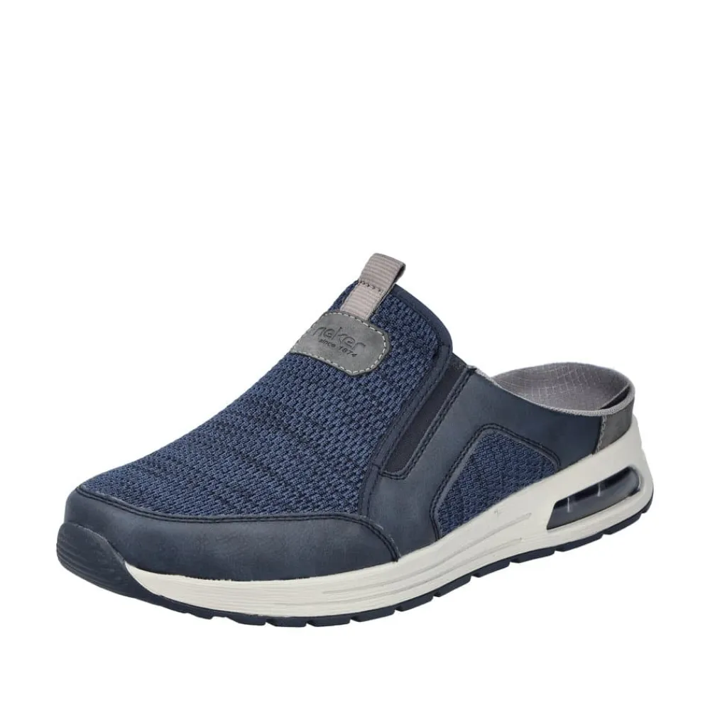 Rieker hyttesko til herre i blå. Funktionel og stilfuld. Denne blå Rieker-hyttesko til mænd med elastisk indlæg gør på- og aftagning af sandalen hurtig og nem. Med den lette, stødabsorberende sål og den polstrede, udtagelige indersål får du den bedste komfort hele dagen. Den komfortvidde G giver ekstra plads til bredere fødder, mens Rieker Air i hælen tilføjer både et moderne look og en blød stødabsorbering.