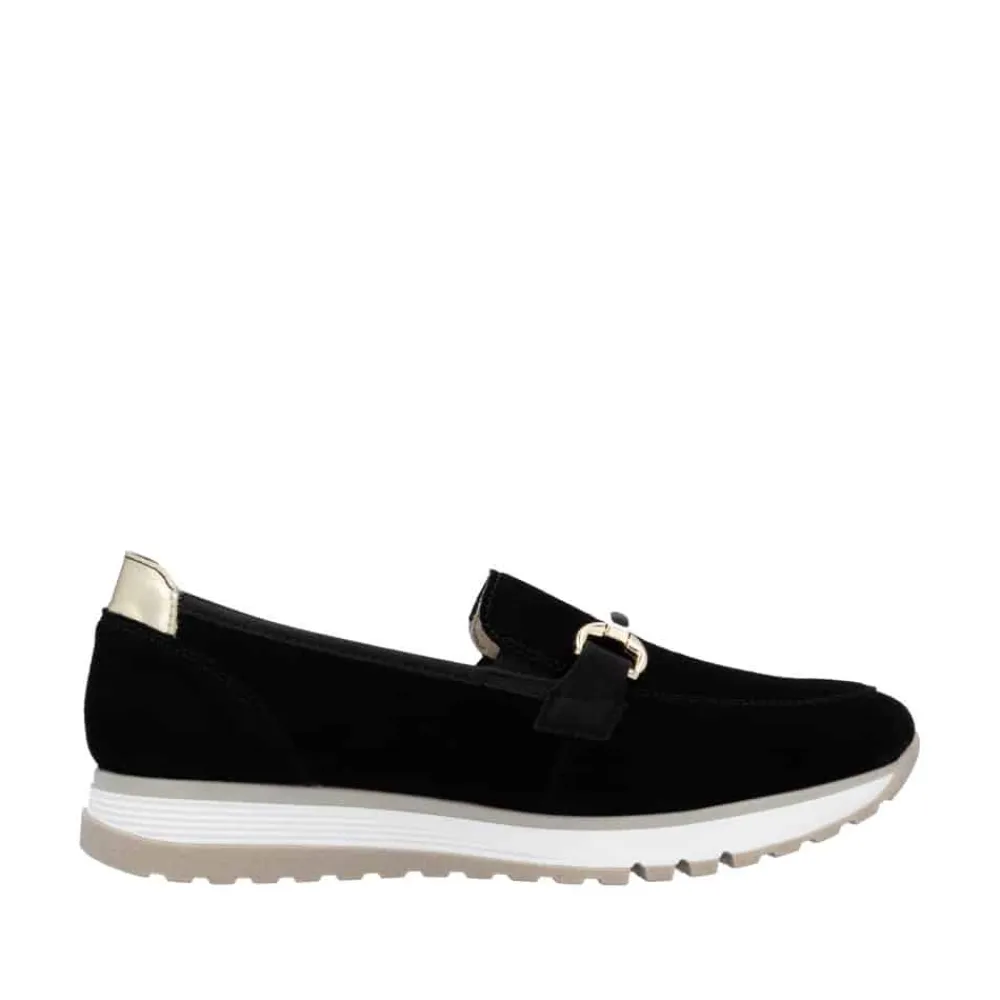 Rieker loafers til dame i sort. Komfort og stil går hånd i hånd med disse Rieker loafers til damer i sort ruskind. Med en 30 mm hælhøjde og elastiske indsatser, der gør det nemt at tage skoene af og på, får du både funktionalitet og elegance i ét. Den udtagelige indersål med Anti-Stress teknologi sikrer, at du går komfortabelt hele dagen. Den luksuriøse ruskindsoverflade, kombineret med den robuste hvid-beige gummisål, giver både holdbarhed og et stilfuldt udseende. Det smarte krom-guld spænde og den ekstra vidde H gør denne sko ideel til dig, der ønsker ekstra komfort og plads.