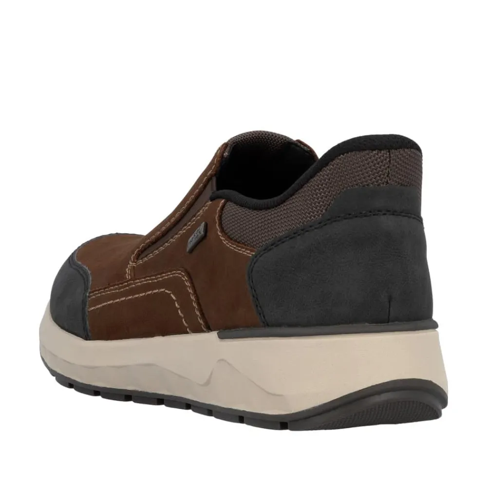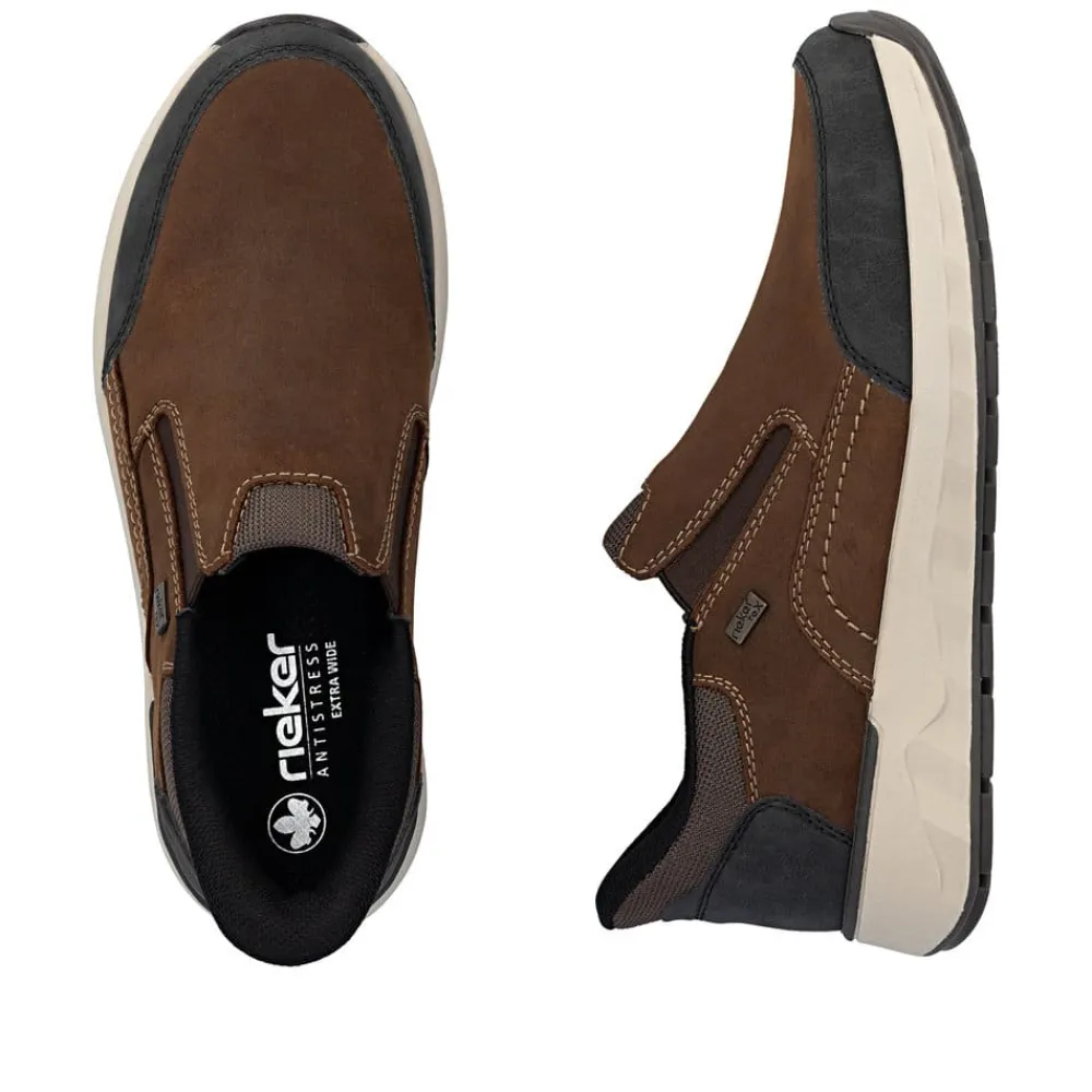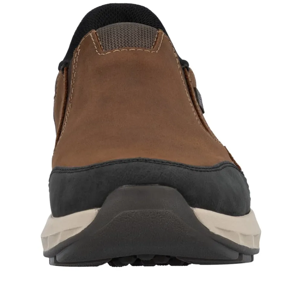 Rieker Ready 2 Go hyttesko til herre i brun. Flot hyttesko til herre i brun skind, der kombinerer komfort og funktionalitet. Modellen er udstyret med Ready 2 Go teknologi og en fast hælkappe, så du nemt kan tage skoen på uden brug af hænder. Indvendigt sørger en blød udtagelig sål og ekstra bredde (H) for høj komfort og fleksibilitet. Med Rieker-Tex er skoen kraftigt vandafvisende, og den solide ydersål med mønster giver både øget stødabsorbering og skridsikkerhed.