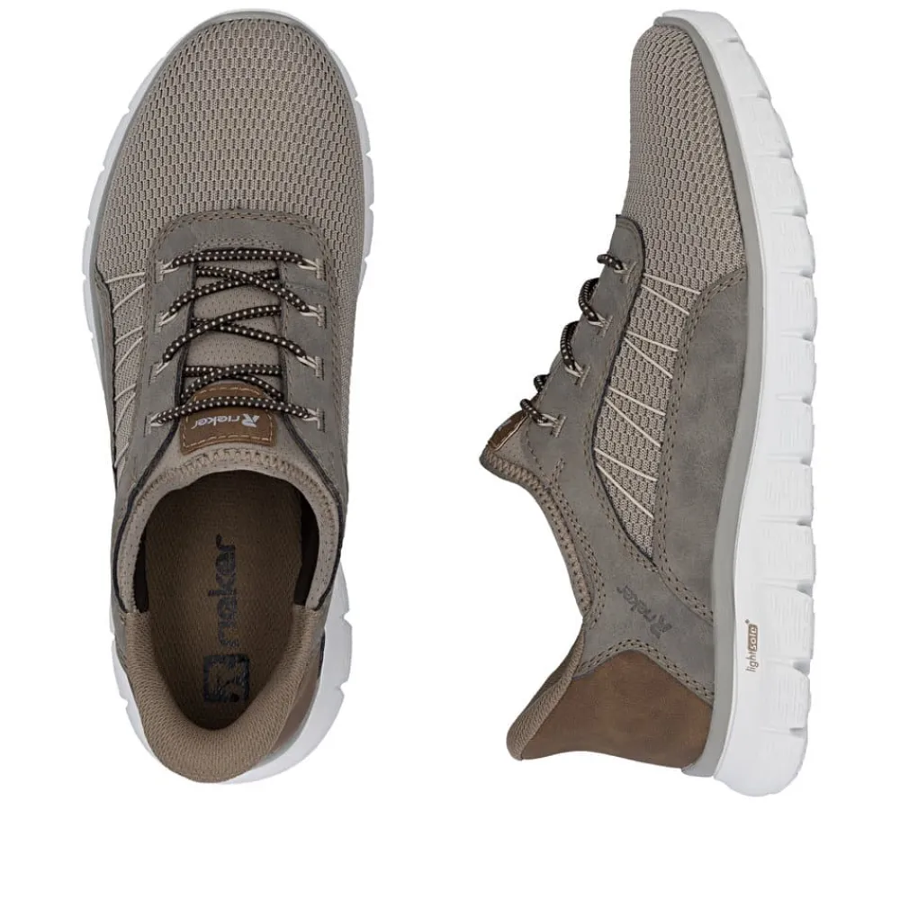 Rieker Ready 2 Go sneakers til herre i beige. Denne sneakers er udstyret med Hands Free Ready 2 Go teknologi, så du nemt kan tage skoen på uden hænder, takket være den faste hælkappe. Elastikken foran giver en behagelig pasform, og indvendigt mødes du af en blød indersål, der sikrer god komfort hele dagen. Med Rieker-Lite får du en utrolig let sko, og Rieker Antistress giver fleksibilitet og stødabsorbering, så hvert skridt føles behageligt.
