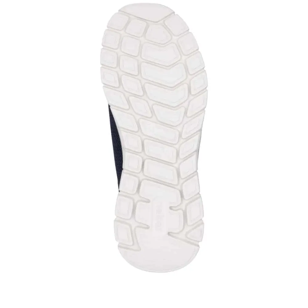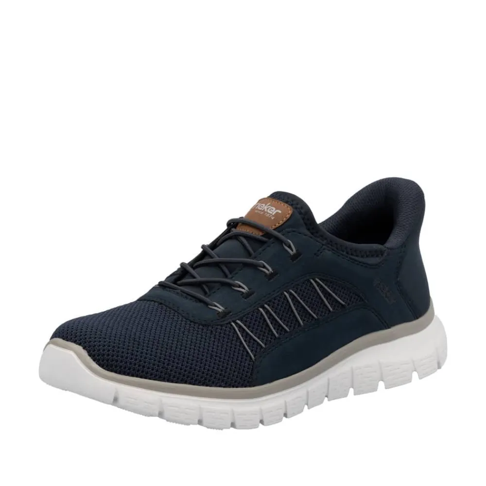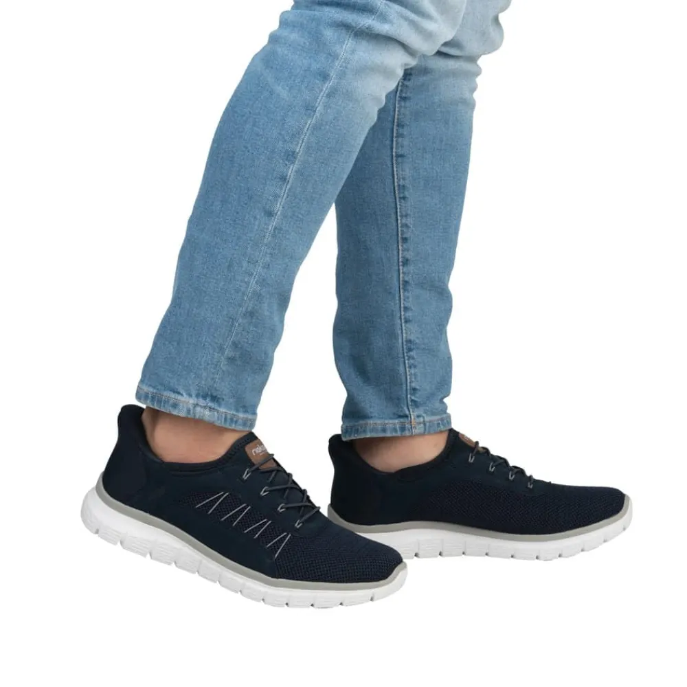 Rieker Ready 2 Go sneakers til herre i blå. Denne Rieker sneakers er udstyret med den praktiske Hands Free Ready 2 Go-teknologi, som gør det nemt at tage skoen på uden at bruge hænderne, takket være den solide hælkappe. Med Rieker-Lite er skoen utrolig let og udstyret med Rieker Antistress, der sikrer optimal fleksibilitet og stødabsorbering. Den elastiske åbning tilpasser sig foden for maksimal komfort.
