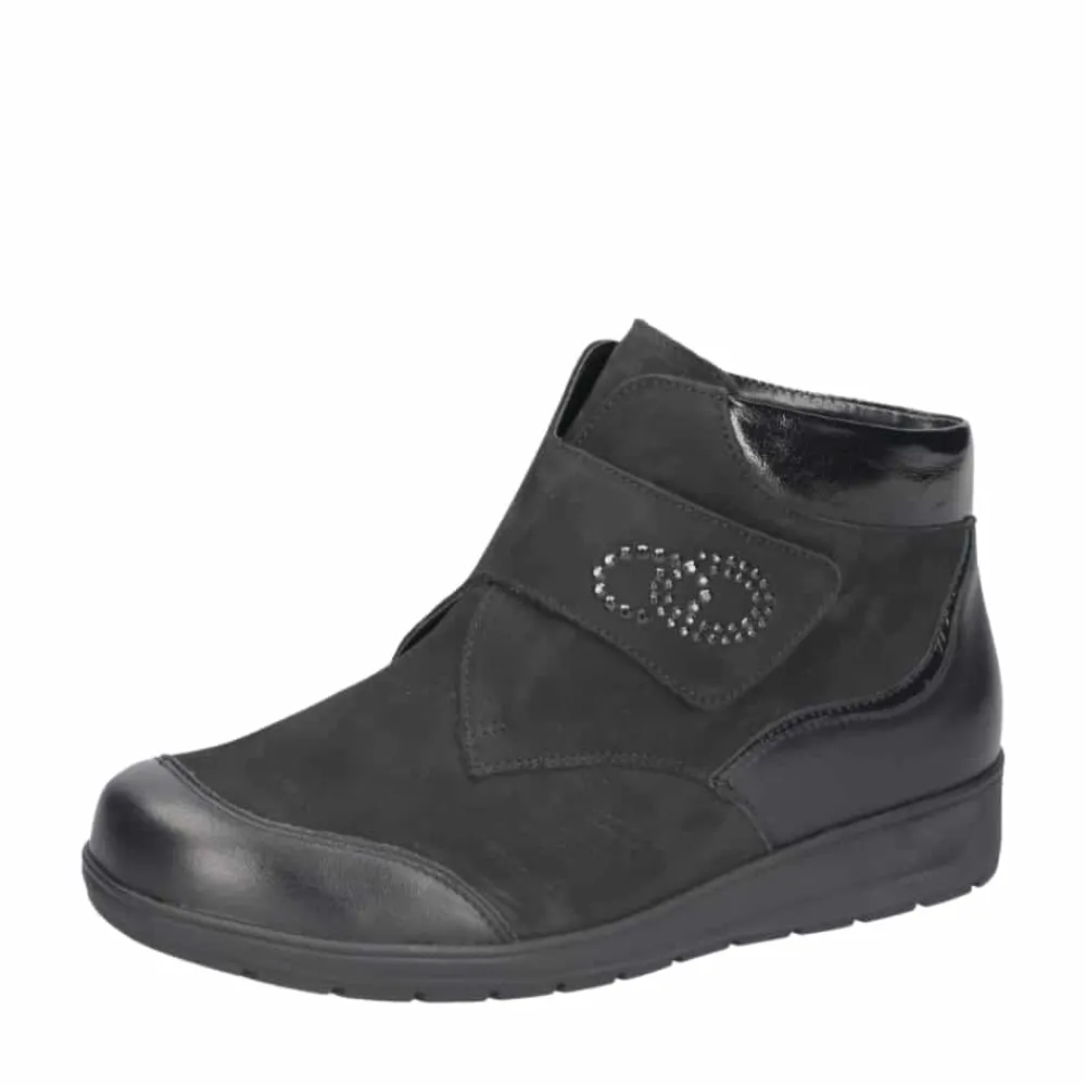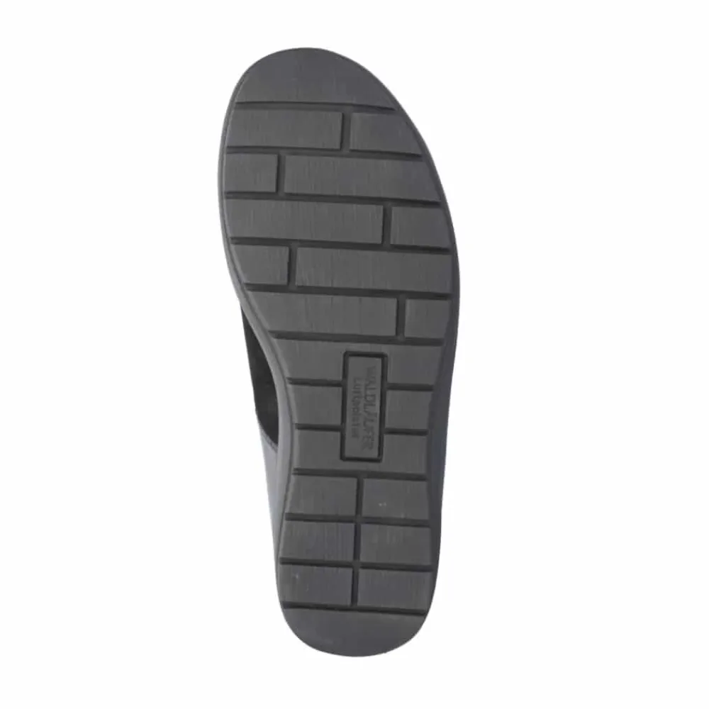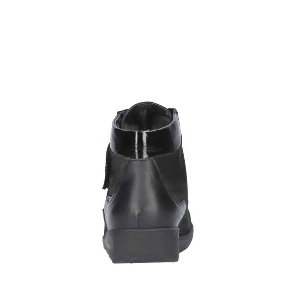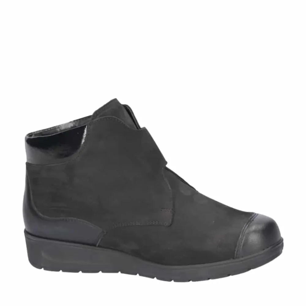 Waldläufer støvle til dame i sort. En stilfuld støvle i sort med elegante detaljer og en overdel i 100% skind, der giver et moderne og feminint look. Støvlen er udstyret med en praktisk velcrorem, som gør det nemt at justere pasformen og tage støvlen af samt på. Indvendigt finder du en blød, udtagelig indersål med ekstra bredde M samt en varm foring, der holder fødderne lune. Ydersålen er solid og mønstret for at give øget stabilitet og skridsikkerhed.