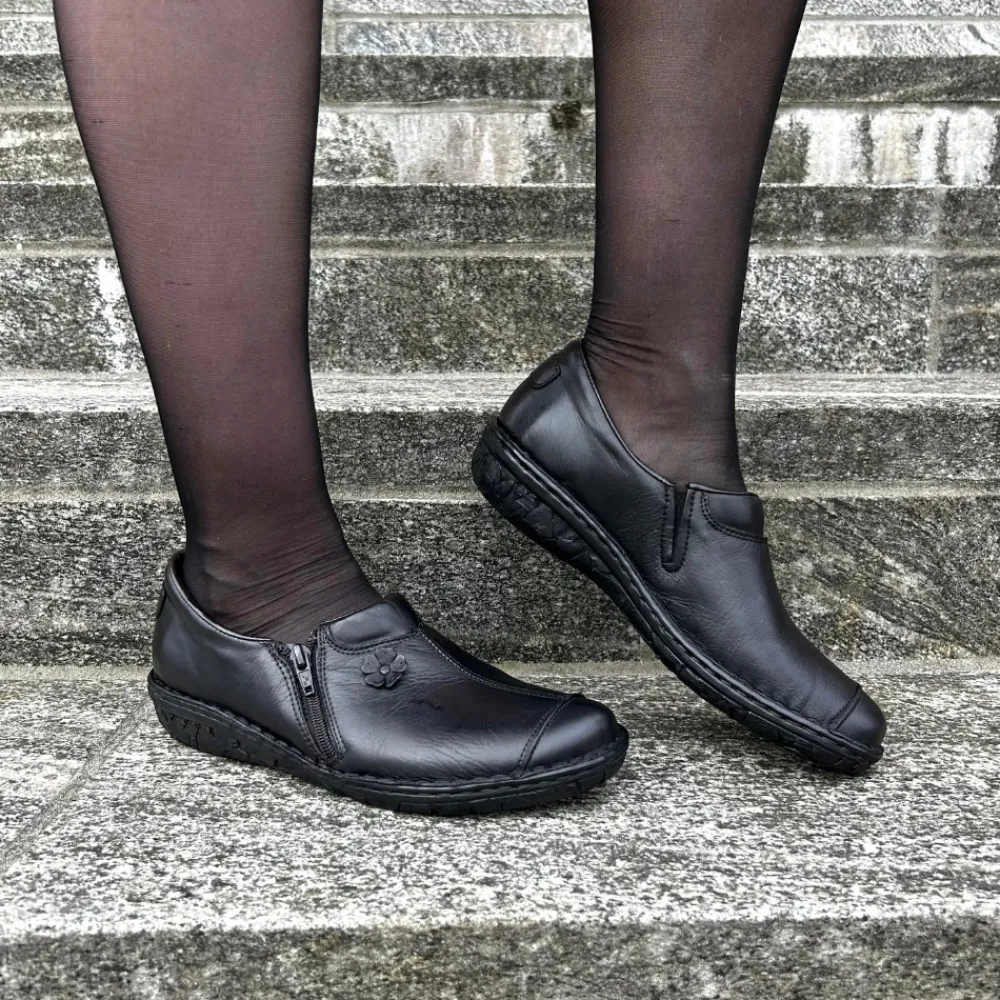 Relaxshoe sko til dame i sort. Flot sko i sort skind med en dekorativ blomst på siden, der giver et feminint og stilfuldt udtryk. Overdelen er lavet af blødt skind, som føles behageligt og sikrer høj komfort. Med to funktionelle lynlåse er skoen nem at tage af og på. Indvendigt sørger en blød og udtagelig indersål i skind for komfort hele dagen, mens den solide ydersål med mønster giver øget støtte og skridsikkerhed.