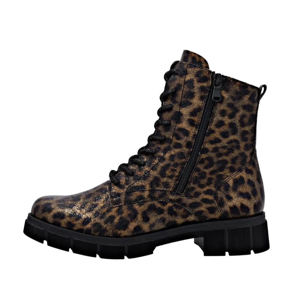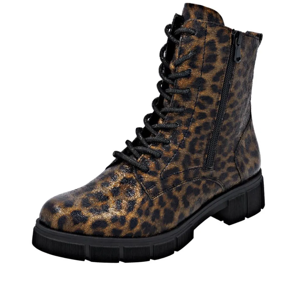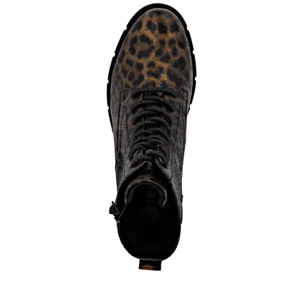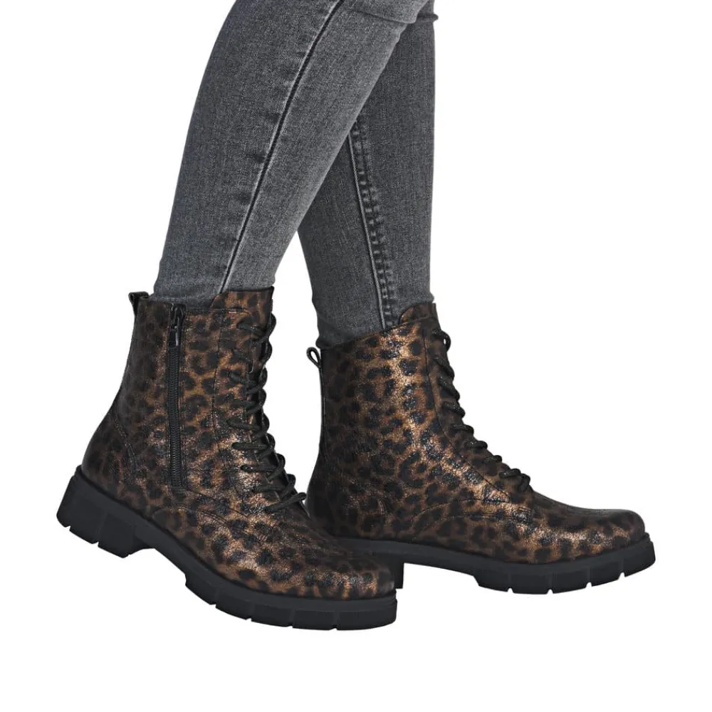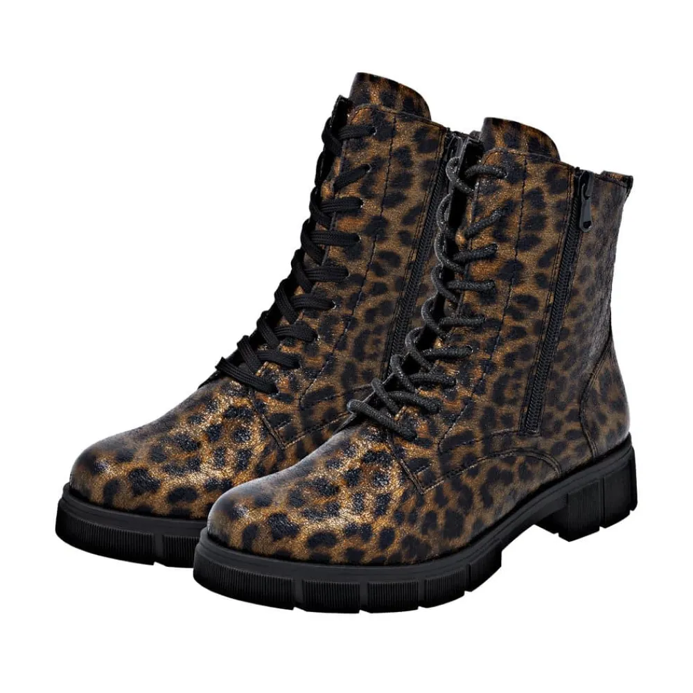 Remonte støvle til dame i leopard. Stilfuld støvle med tekstureret overdel i leopardmønster, der giver et moderne udtryk. Støvlen har snørebånd, som kan udskiftes, samt en praktisk lynlås på ydersiden, der gør den nem at tage af og på. Indvendigt finder du en blød indersål og en let foring samt ekstra bredde G giver god rummelighed. Den chunky ydersål på cirka 4 cm har et mønster, der sikrer øget skridsikkerhed og støtte.