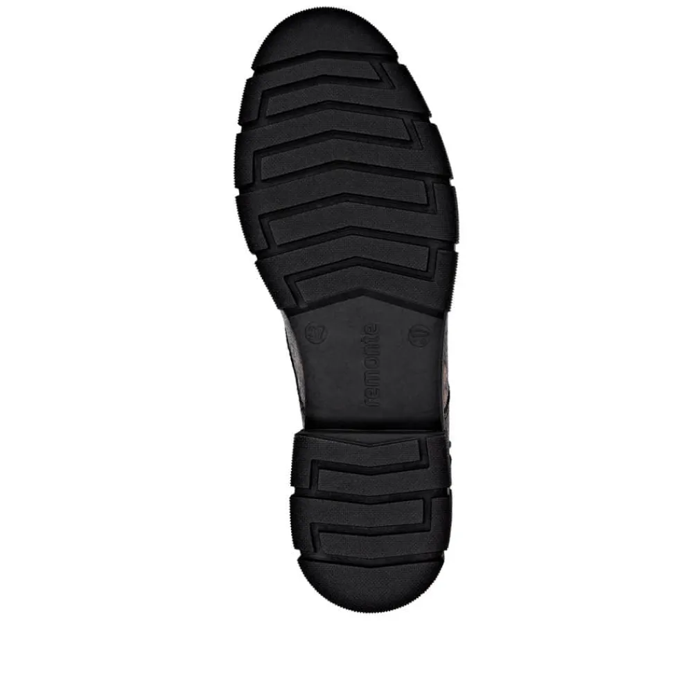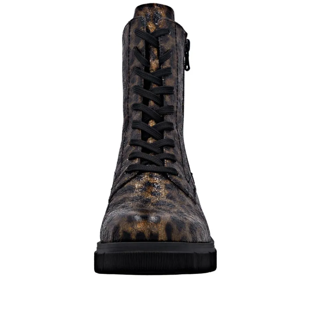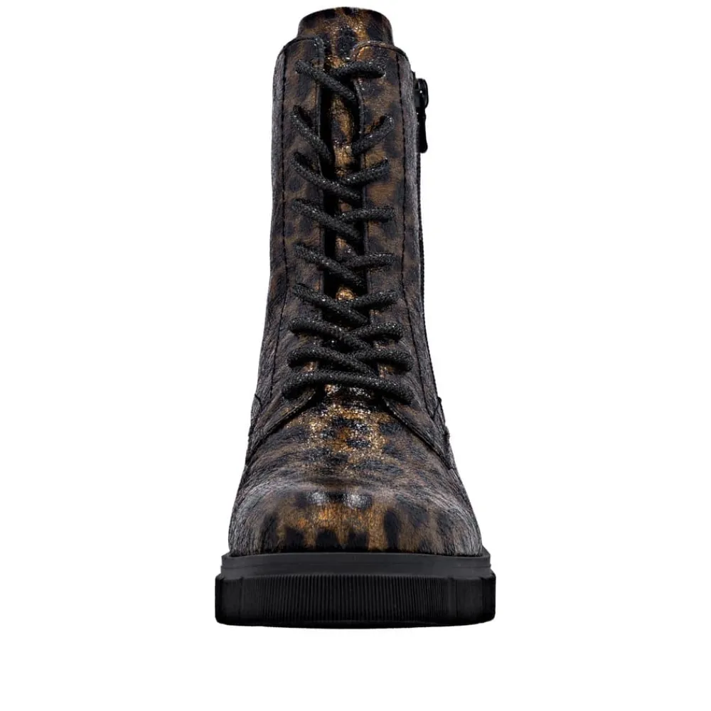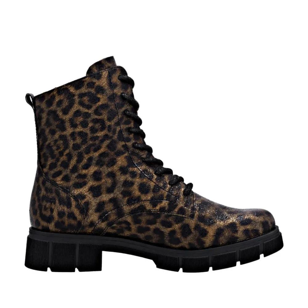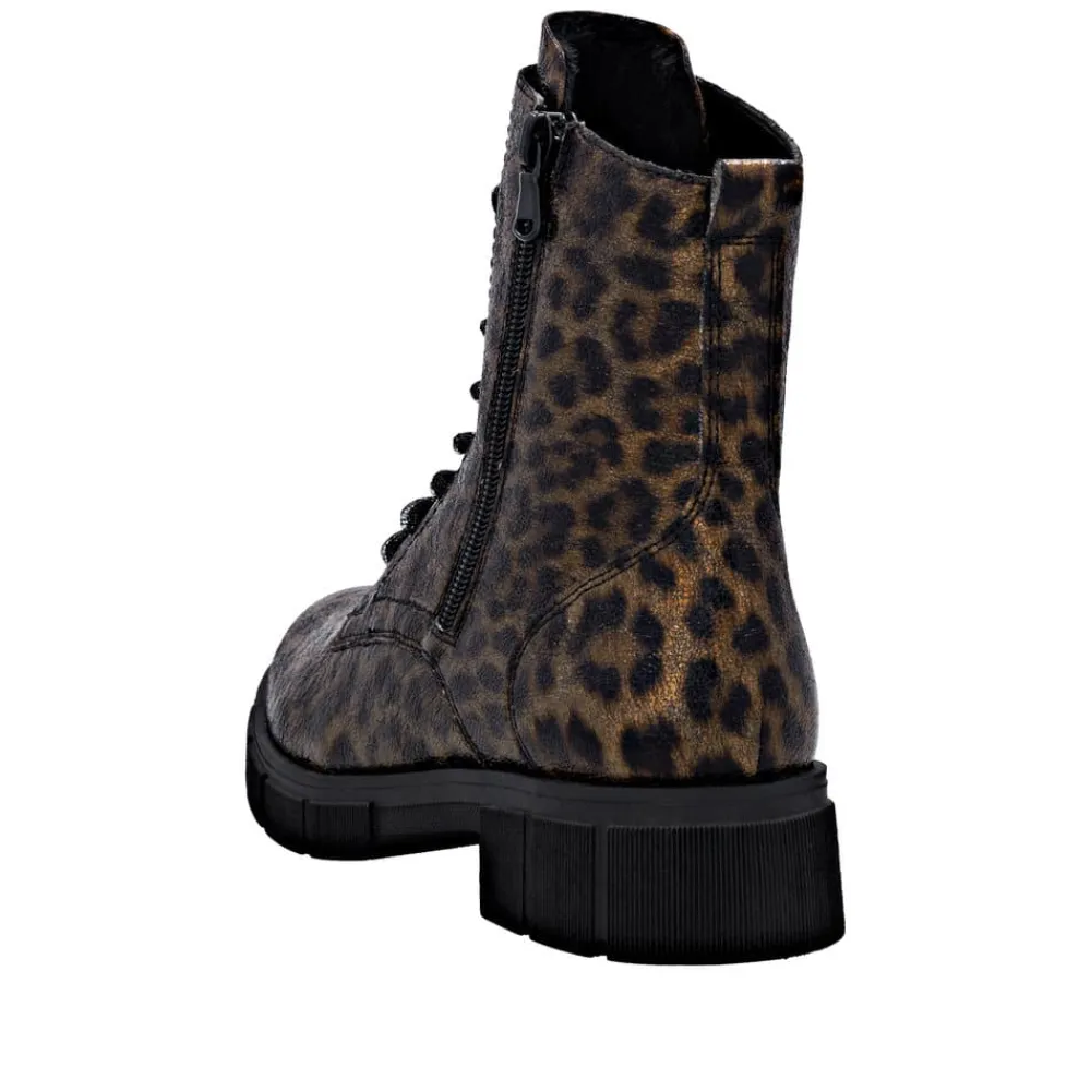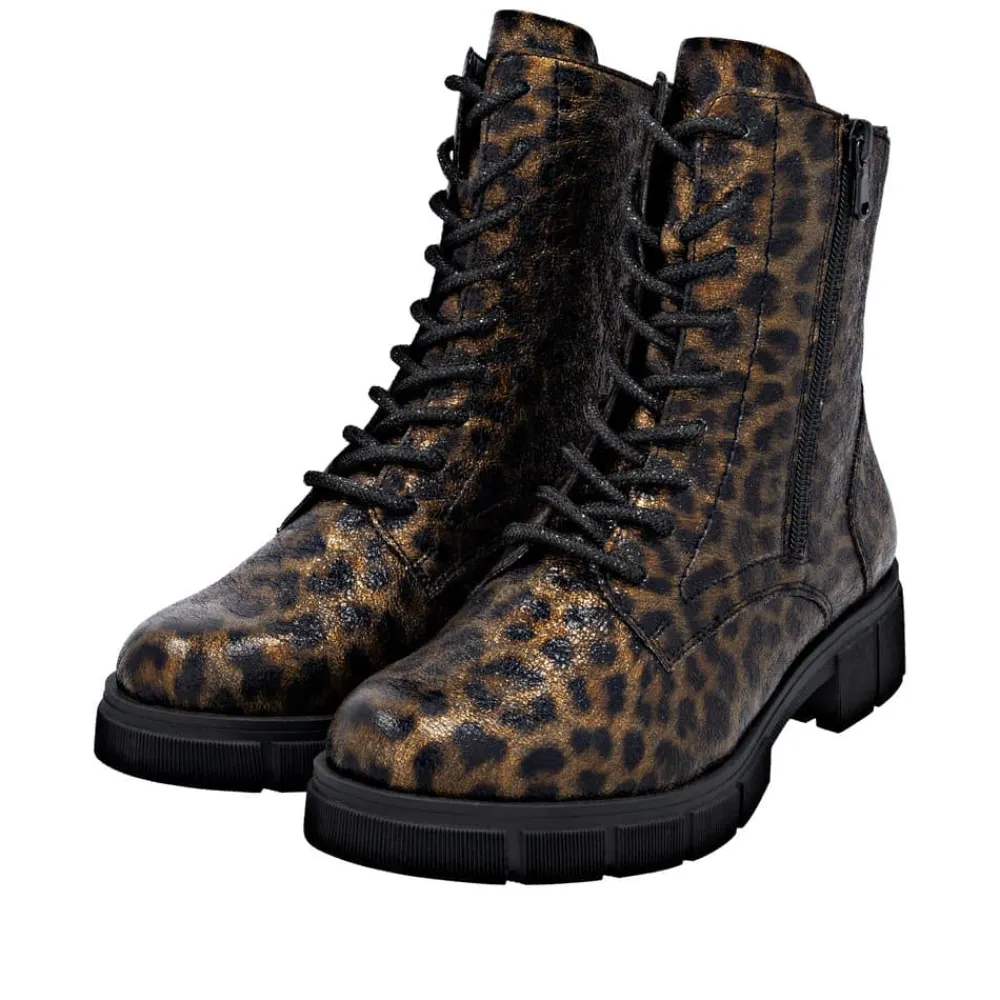 Remonte støvle til dame i leopard. Stilfuld støvle med tekstureret overdel i leopardmønster, der giver et moderne udtryk. Støvlen har snørebånd, som kan udskiftes, samt en praktisk lynlås på ydersiden, der gør den nem at tage af og på. Indvendigt finder du en blød indersål og en let foring samt ekstra bredde G giver god rummelighed. Den chunky ydersål på cirka 4 cm har et mønster, der sikrer øget skridsikkerhed og støtte.