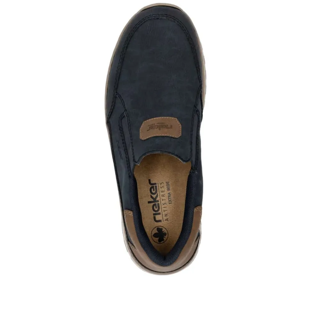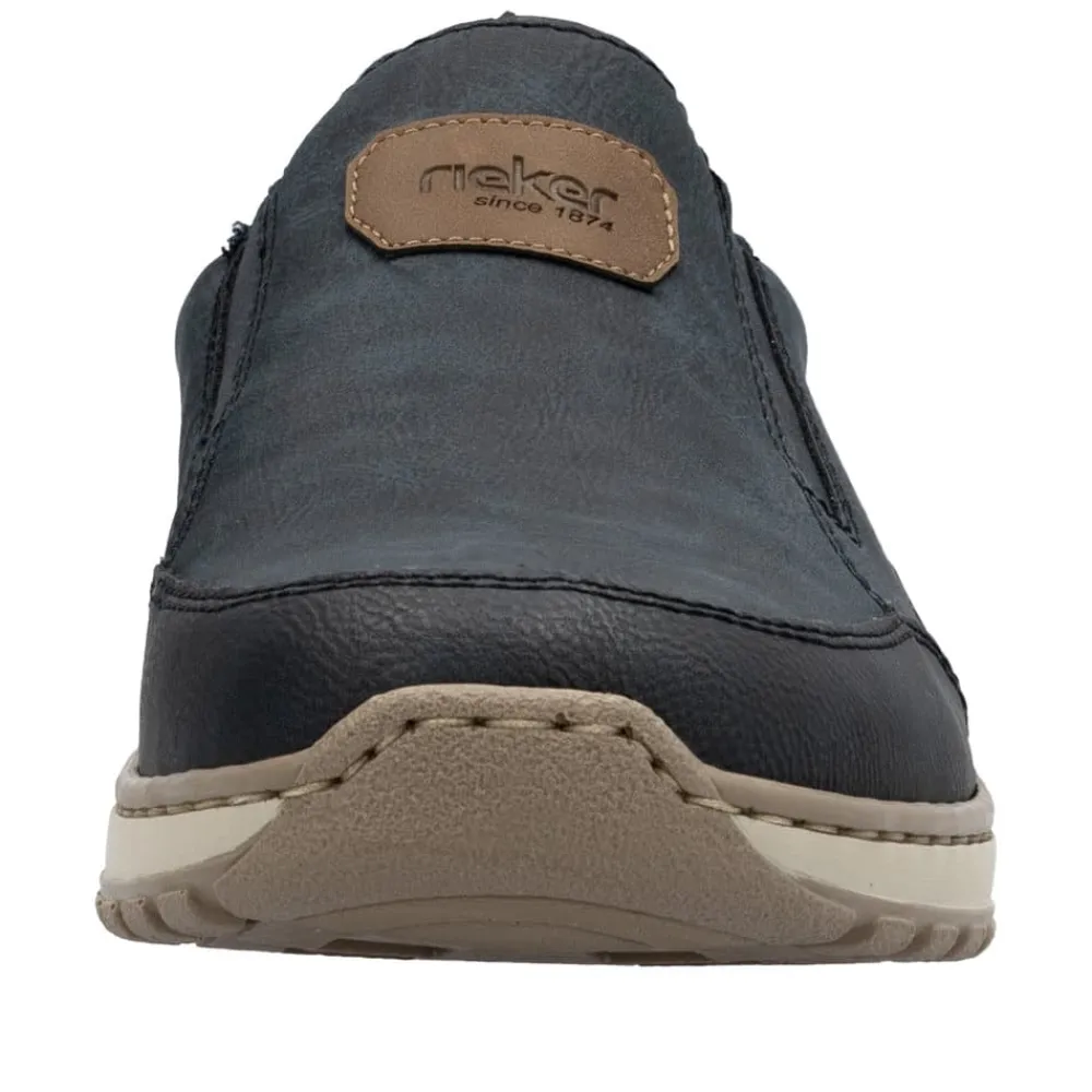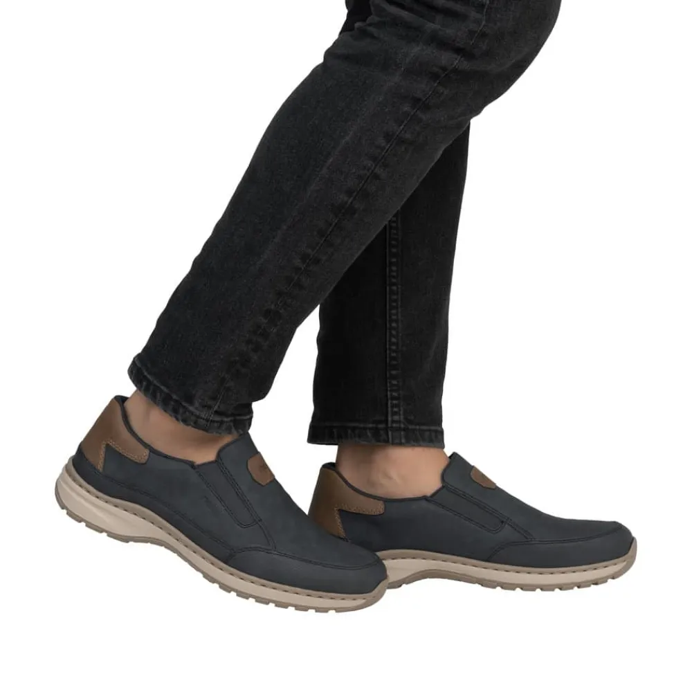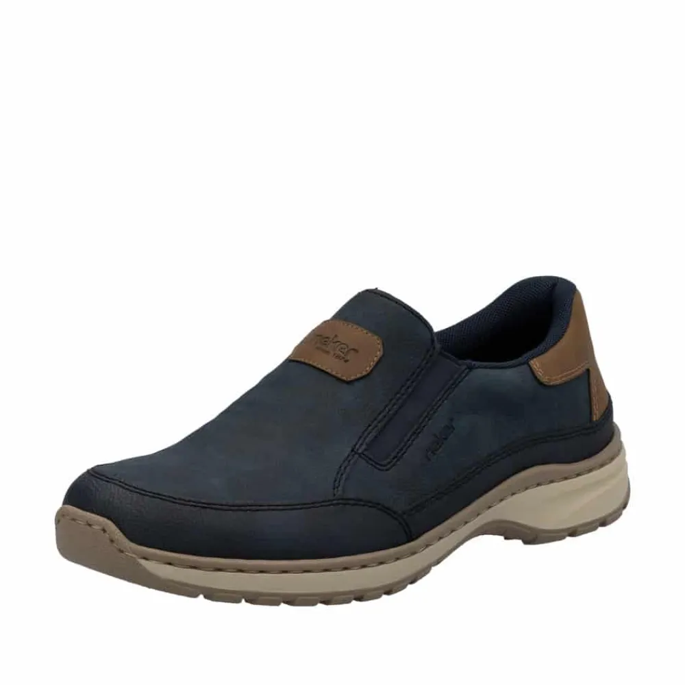 Rieker hyttesko til herre i blå. Disse blå Rieker hyttesko har den perfekte kombination stil og komfort. Den fleksible og slidstærke konstruktion giver en fremragende pasform, mens elastikken ved åbningen gør dem nemme at tage på og tilpasser sig foden. Den lette og stødabsorberende PU-sål sikrer en behagelig gang hele dagen, selv på lange ture. Den udtagelige indersål giver mulighed for personlig tilpasning, og den ekstra brede pasform (H) sørger for god plads til forfoden. En stilfuld og funktionel sko til enhver lejlighed.