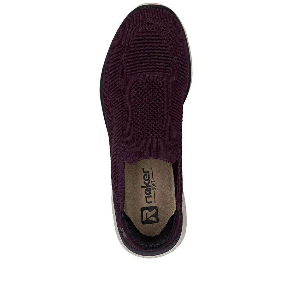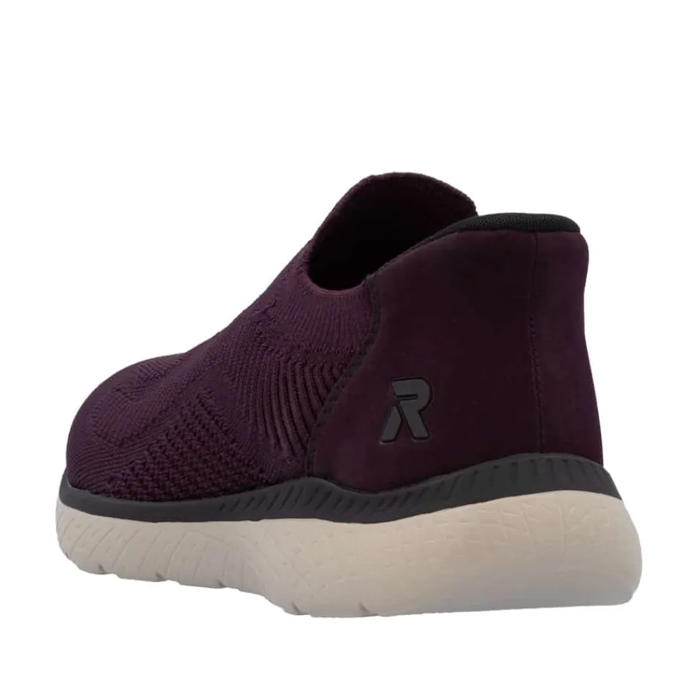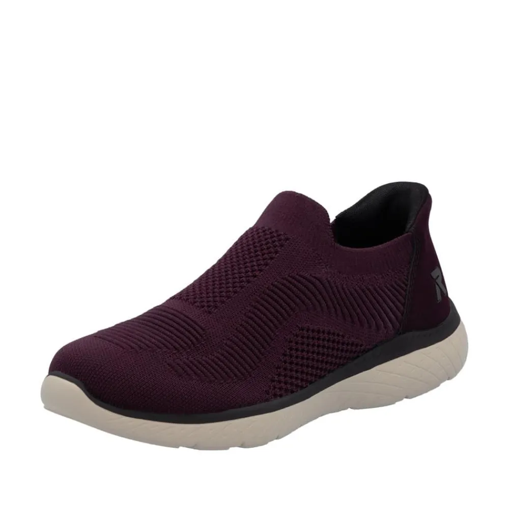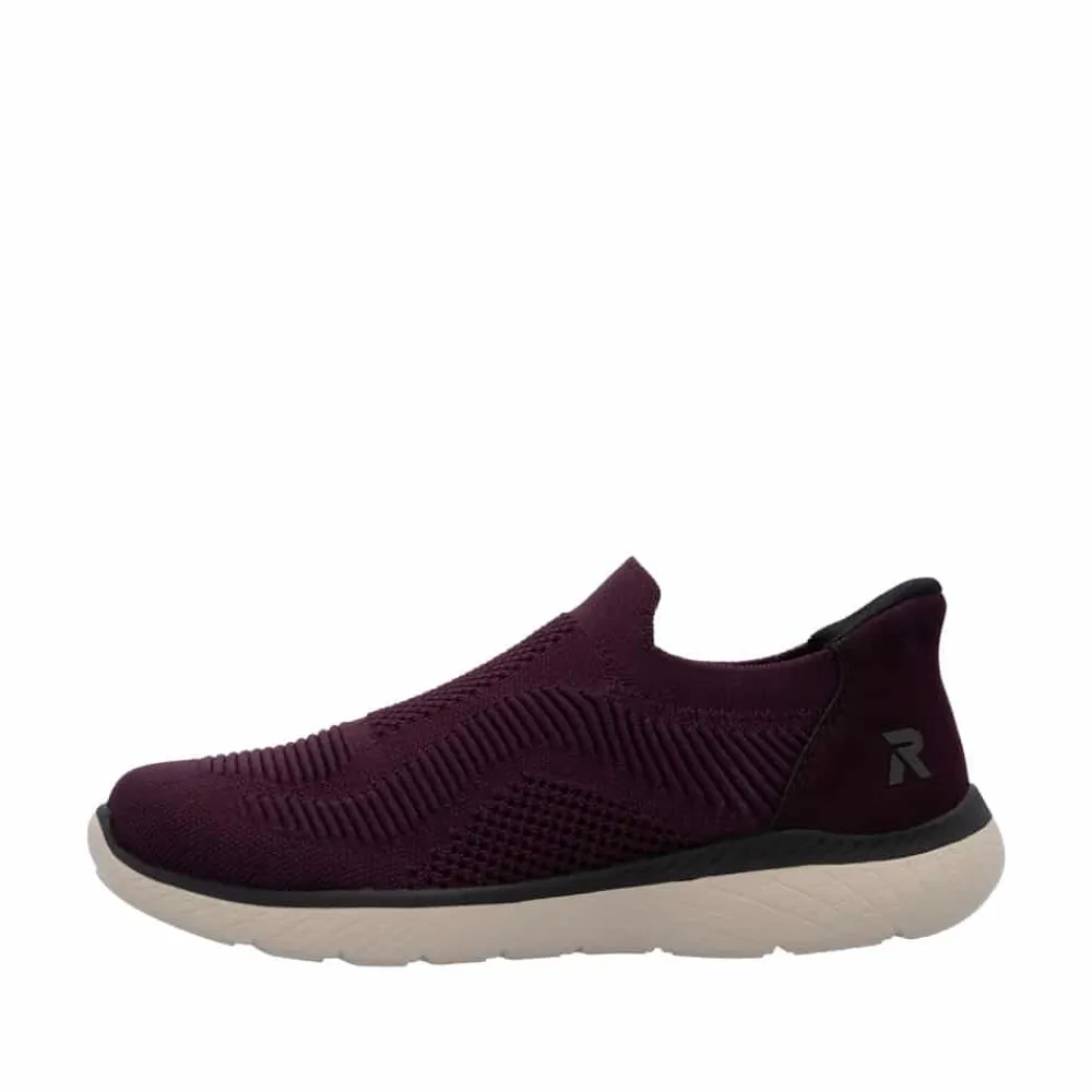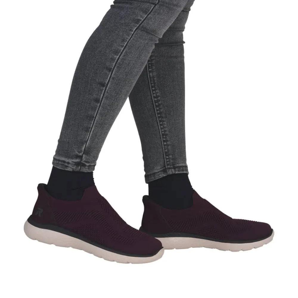 Rieker Ready 2 Go sko til dame i bordeaux. Denne sko er skabt til dig, der ønsker en praktisk løsning med høj komfort. Med Ready 2 Go teknologien og en fast hælkappe kan du tage skoen på uden brug af hænder. Rieker Antistress gør modellen let og fleksibel, så den føles behagelig, selv efter mange timers brug. Indvendigt finder du en memosoft-sål, som former sig efter foden og giver støtte hele dagen. Ydersålen er udstyret med et mønster, der både øger stødabsorbering og skridsikkerhed
