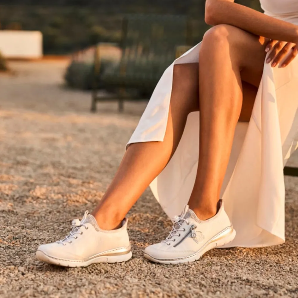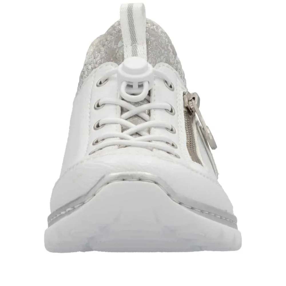 Rieker Ready 2 Go sneakers til dame i hvid. Med Ready2GO-teknologien kan du nemt træde i skoene uden at bøje dig ned eller bekymre dig om slid på hælkappen, hvilket gør dem til et praktisk og stilfuldt valg. Den ekstra bløde Memosoft-indlægssål former sig efter din fod for en skræddersyet komfort, der varer hele dagen. Overdelen er fremstillet i slidstærkt kunstlæder, mens den åndbare tekstilforing holder dine fødder friske og behagelige. Elastikbåndene gør det unødvendigt at binde snørebånd, hvilket gør dem perfekte til både hverdag og afslappede aktiviteter. Et ideelt valg for dig, der ønsker en kombination af funktionalitet og moderne design.