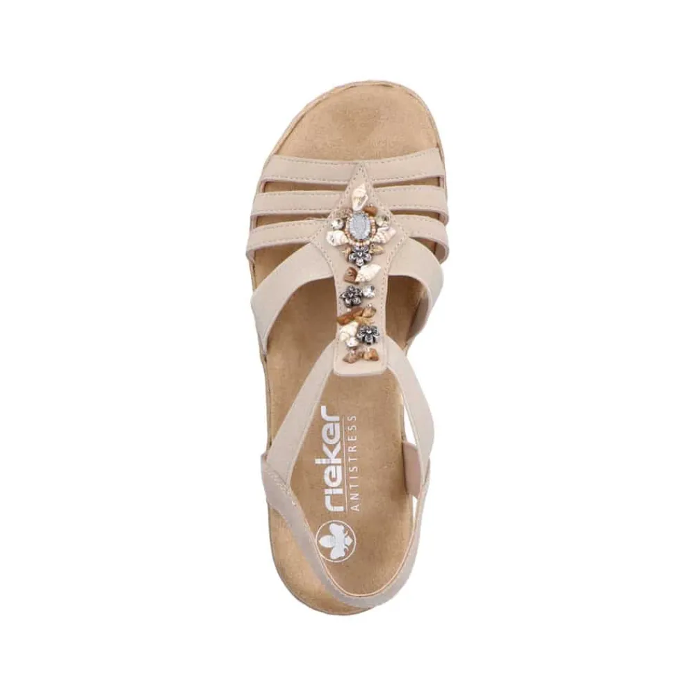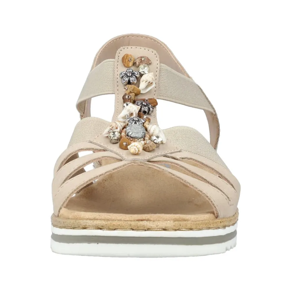 Rieker sandal til dame i beige/sand. Vælg Rieker kilesandalerne for at være et skridt foran! De cremefarvede sandaler skaber det perfekte statement og sætter et uforglemmeligt præg! Med en elastikindsats er de nemme at tage på og af. Den midterste rem, udsmykket med elegante detaljer, fuldender det moderne design til perfektion. En let og støddæmpende sål sikrer en behagelig gåoplevelse, mens den ekstra bløde indlægssål tilføjer en ekstra dosis komfort. Takket være den smalle E 1/2 pasform sidder sandalen behageligt tæt uden at stramme.