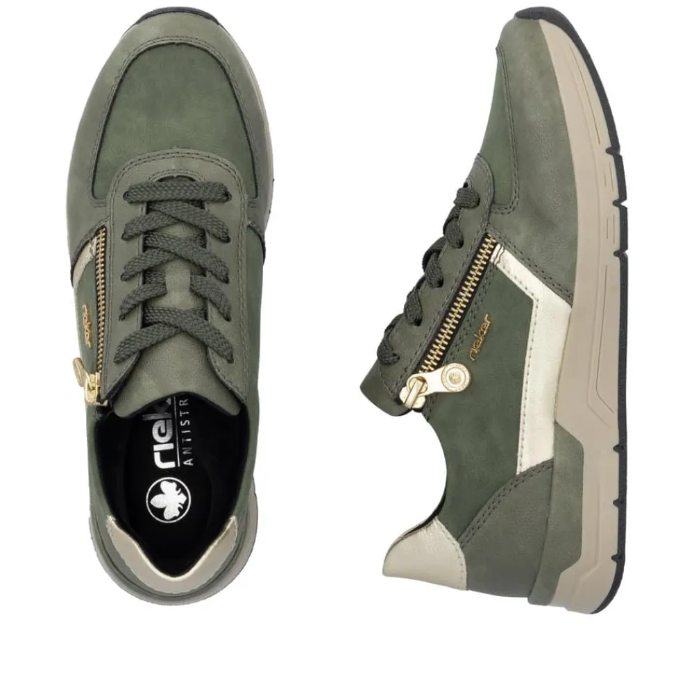 Rieker sneakers til dame i grøn. Let og fleksibel sneakers i en flot grøn farve med smarte detaljer, der giver et feminint udtryk. Skoene har både snørebånd og en lynlås i siden, så de er nemme at tage af og på. Indvendigt finder du en blød og udtagelig indersål, der giver komfort hele dagen. Den lette ydersål med Rieker Antistress-teknologi sikrer, at skoene er behagelige at bruge i hverdagen.