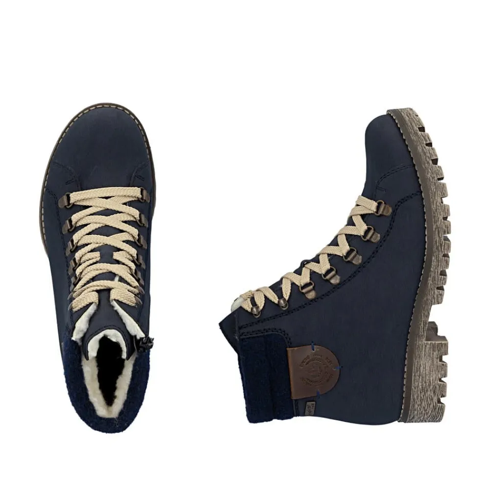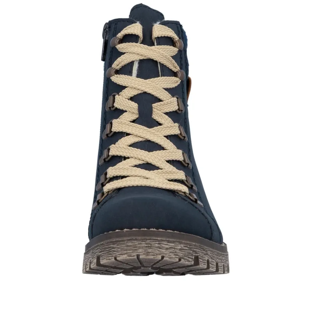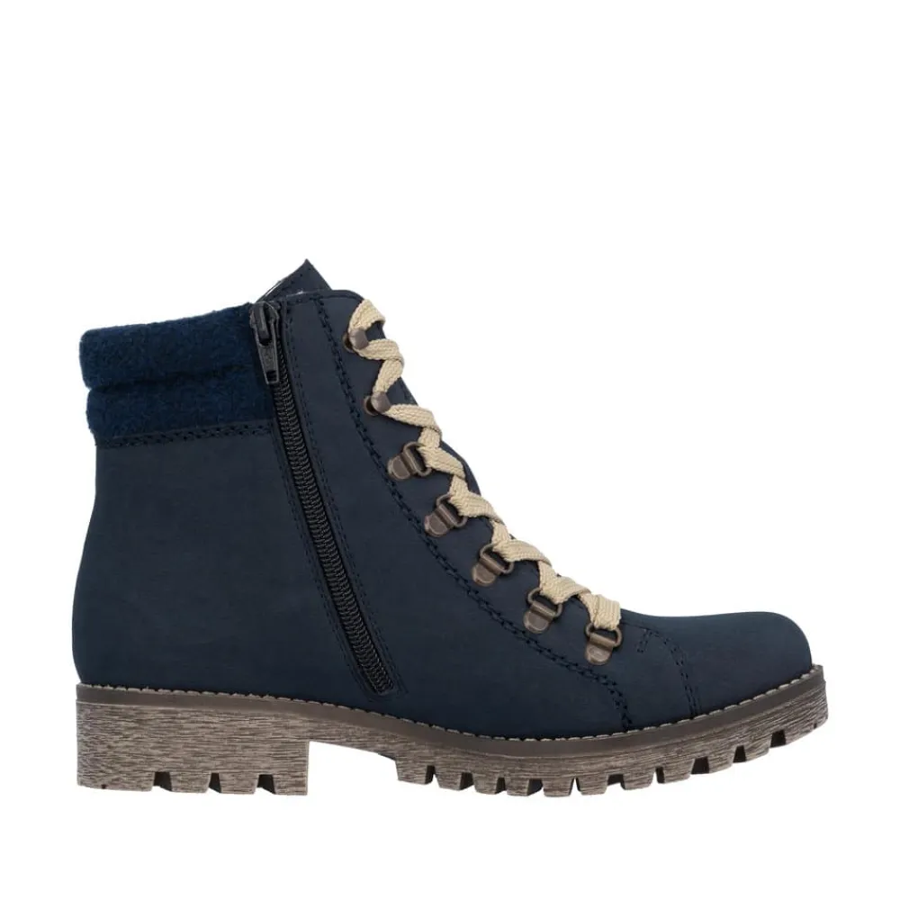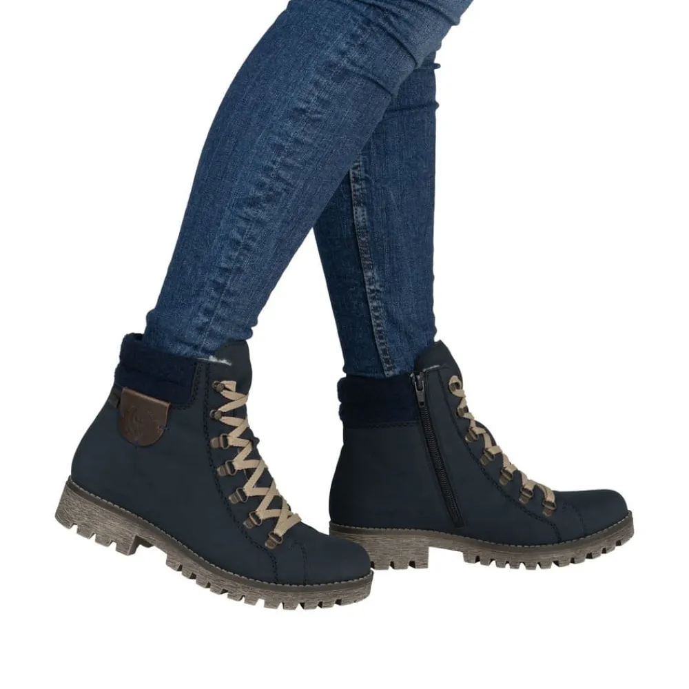 Rieker støvle til dame i blå. Populær vinterstøvle i mørkeblå med enkle detaljer, der giver et elegant og stilfuldt look. Støvlen er designet med snørebånd foran, så pasformen kan justeres, og en praktisk lynlås på siden, der gør den nem at tage på. Indvendigt sørger en varm foring for, at fødderne holdes lune, mens Rieker-Tex giver en kraftig vandafvisning. Den solide ydersål med mønster og stødabsorbering giver både støtte og øget skridsikkerhed på glatte underlag.