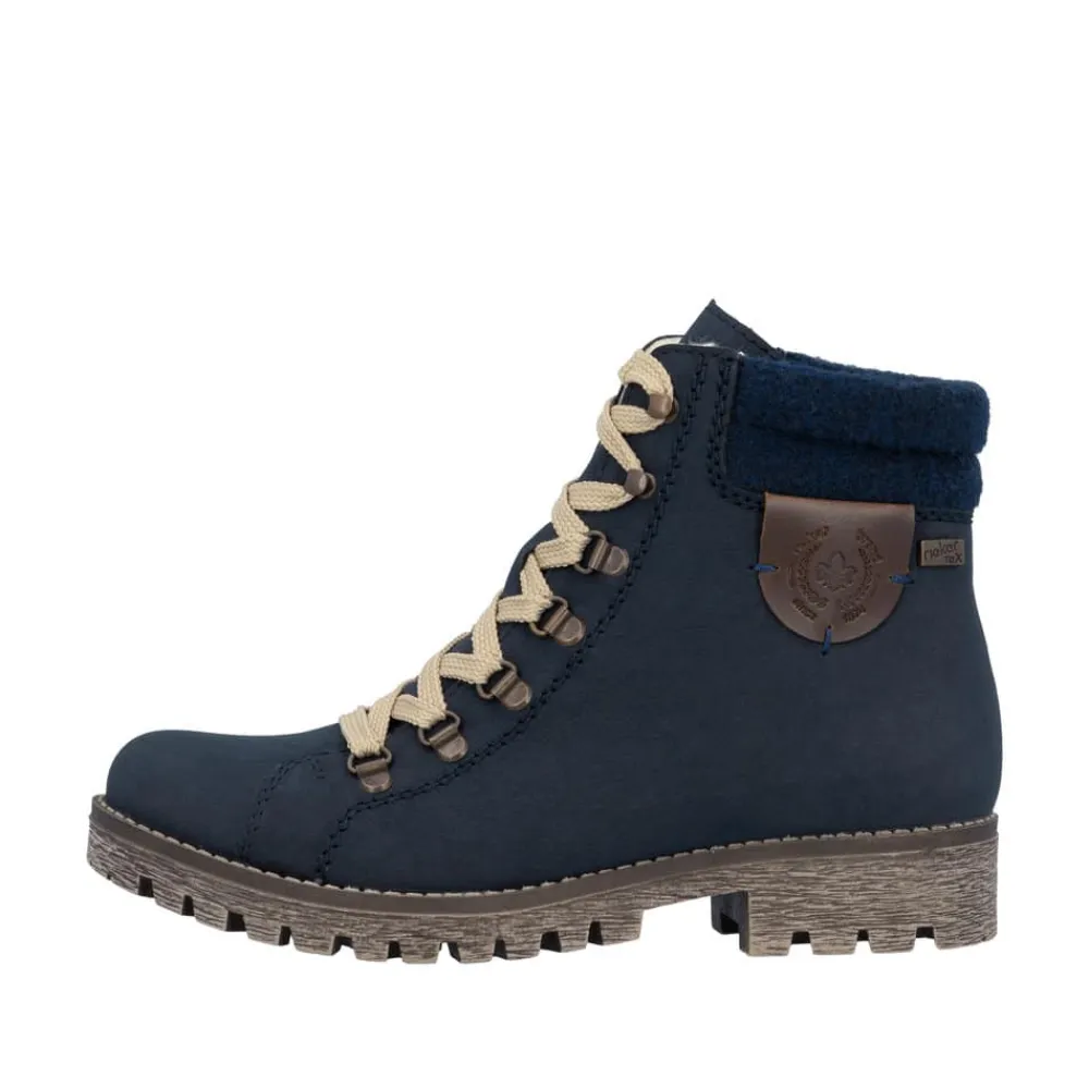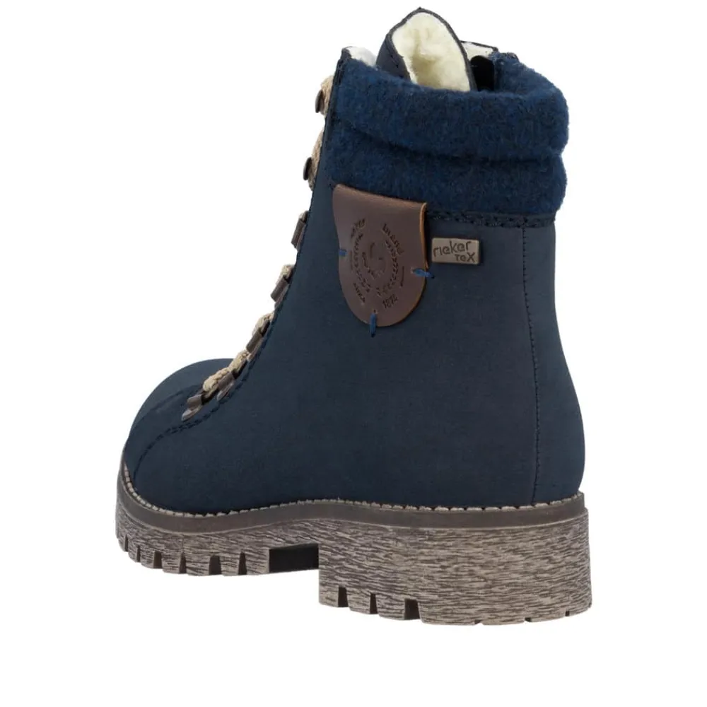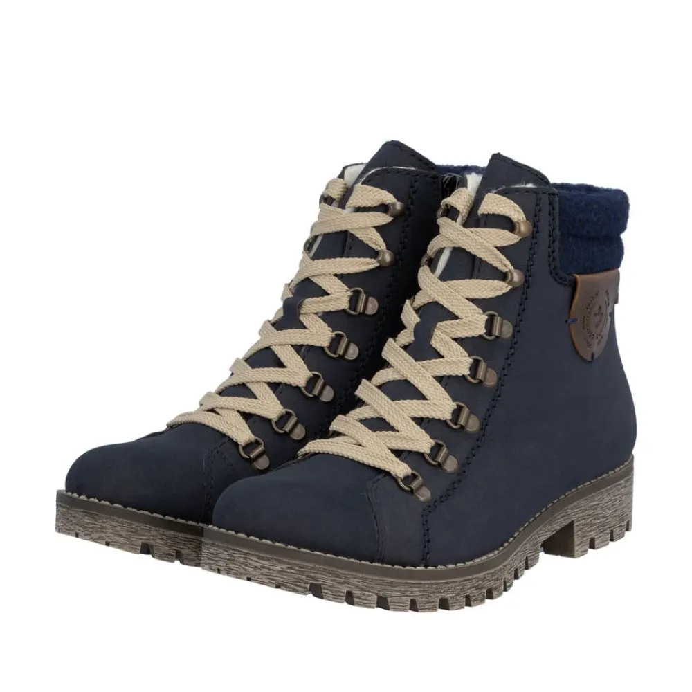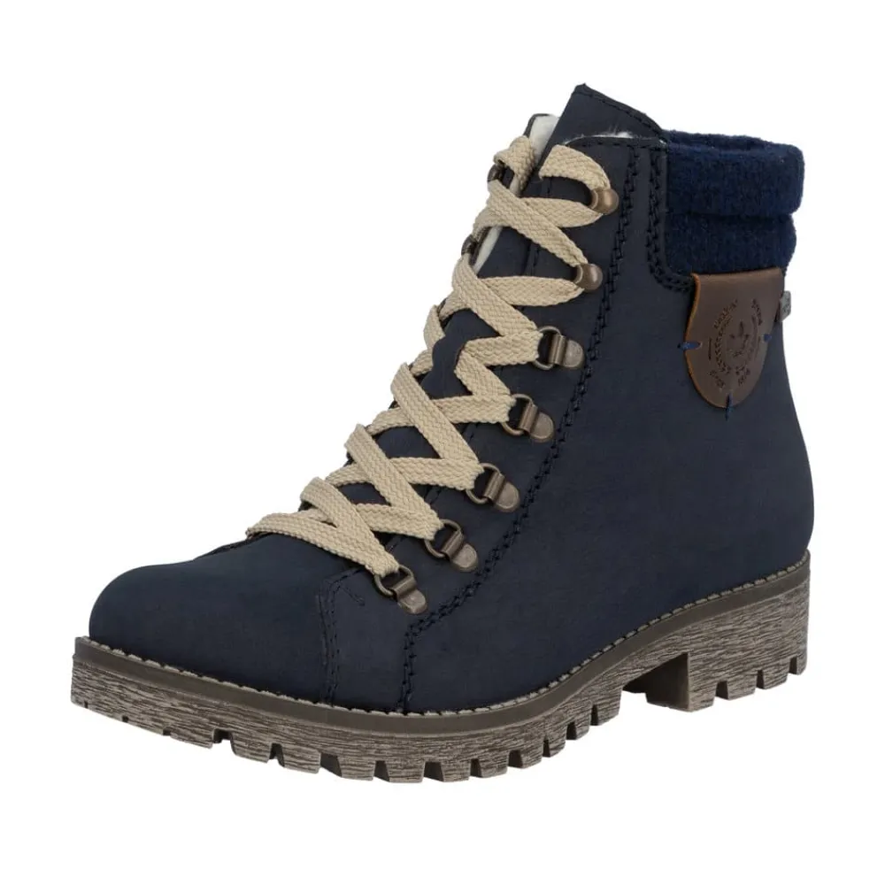 Rieker støvle til dame i blå. Populær vinterstøvle i mørkeblå med enkle detaljer, der giver et elegant og stilfuldt look. Støvlen er designet med snørebånd foran, så pasformen kan justeres, og en praktisk lynlås på siden, der gør den nem at tage på. Indvendigt sørger en varm foring for, at fødderne holdes lune, mens Rieker-Tex giver en kraftig vandafvisning. Den solide ydersål med mønster og stødabsorbering giver både støtte og øget skridsikkerhed på glatte underlag.