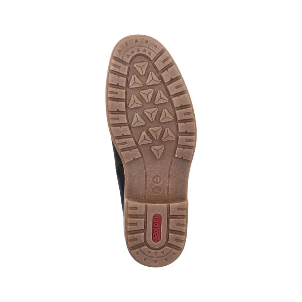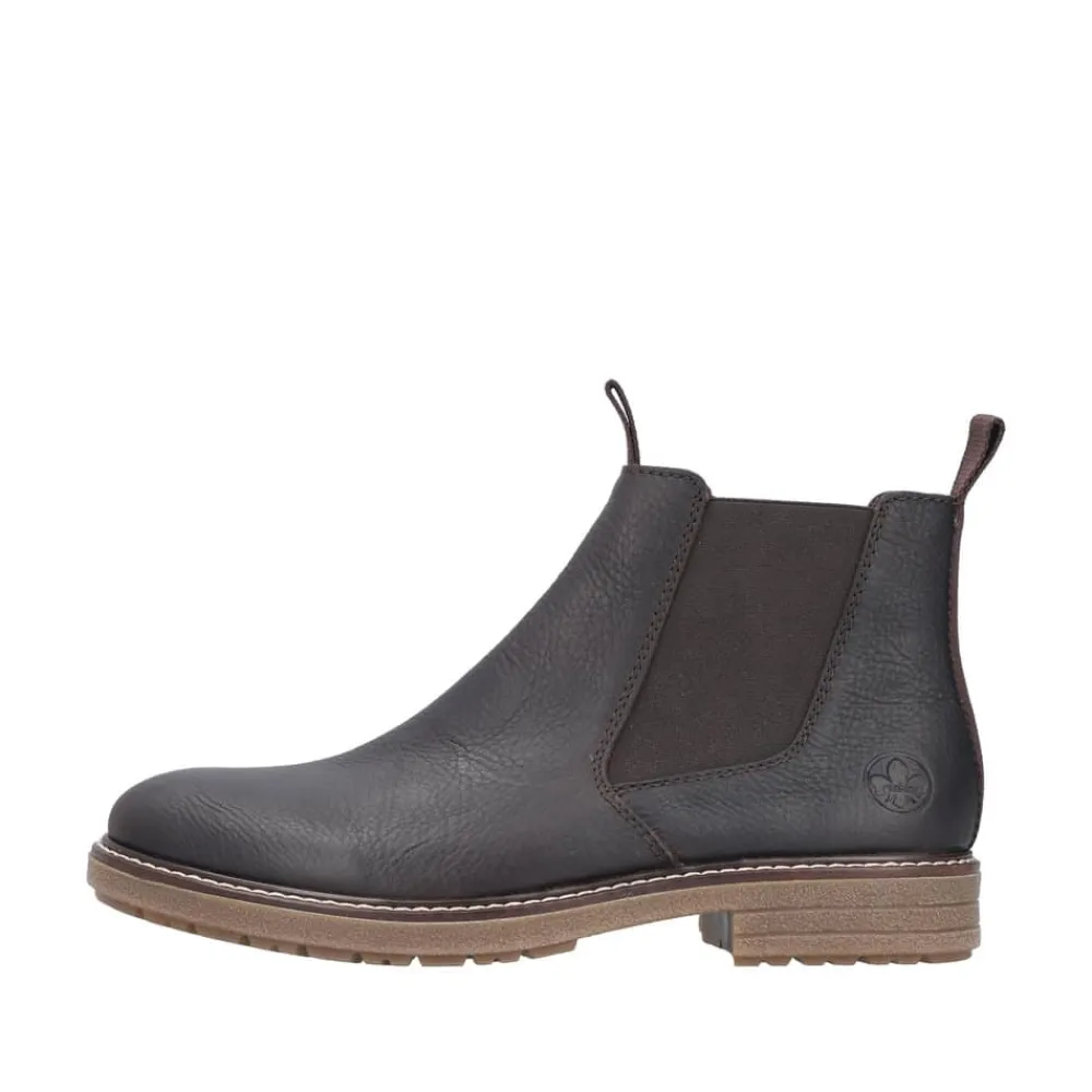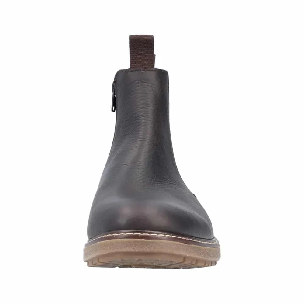 Rieker støvle til herre i mørkebrun. Flot støvle i skind, der kombinerer komfort med et klassisk look. Modellen er designet med lynlås på indersiden og elastik på ydersiden, så støvlen er nem at få af og på. Indvendigt er modellen udstyret med en blød sål og en let foring samt ekstra bredde (G), som giver foden rummelighed og fleksibilitet. Ydersålen har et godt mønster der øger stødabsorbering og skridsikkerhed.