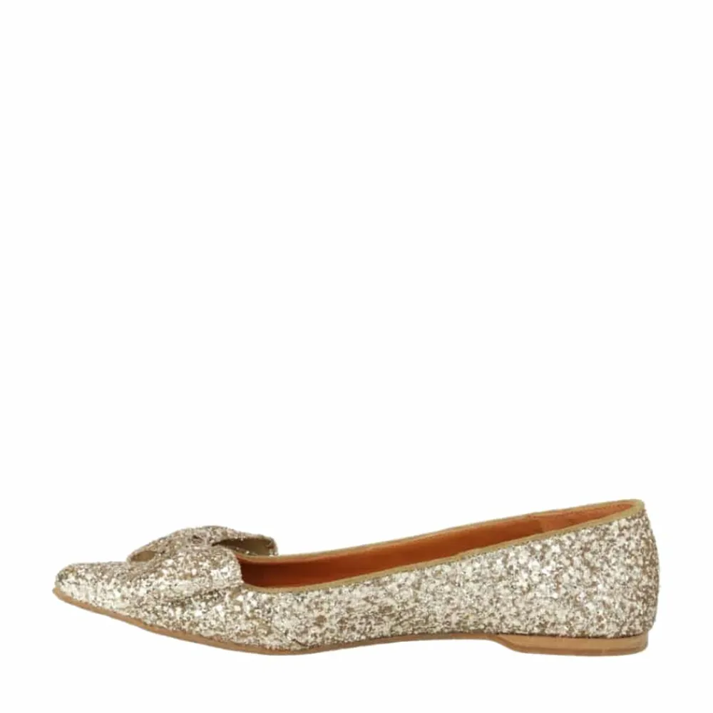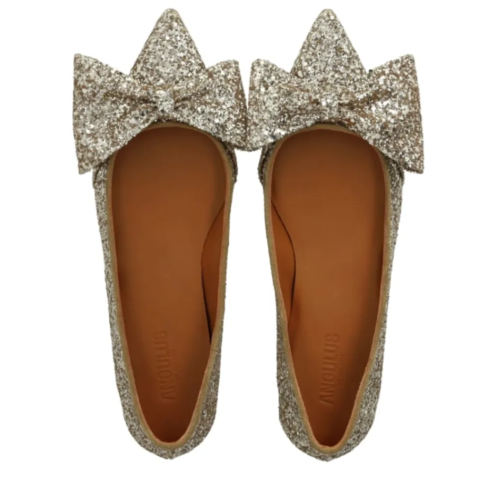Angulus ballerinasko til dame i guld glimmer. Denne smukke ballerinasko er fremstillet af 100% skind og forener elegant design med høj kvalitet. En fin sløjfedetalje og den spidse snude giver skoen et sofistikeret udtryk. Indersiden er udstyret med en skindindersål, der sikrer en behagelig og luksuriøs fornemmelse hele dagen. Den flade gummisål er let, blød og fleksibel, hvilket giver en optimal kombination af komfort og stil.