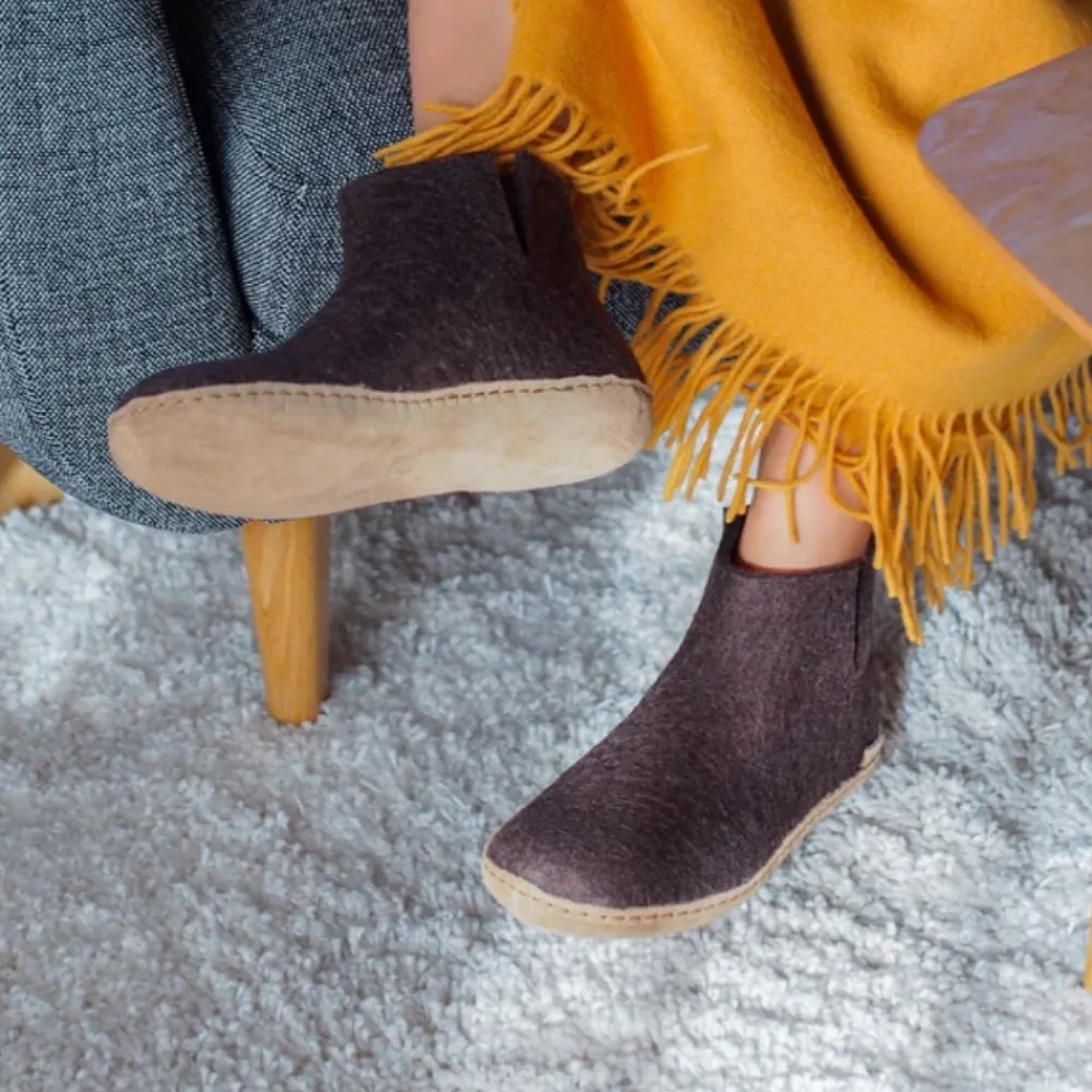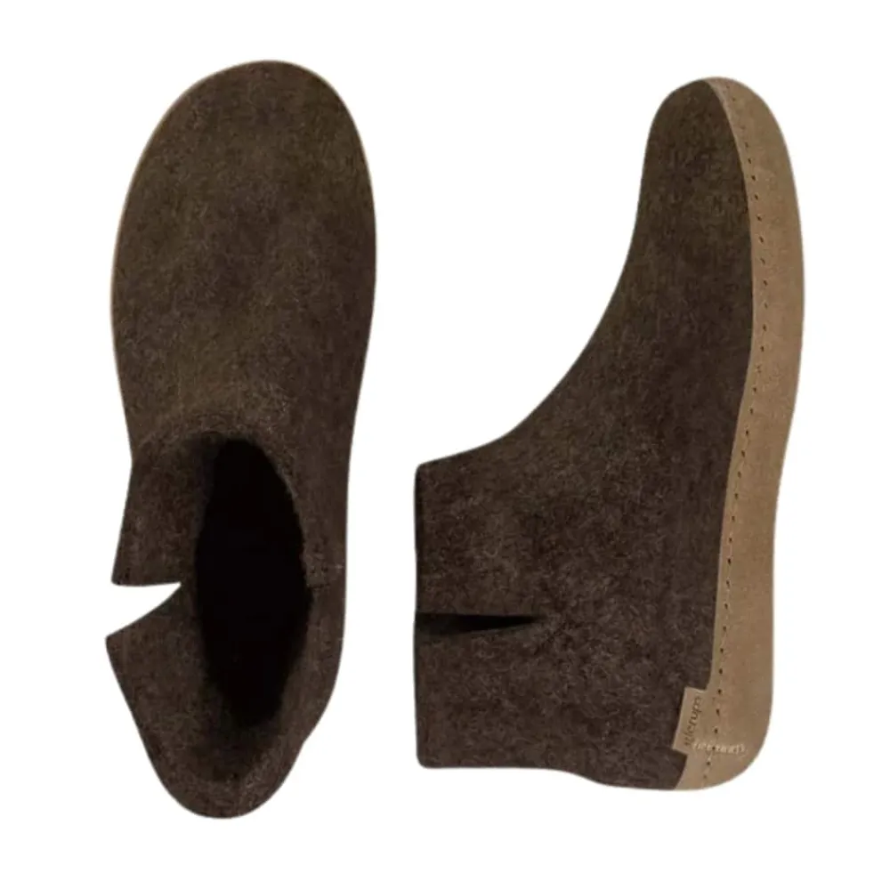 Glerups hjemmesko til dame og herre i brun. Denne hjemmesko er designet i 100% naturlig uld, som giver både komfort og varme. Det enkle ankeldesign sørger for en behagelig pasform, der omslutter foden og giver optimal støtte. Hjemmeskoen er fleksibel og tilpasser sig fodens naturlige bevægelser, mens uldens egenskaber holder fødderne varme. Ydersålen er fremstillet i kalveskind, hvilket giver en naturlig holdbarhed.