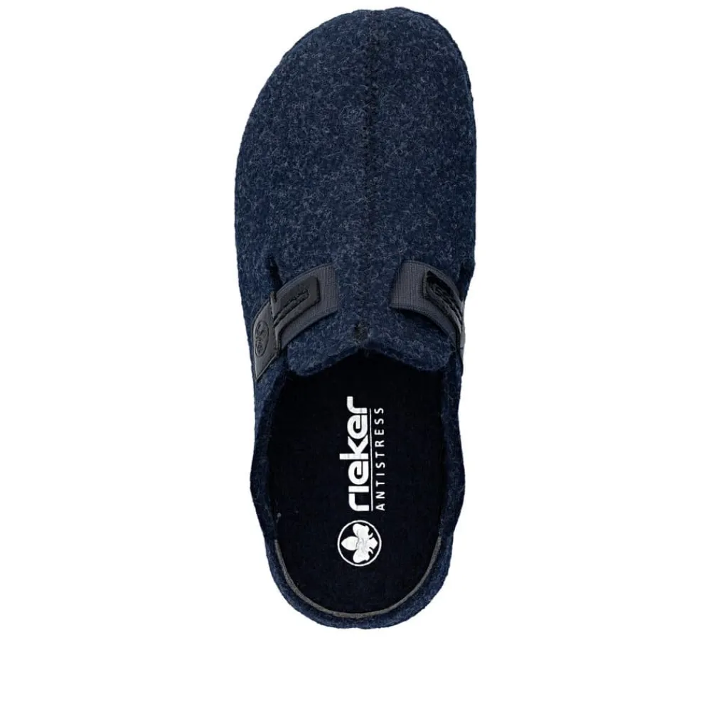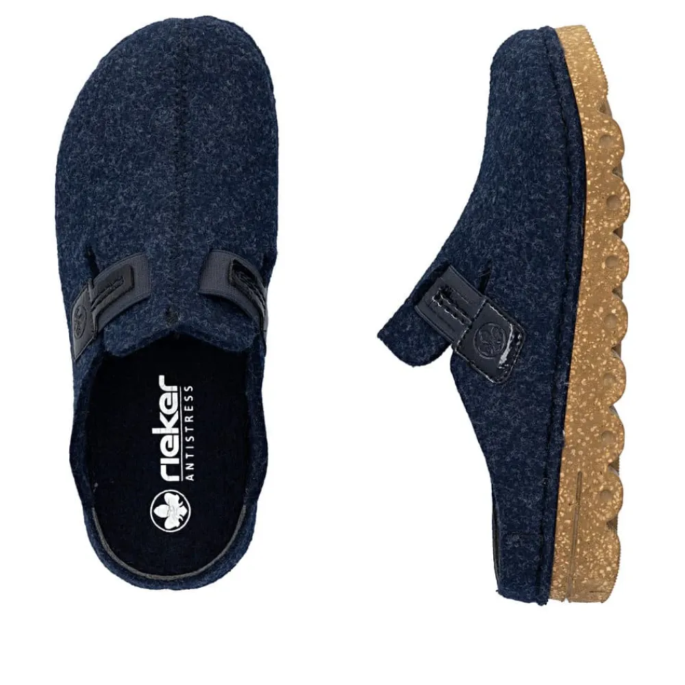 Rieker hjemmesko til dame i blå. Praktisk og komfortabel hjemmesko i filt materiale, der holder fødderne varme. Modellen har elastik, som sikrer en god pasform, og den er uden hælkappe, hvilket gør hjemmeskoen nem at komme i og af. Indvendigt finder du en blød sål, der giver behagelig komfort, mens kork ydersålen med mønster giver øget skridsikkerhed.