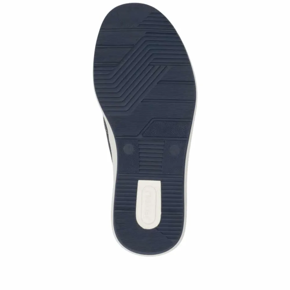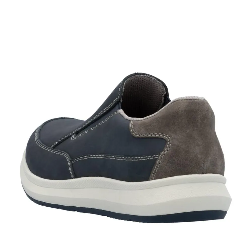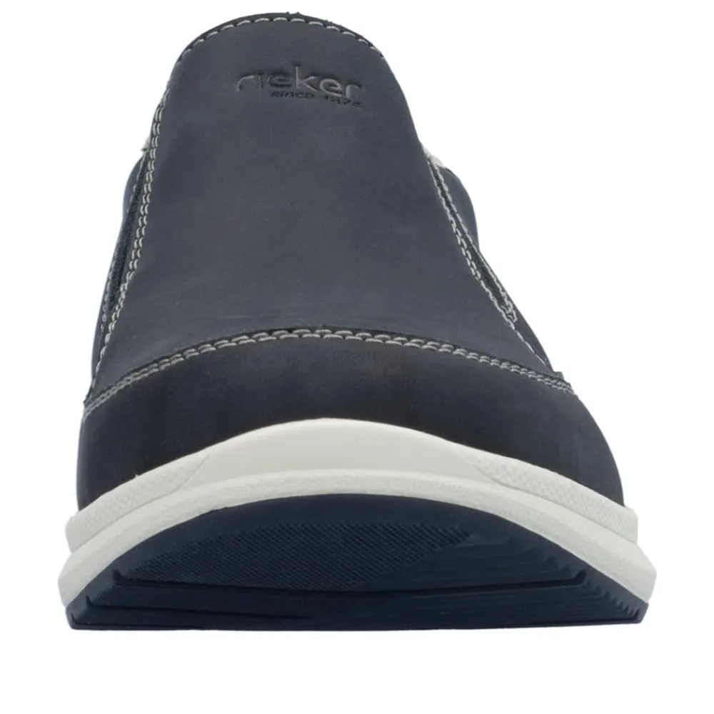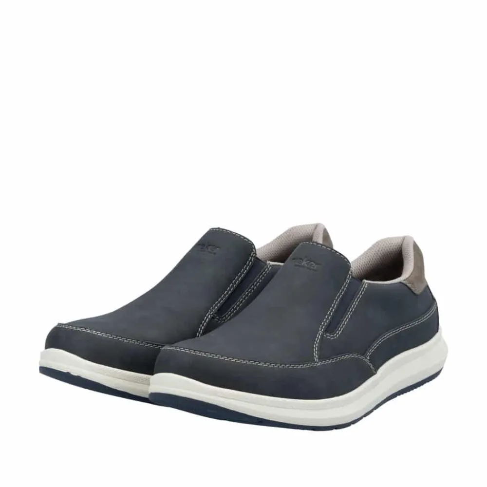Rieker hyttesko til herre i blå. Denne klassiske hyttesko fra Rieker kombinerer stil og komfort i én sko. Med en overdel i ægte skind og elastiske sider er den nem at tage på og af. Den ekstra vidde H giver mere plads til brede fødder, hvilket sikrer en behagelig pasform hele dagen. Rieker Antistress-teknologien og den stødabsorberende sål reducerer belastningen på fødderne, mens den udtagelige bløde indlægssål giver ekstra komfort. Perfekt til både hverdagsbrug og mere afslappede anledninger.