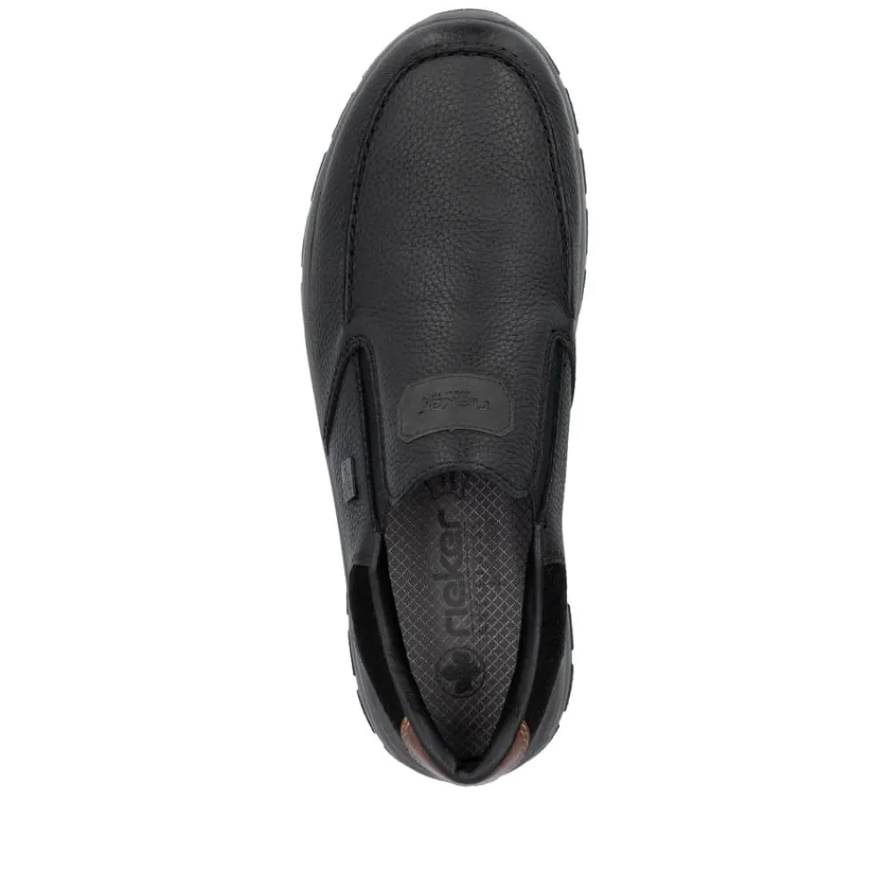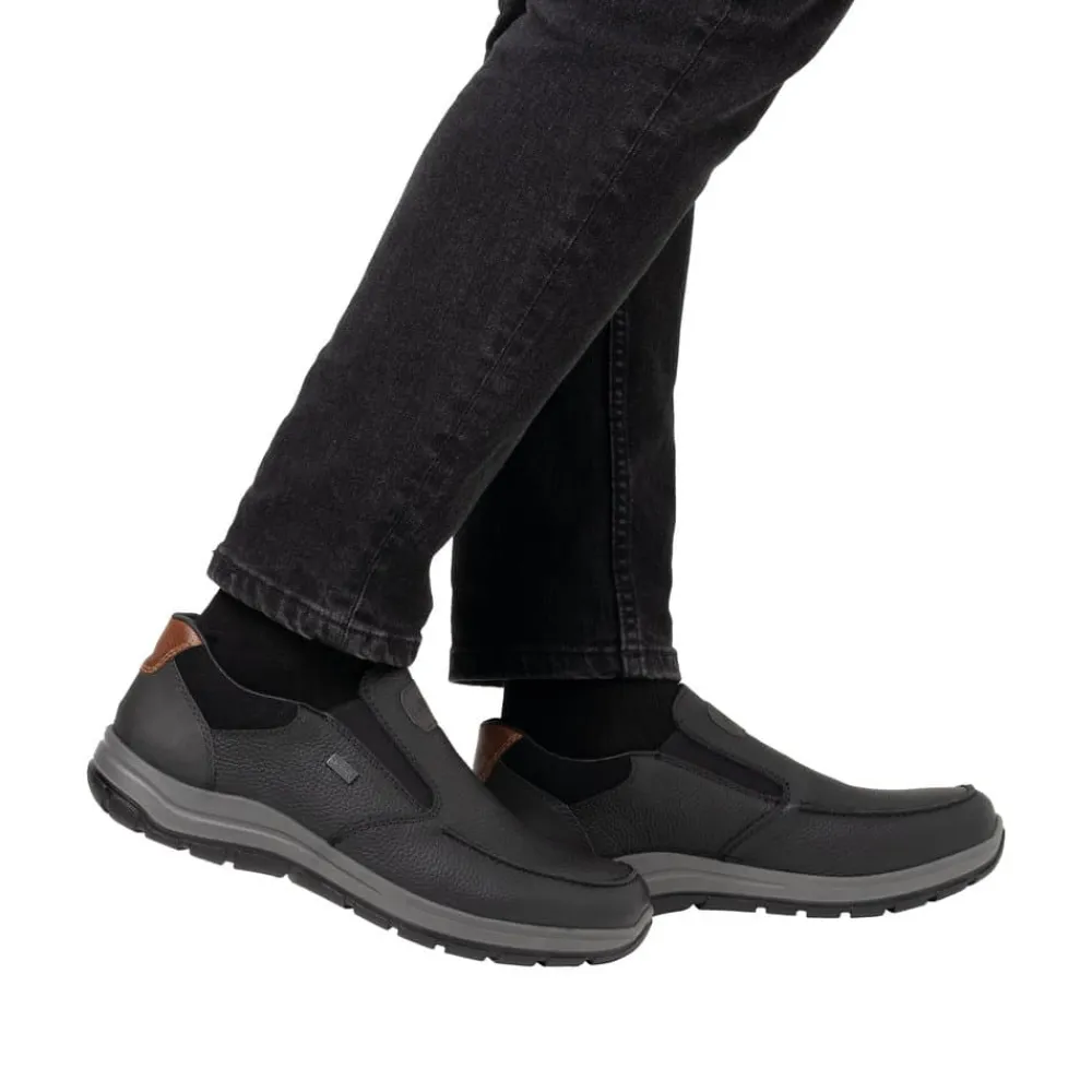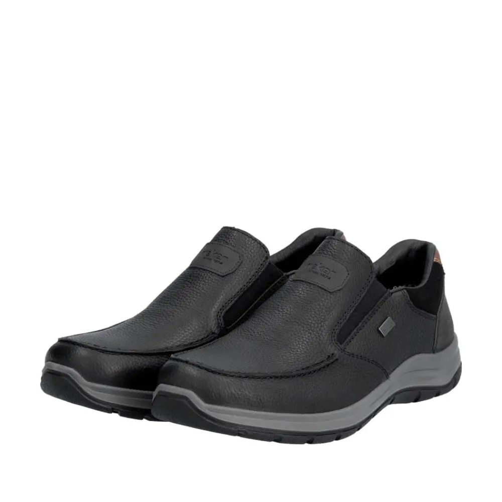 Rieker hyttesko til herre i sort. Elegant og praktisk hyttesko med en sort skindoverdel, der løfter kvaliteten og udseendet på skoen. De to elastikker gør det let at tage skoen af og på, hvilket sikrer en hurtig og nem pasform. Skoen har flotte detaljer som Rieker logoet foran og brune detaljer bagpå, der giver et stilfuldt touch. Udstyret med Rieker-Tex er modellen vandafvisende, så dine fødder holdes tørre i al slags vejr. Indersålen er blød og kan tages ud, mens den ekstra vidde sikrer optimal komfort hele dagen. Den solide ydersål har et godt mønster, der giver ekstra skridsikkerhed og støtte, sammen med Rieker Antistress-teknologien.