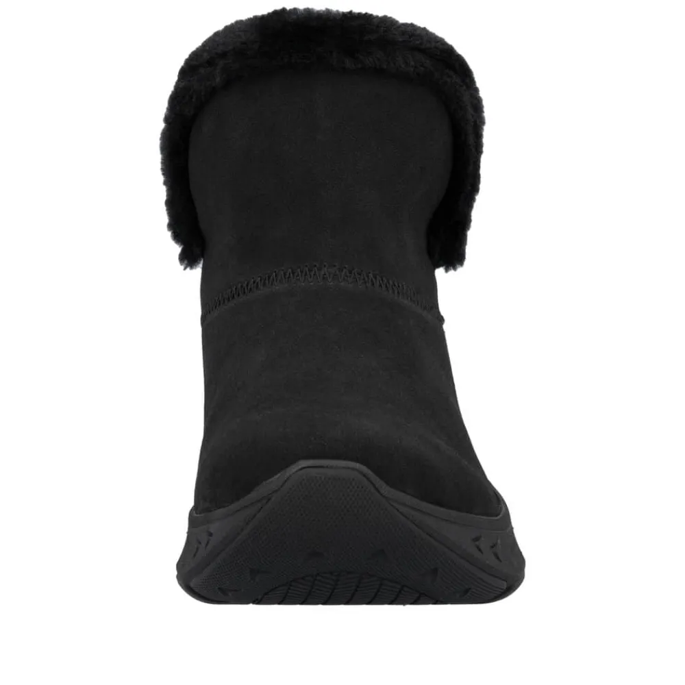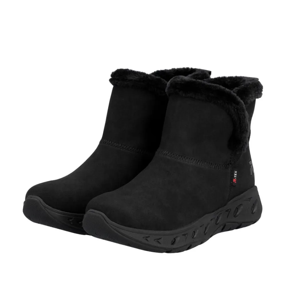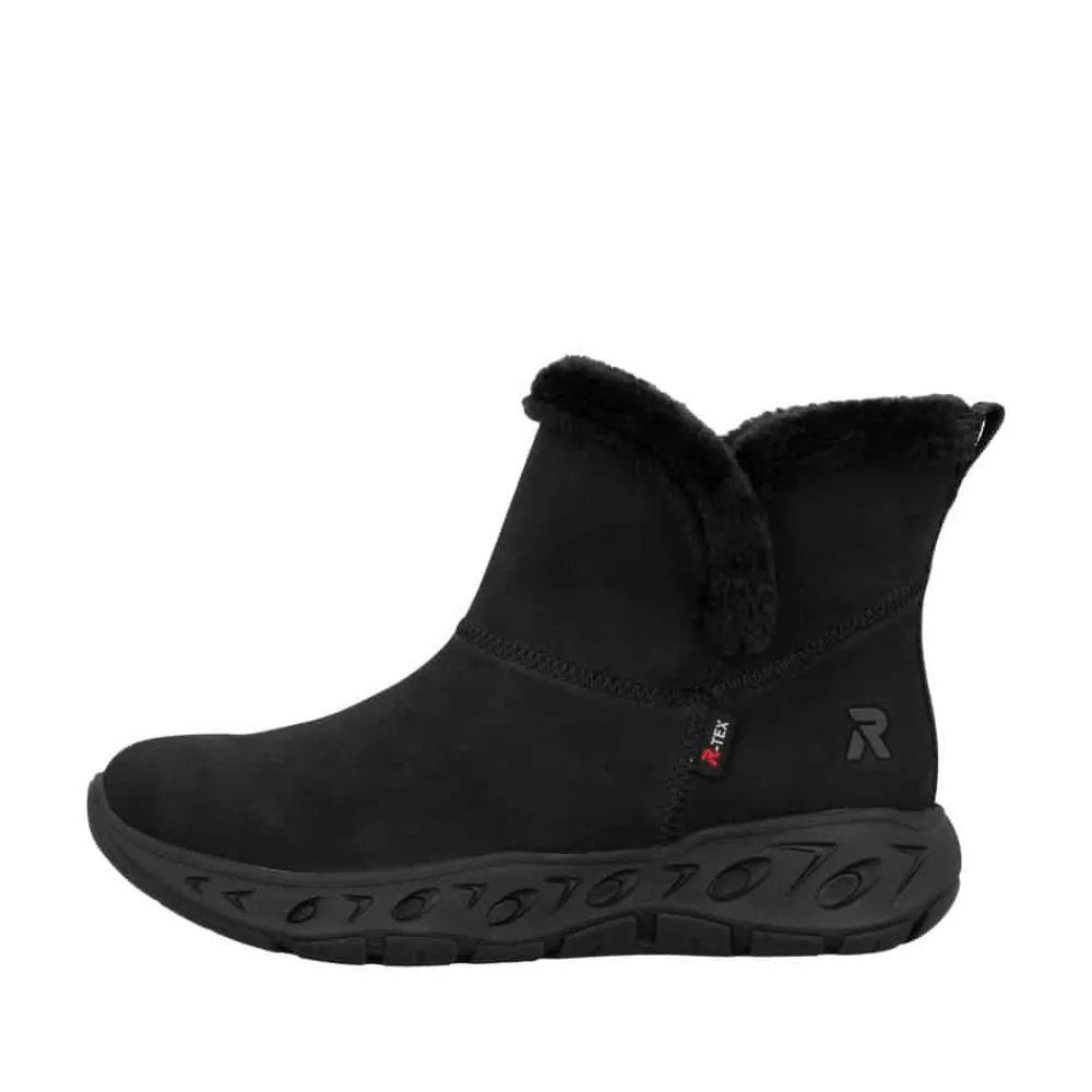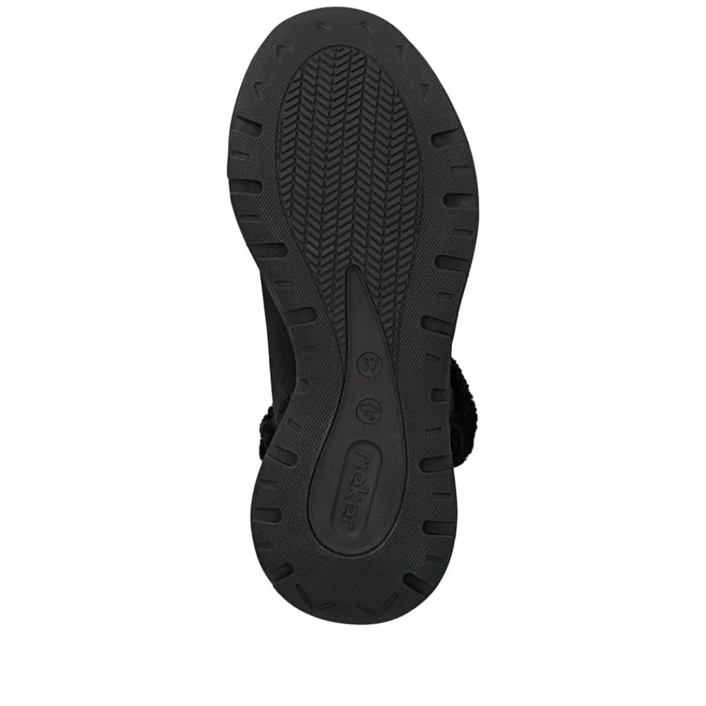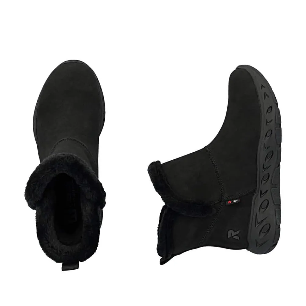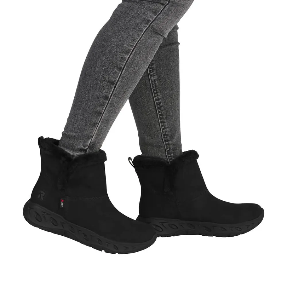 Rieker Ready 2 Go støvle til dame i sort. Smart sort støvle, der på bedste vis kombinerer stil og funktionalitet. Med Ready 2 Go teknologi og en fast hælkappe kan du tage støvlen på uden brug af hænder, hvilket gør støvlen både praktisk og nem i hverdagen. Indvendigt sørger den varme foring og den bløde Memosoft sål for en behagelig komfort hele dagen. Støvlen er desuden udstyret med Rieker-Tex, som gør støvlen kraftig vandafvisende, mens den mønstrede ydersål giver øget stødabsorbering og skridsikkerhed.