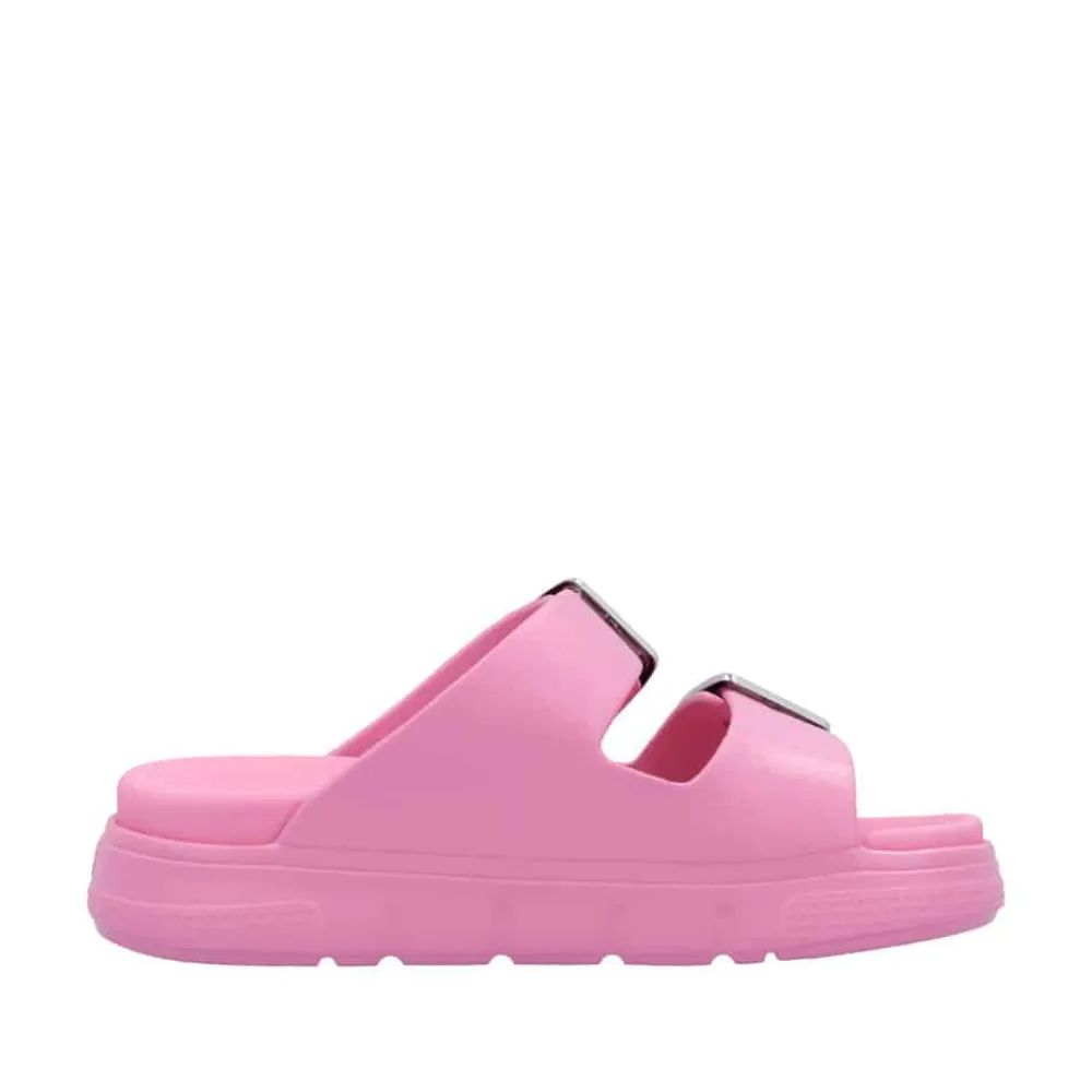 Rieker sandal til dame i pink. Denne moderne sandal i en frisk pink farve kombinerer klassisk design med funktionel komfort. De to justerbare spænder gør det nemt at tilpasse pasformen, mens slip-in funktionen sikrer, at du hurtigt kan tage sandalen af og på. Den bløde indersål giver en behagelig følelse hele dagen, og den chunky EVA-ydersål på 4,5 cm sørger for god støtte. Med stødabsorberende egenskaber og en mønstret sål får du både komfort og skridsikkerhed i ét stilfuldt design.