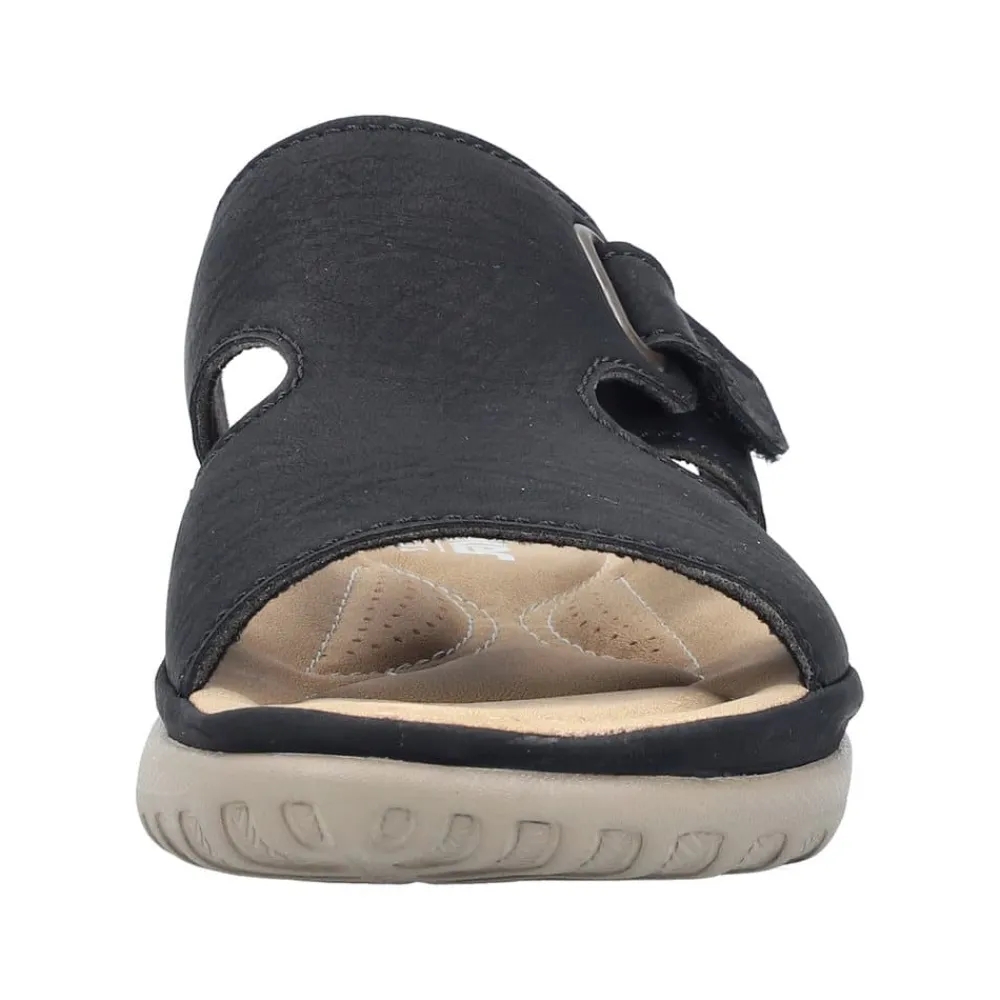 Rieker sandal til dame i sort. Elegant og let sandal i sort, designet med et klassisk og moderne udtryk. Sandalen har en rem over forfoden med to huller i siden, der sikrer god ventilation og komfort. Slip-in funktionen gør den nem at tage på, mens en justerbar velcrorem sikrer en perfekt pasform. Indvendigt forkæler en blød indersål dine fødder med ekstra komfort hele dagen. Den robuste ydersål med skridsikkert mønster og stødabsorbering giver både stabilitet og støtte.