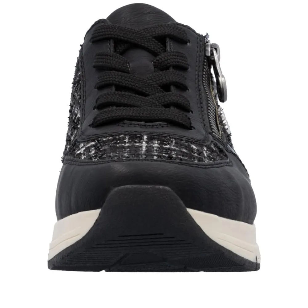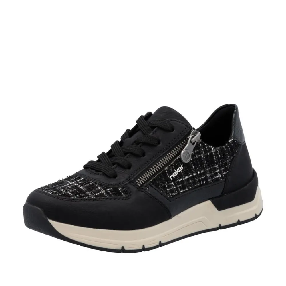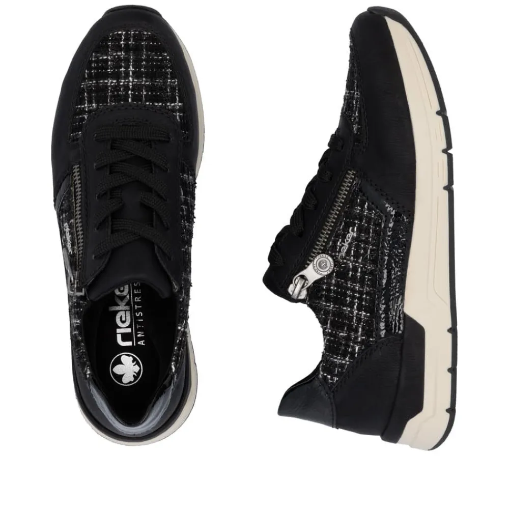 Rieker sneakers til dame i sort. Moderne sneakers i en flot sort farve med fede detaljer der giver et feminint look. Skoene har både snørebånd og en praktisk lynlås i siden, så de er nemme at tage af og på. Indvendigt bliver du mødt af en blød og udtagelig indersål, der sikrer komfort hele dagen. Den lette og fleksible ydersål med Rieker Antistress-teknologi gør skoene ideelle til hverdagens aktiviteter.