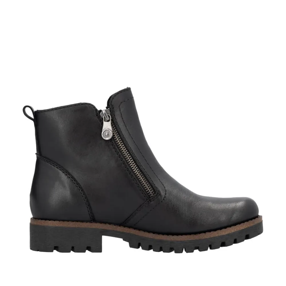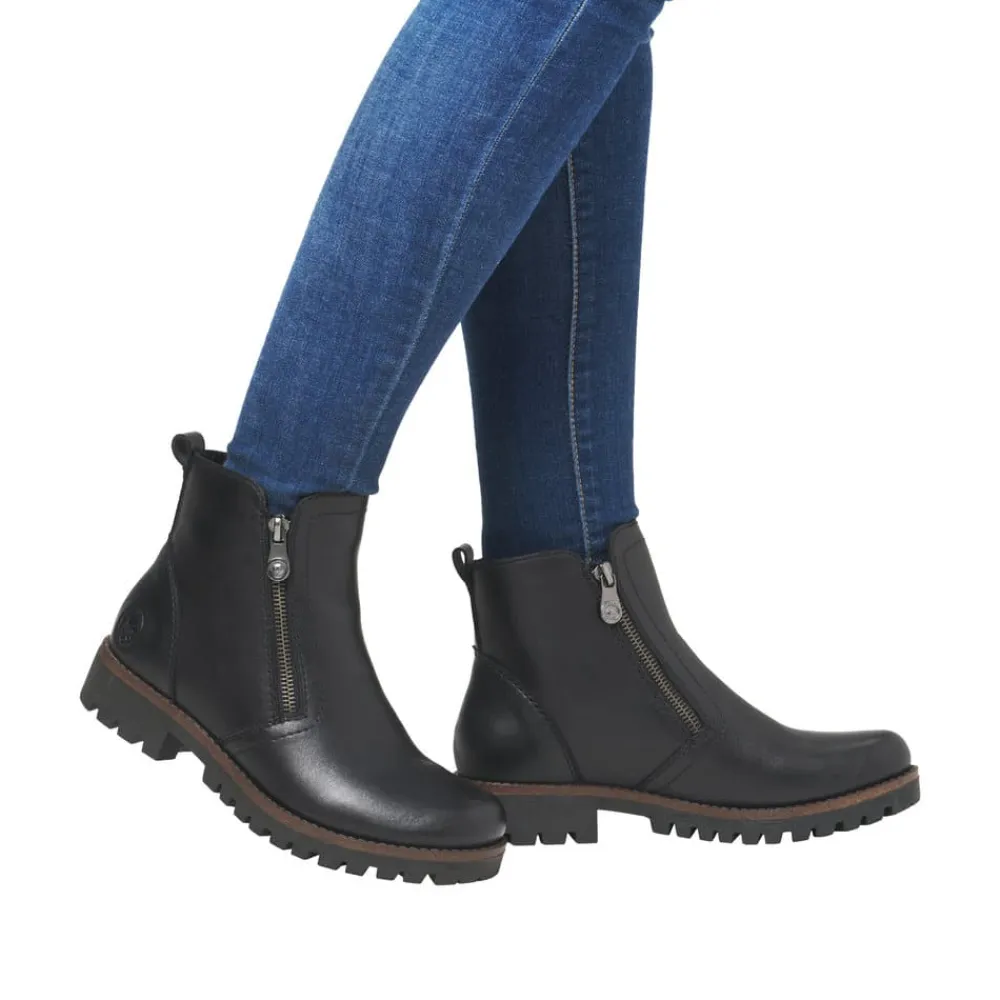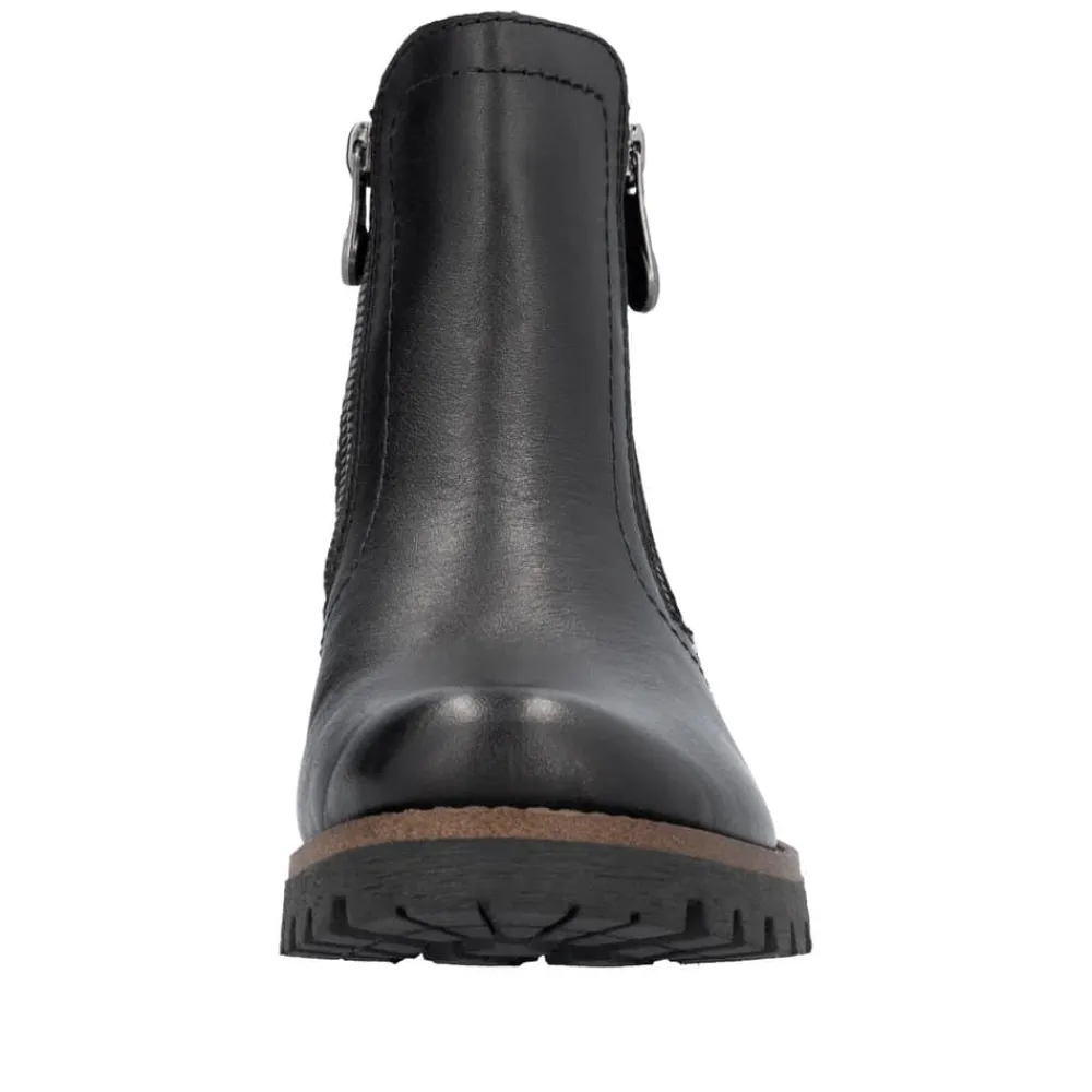 Rieker støvle til dame i sort. Stilfuld sort støvle med et klassisk udtryk og en blød skindoverdel. De to funktionelle lynlåse gør det let at komme i og af støvlen, og indvendigt sørger den lette foring og den bløde indersål for høj komfort. De stødabsorberende egenskaber giver god komfort, mens ydersålen med mønster bidrager til støtte og øget skridsikkerhed i hverdagen.