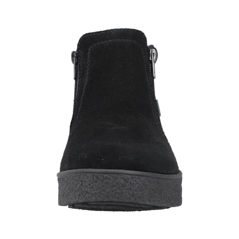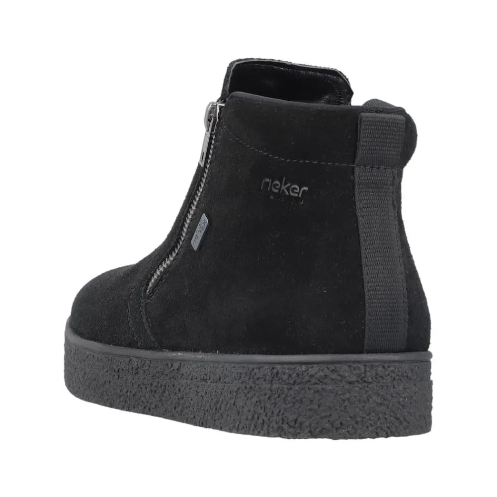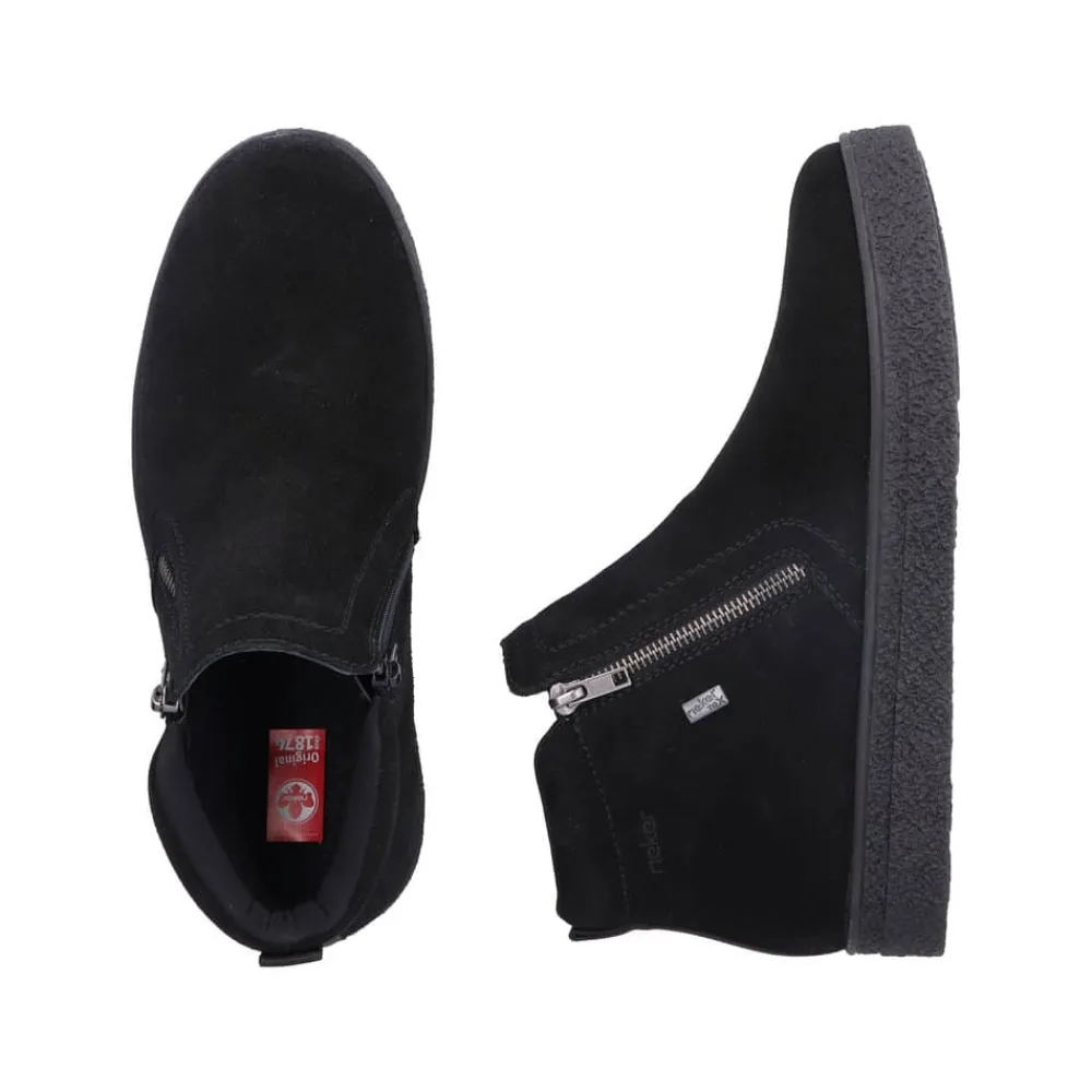 Rieker støvle til herre i sort. Disse sorte herrestøvler i ruskind har den perfekte kombination af komfort, funktion og stil. En praktisk lynlås på indersiden gør dem lette at tage af og på, mens den lette og stødabsorberende sål, sikrer komfort og stabilitet ved hvert skridt. Den bløde indersål og rummelige pasform med en bredde på H, sikrer optimal komfort dagen lang. Fødderne holdes varme takket være det bløde og varme uldforing, og Rieker-Tex giver kraftig vandafvisning.