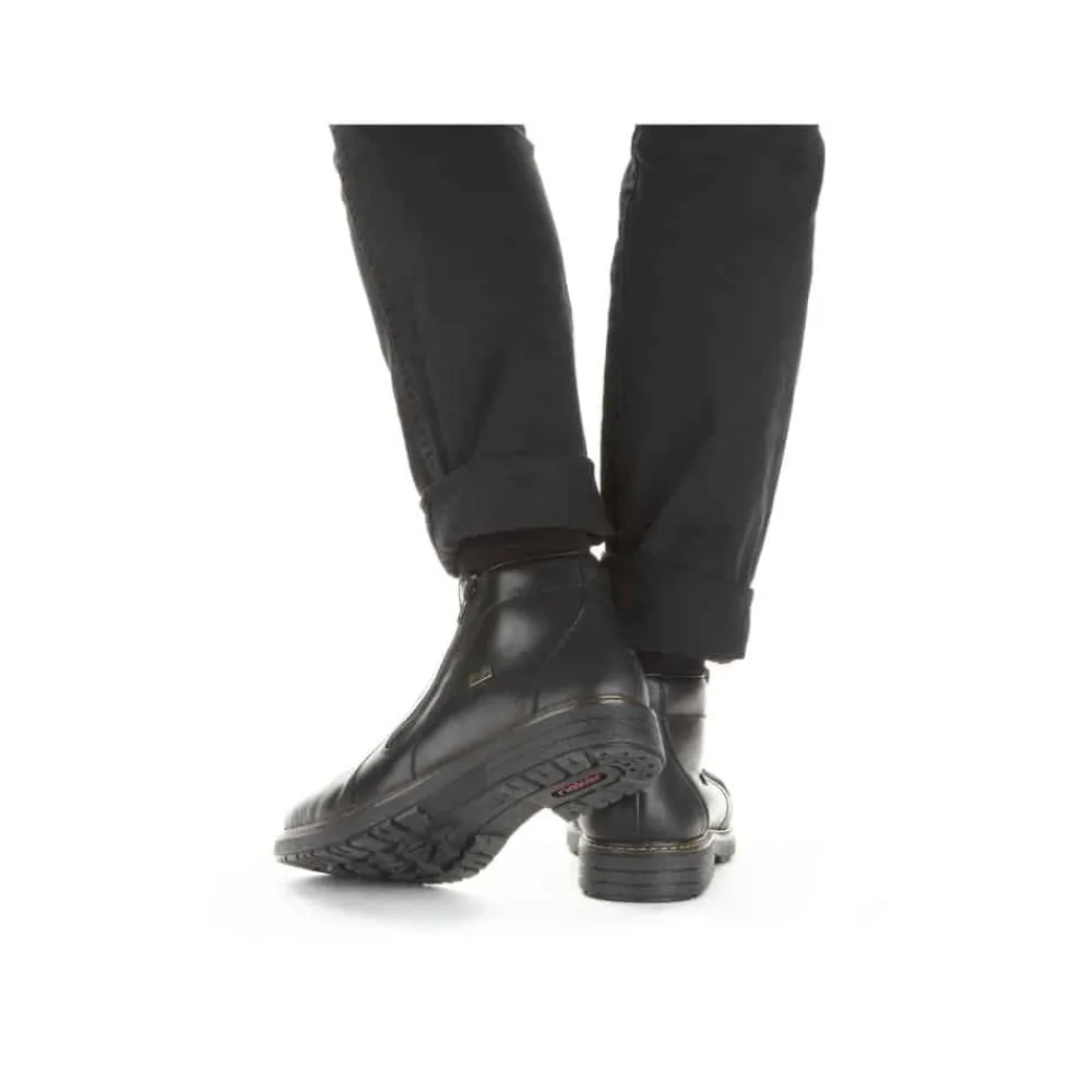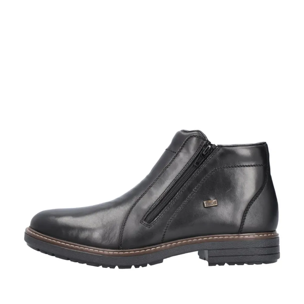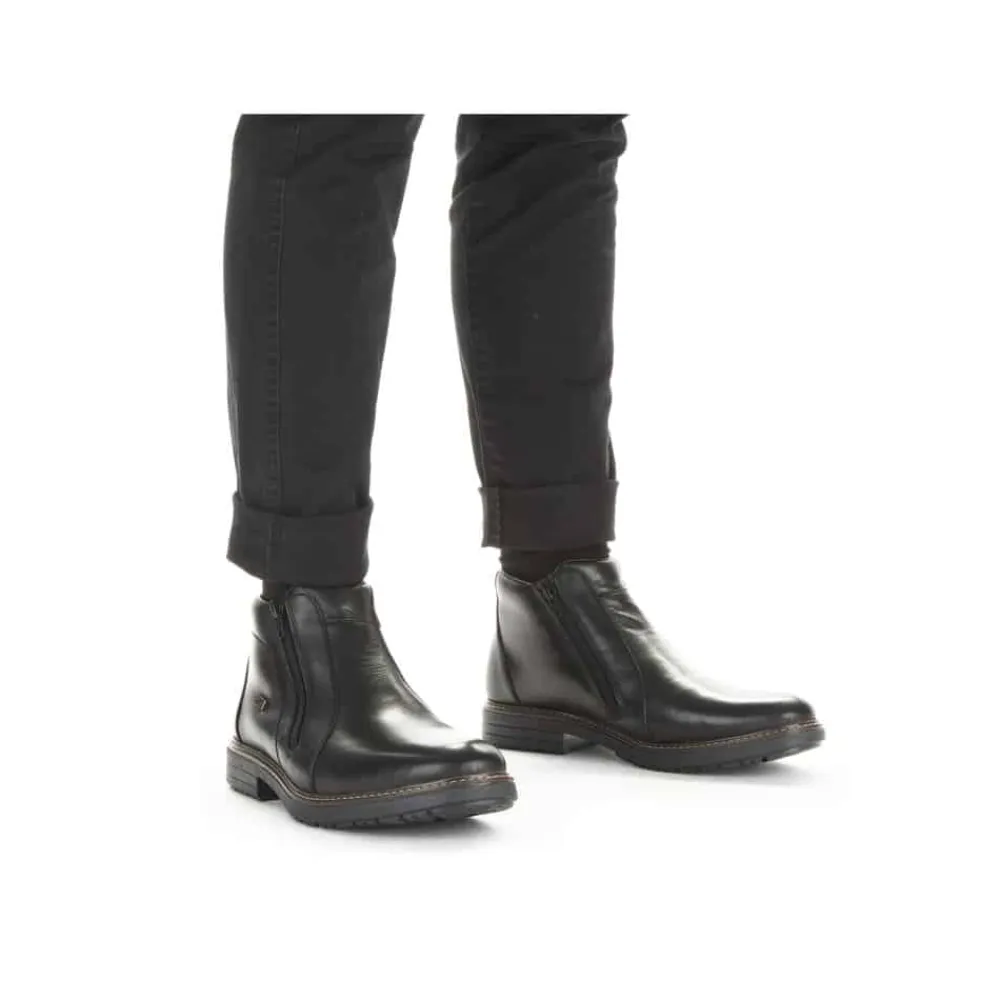 Rieker støvle til herre i sort. Forkæl dig selv med Rieker’s sorte herrestøvler, hvor stil og komfort går op i en højere enhed. Støvlerne har lynlåslukning på begge sider, så de er nemme at tage af og på. Den 3.5 cm høje hæl giver dig en elegant løft, uden at gå på kompromis med komforten. Lavet med en overdel førsteklasses skind og med en varm tekstilforing, holder de dine fødder behageligt varme hele dagen. Med RiekerTex-membranen er dine fødder beskyttet mod vind og vejr som gør støvlen vandafvisende, mens den slidstærke TPE/gummisål sikrer et fast greb på alle underlag. Disse støvler er det ideelle valg for den stilbevidste mand, der sætter pris på kvalitet og design.