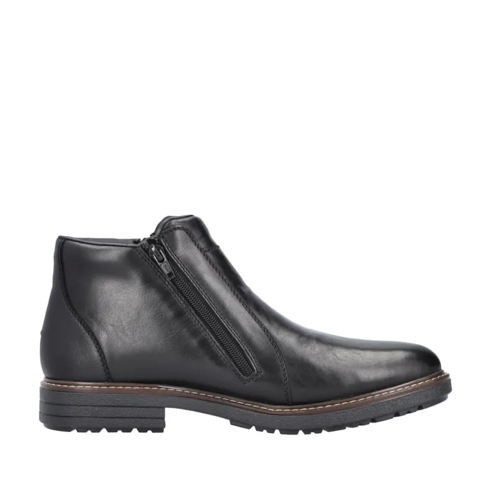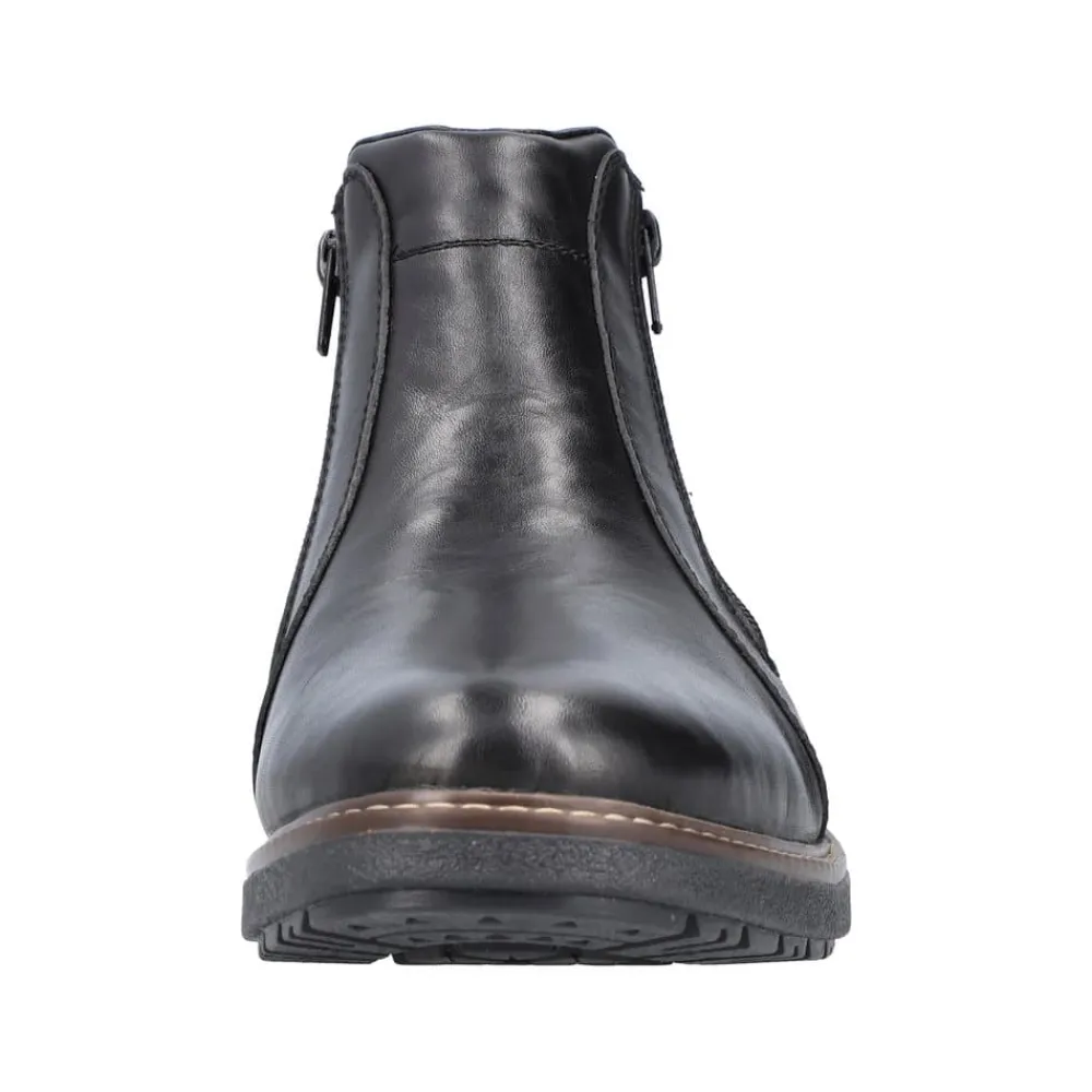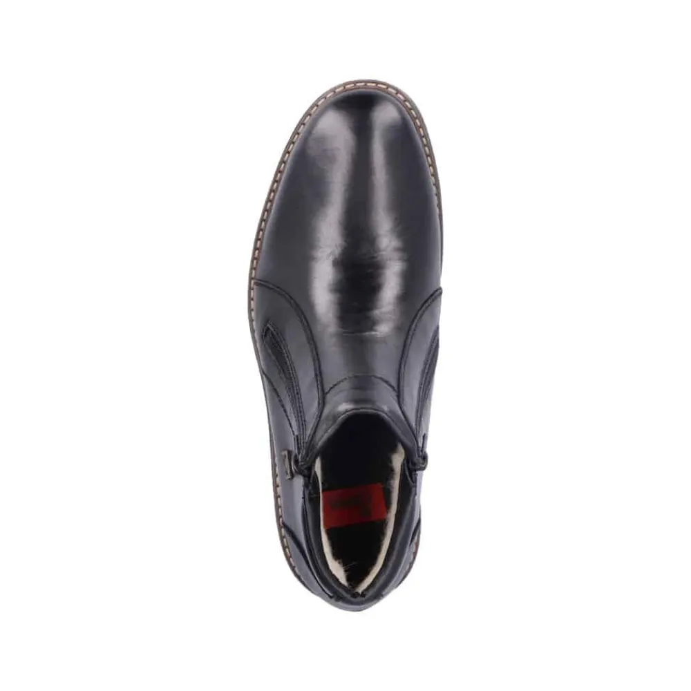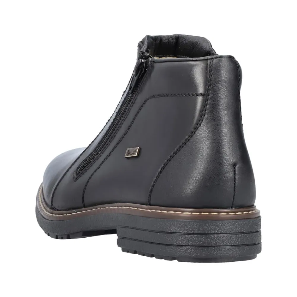 Rieker støvle til herre i sort. Forkæl dig selv med Rieker’s sorte herrestøvler, hvor stil og komfort går op i en højere enhed. Støvlerne har lynlåslukning på begge sider, så de er nemme at tage af og på. Den 3.5 cm høje hæl giver dig en elegant løft, uden at gå på kompromis med komforten. Lavet med en overdel førsteklasses skind og med en varm tekstilforing, holder de dine fødder behageligt varme hele dagen. Med RiekerTex-membranen er dine fødder beskyttet mod vind og vejr som gør støvlen vandafvisende, mens den slidstærke TPE/gummisål sikrer et fast greb på alle underlag. Disse støvler er det ideelle valg for den stilbevidste mand, der sætter pris på kvalitet og design.