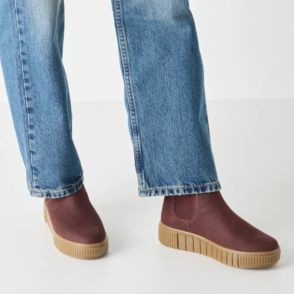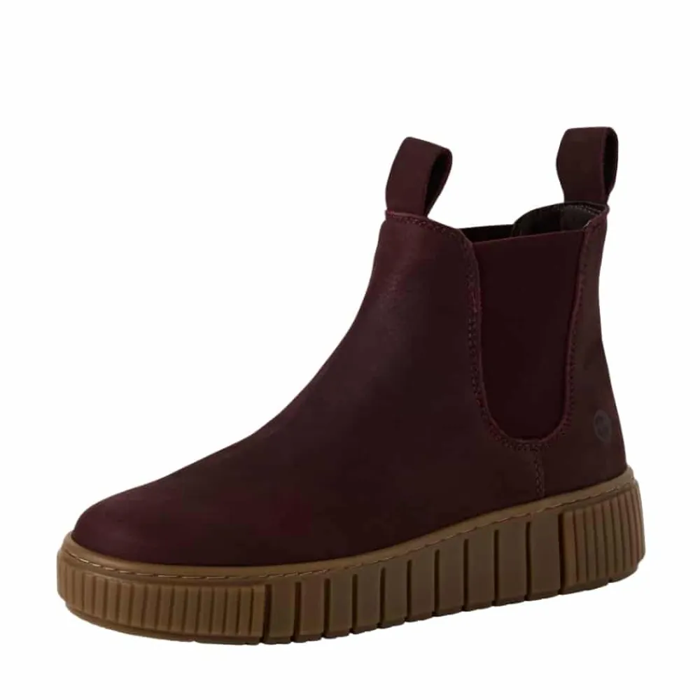 Tamaris støvle til dame i bordeaux. Disse støvler i bordeaux kombinerer stil og funktion i én løsning. Skindoverdelen giver et klassisk udtryk, mens elastikken på begge sider gør det let at tage støvlen af og på. Indvendigt møder du en let foring og en blød sål, som kan tages ud, hvis du har brug for det. Ydersålen har en højde på 4 cm, der giver et elegant finish, og mønsteret bidrager til både øget stødabsorbering og skridsikkerhed i dine skridt.