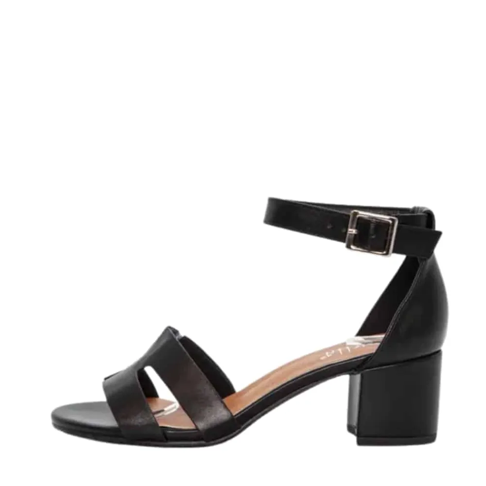 Duffy Rivello Diciotto sandal til dame i sort. Flot sandal med et feminint design og et enkelt udtryk. Skoen har en ankelspænde der gør det muligt at tilpasse sandalen, så den sidder godt på foden. Indvendigt finder du en blød indersål, som giver god komfort dagen igennem. Den 5,5 cm høje hæl giver et elegant løft uden at gå på kompromis med komforten. Ydersålen er designet med mønster, der giver øget skridsikkerhed ved brug.
