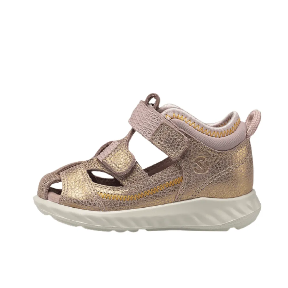 Ecco sandal i rosa til børn. Super fin sandal fra Ecco i den fineste skinnende rosa farve og detaljer. Modellen har lukket tå, så tæerne er godt beskyttet samtidigt med at der er godt med luft til fødderne. Modellen har to velcro-lukninger, hvilket gør det nemt og hurtigt at komme i/af sandalen. Modellen er dejlig let og stødabsorberende.