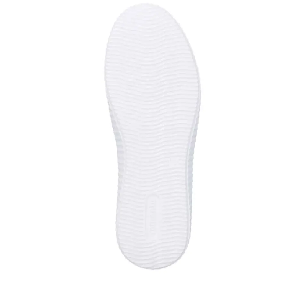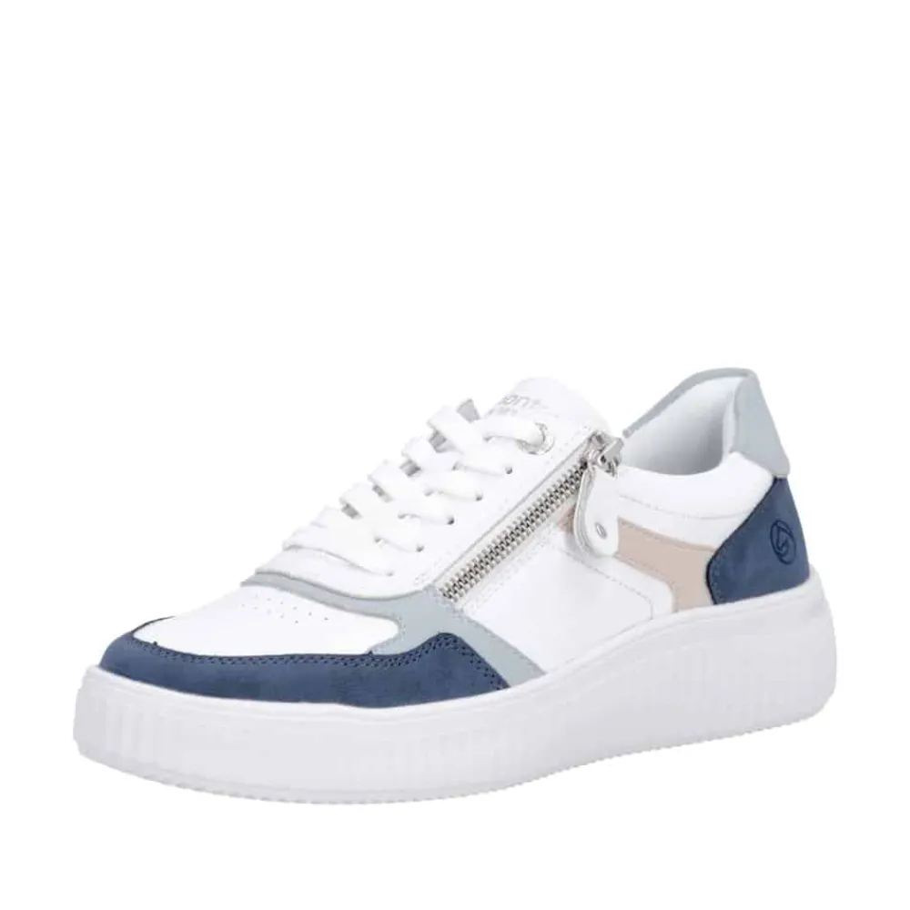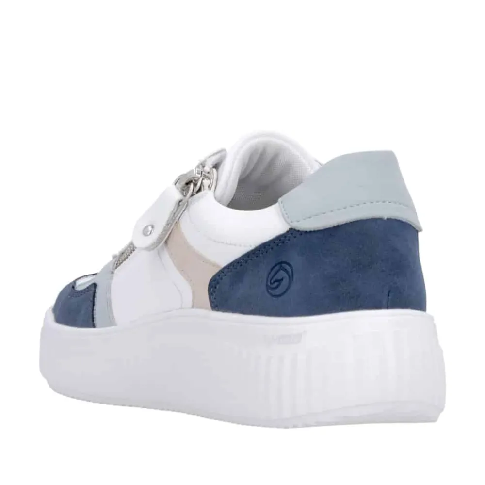 Remonte sneakers til dame i hvid. Disse smarte sneakers med skindoverdel i hvid og blå detaljer kombinerer stil med praktiske løsninger til hverdagen. Skoen er udstyret med både snørebånd og en funktionel lynlås, så pasformen nemt kan justeres efter foden. Indvendigt bliver du mødt af en blød og udtagelig indersål samt ekstra bredde (H), som giver god rummelighed og høj komfort hele dagen. Ydersålen er designet med et mønster, der giver øget stødabsorbering og skridsikkerhed i hvert skridt.