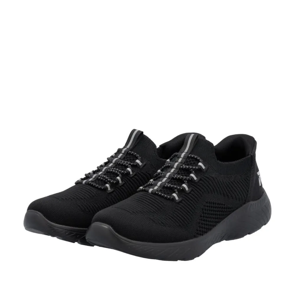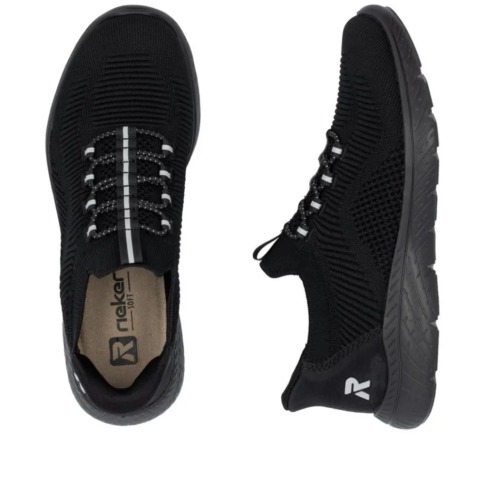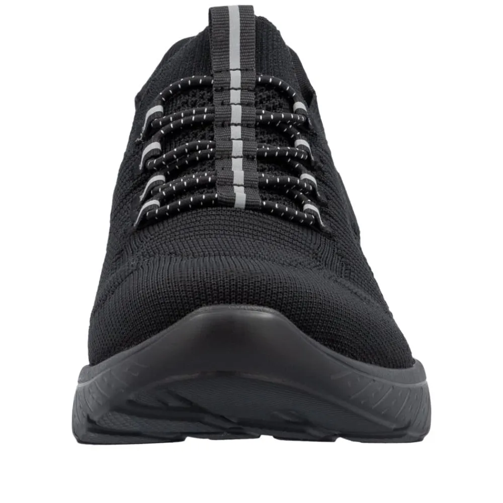 Rieker Ready 2 Go sneakers til dame i sort. Moderne sneakers i sort med flotte detaljer og elastik foran, der sikrer en fleksibel og behagelig pasform. Skoen er udstyret med Hands Free Ready 2 Go teknologi og en fast hælkappe, så du nemt kan tage skoen på uden at bruge hænder. Indvendigt finder du en blød memosoft sål, som giver maksimal komfort hele dagen. Ydersålen er stødabsorberende og har et mønster, der giver øget stabilitet og skridsikkerhed.