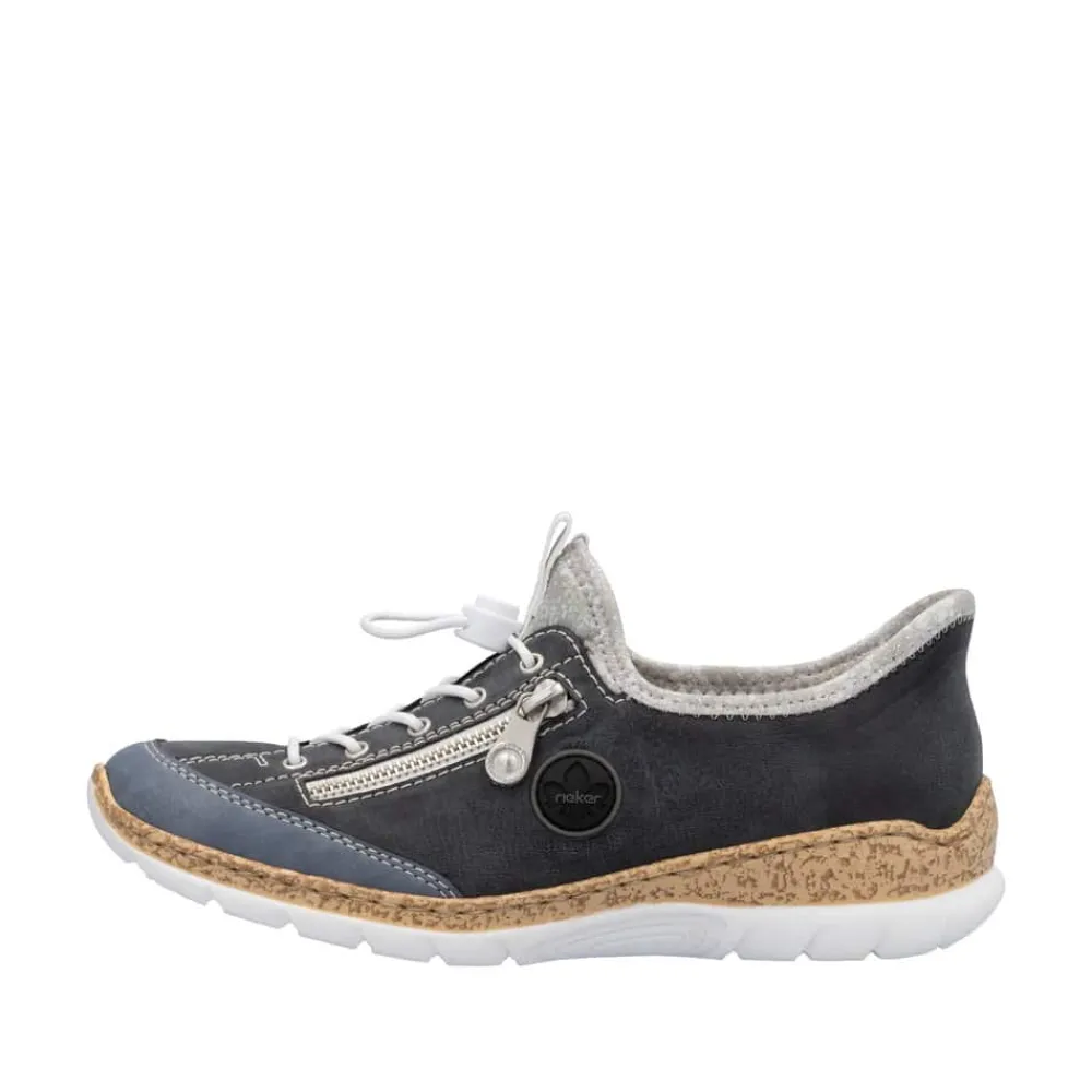 Rieker Ready 2 Go sneakers til dame i lyseblå. Populær sneakers i en moderne blå farve, der pyntes af fine detaljer ved åbningen. Skoen er udstyret med den innovative Hands Free Ready 2 Go teknologi, der takket være den faste hælkappe, gør det nemt at komme i og af skoen uden brug af hænder. Desuden har skoen elastik foran der gør det muligt at justere pasformen efter dine behov. Indvendigt bliver du mødt af en dejlig blød memosoft sål, der sikrer optimal komfort dagen lang. Ydersålen er god og solid samt udstyret med stødabsorberende egenskaber samt øget skridsikkerhed, takket være det gode mønster under sålen.