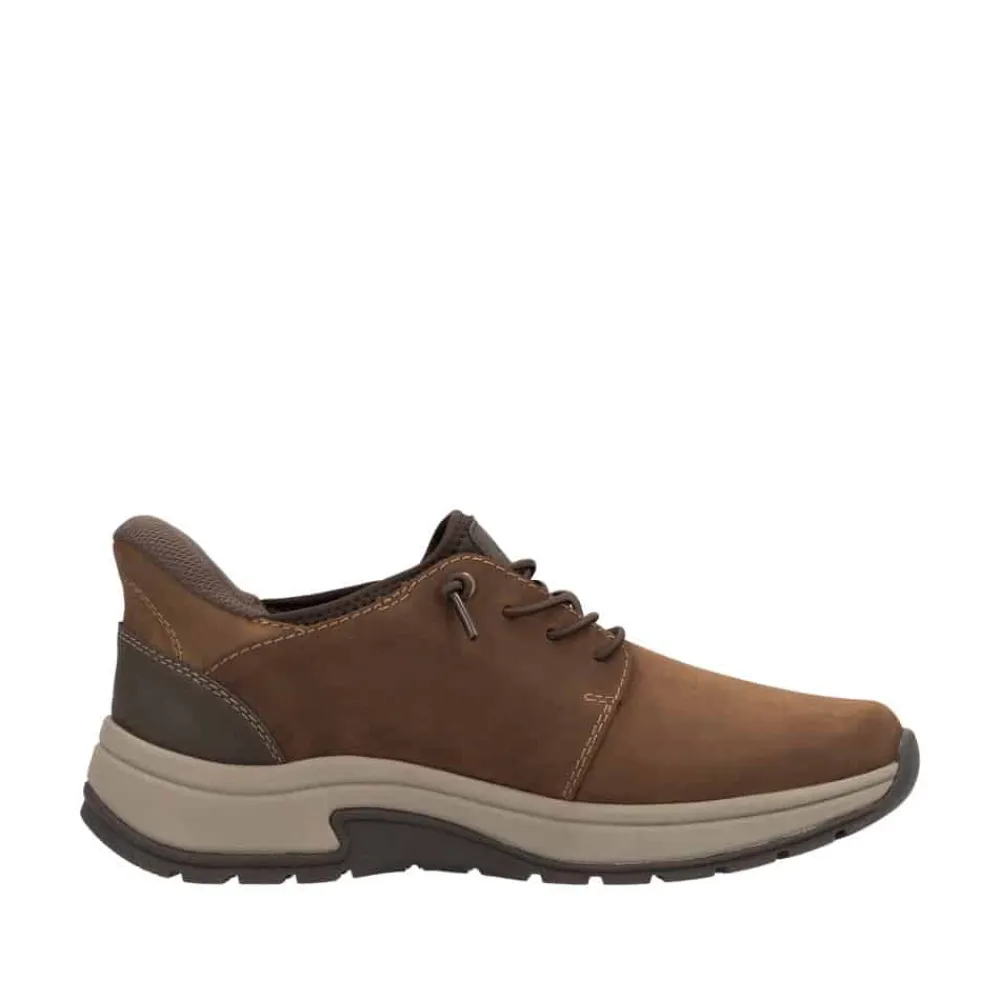 Rieker Ready 2 Go sneakers til herre i brun. Denne sneakers kombinerer stil og komfort på bedste vis. Overdelen i blødt ruskind giver en behagelig følelse, mens Hands Free Ready 2 Go teknologien og den faste hælkappe gør det nemt at træde i skoen uden hænder. Den elastiske front og den bløde, udtagelige indersål sikrer en behagelig pasform hele dagen. Skoen har ekstra bredde H for mere rummelighed, og den stødabsorberende ydersål med mønster giver stabilitet og støtte ved hvert skridt.