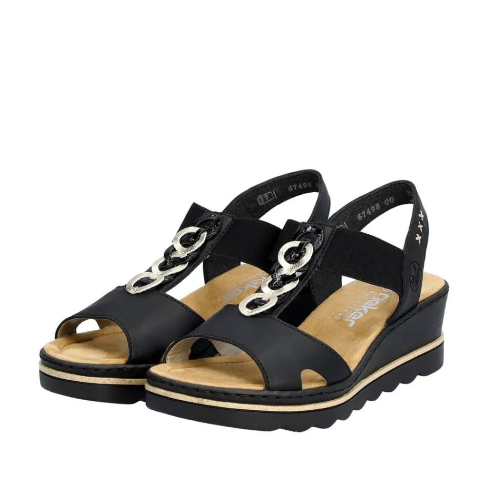 Rieker sandal til dame i sort. En fantastisk stilfuld sandal med en masse af smukke detaljer. Denne sandal er designet med en elastisk rem, der gør det legende let at glide i og ud af den. Med en skøn blød sål, der er udstyret med stødabsorberende egenskaber, sikrer den optimal komfort hele dagen. Med en hælhøjde på cirka 5 cm tilføjer den en elegant højde til dit look.