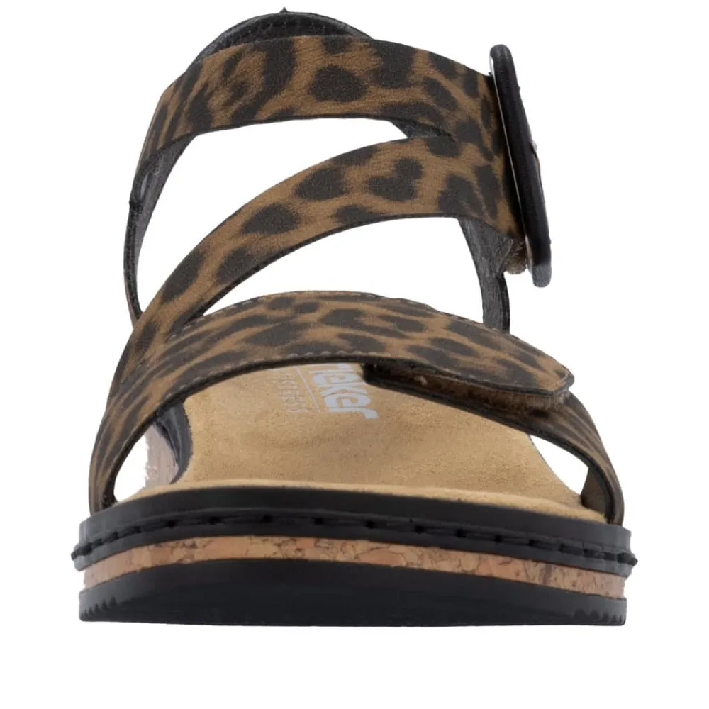 Rieker sandal til dame i leopard. Denne populære Rieker sandal kombinerer et moderne leopardmønster med høj komfort. De to velcroremme gør det nemt både at justere pasformen og hurtigt komme i og af sandalen. Indersålen er blød og sikrer, at dine fødder har det behageligt hele dagen. Kilehælen på 3,5 cm giver et elegant løft, mens ydersålen med stødabsorbering og rillet mønster sørger for øget stabilitet og skridsikkerhed.
