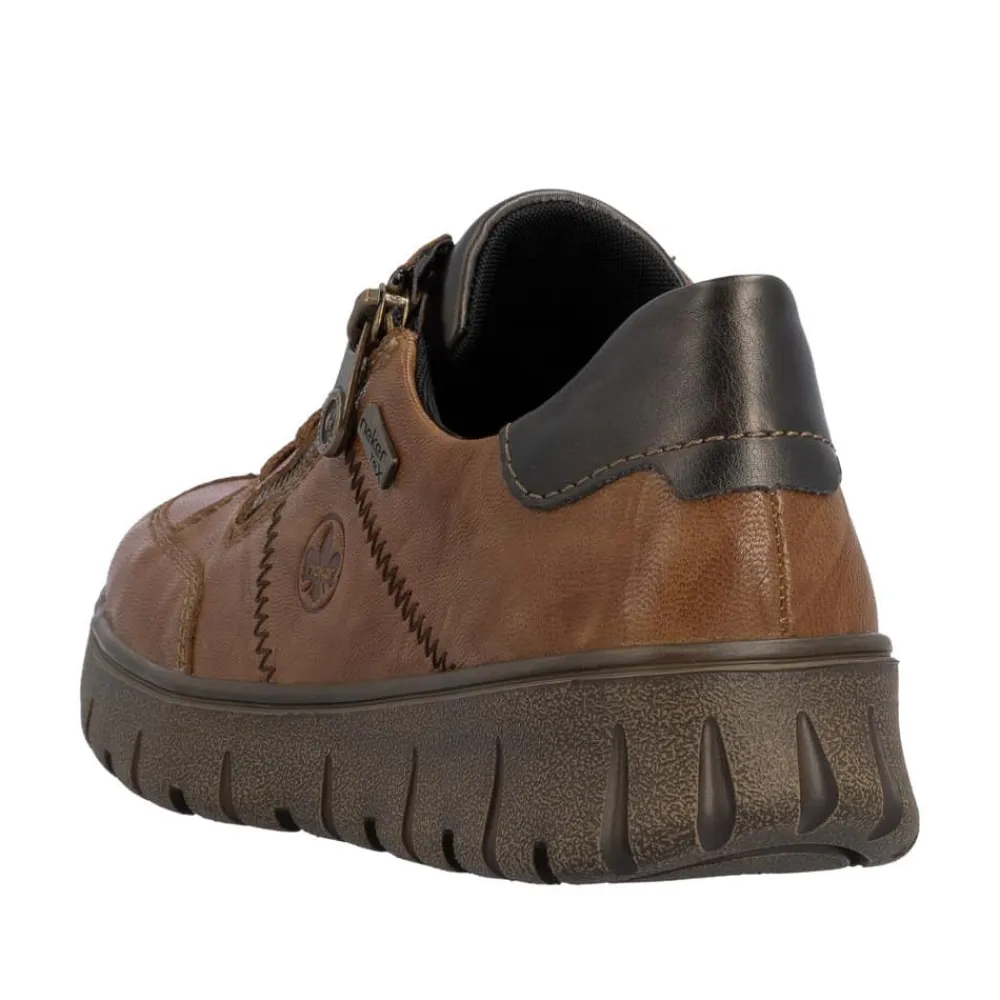 Rieker sneakers til dame i brun. Disse sneakers i skind er et praktisk valg til hverdagen, hvor både komfort og funktionalitet er i fokus. Modellen er udstyret med snørebånd og en funktionel lynlås, som gør det nemt at justere pasformen. Indvendigt finder du en blød udtagelig indersål samt ekstra bredde (H), der giver foden god plads og øget komfort. Med Rieker-Tex er skoen kraftigt vandafvisende, og den mønstrede ydersål giver øget stødabsorbering og skridsikkerhed.
