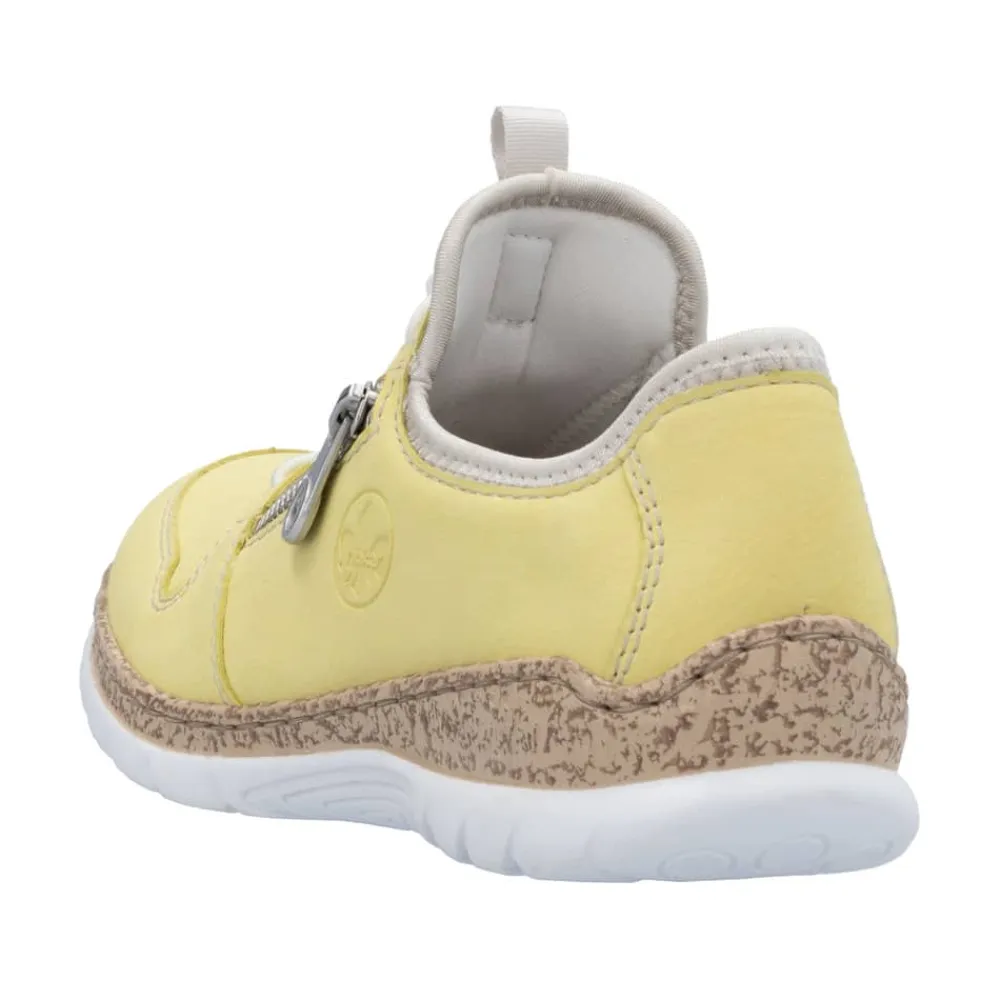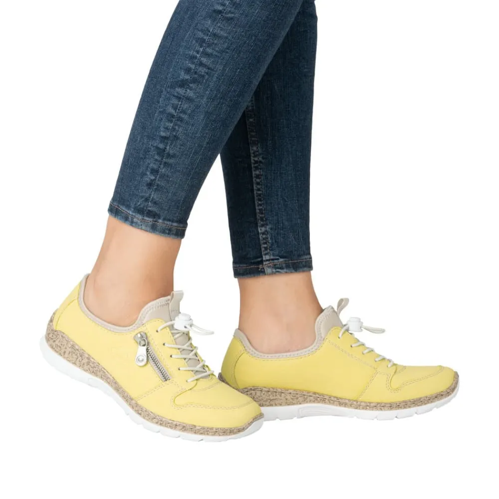 Rieker sneakers til dame i gul. Denne friske sneakers i gul tilføjer et farverigt touch til din garderobe, samtidig med at fine detaljer giver et stilfuldt udtryk. Elastiksnørebåndet foran gør det nemt at tage skoen på og af, og du kan justere det for en perfekt pasform. Skoen er også pyntet med en lynlås på ydersiden, der tilføjer et ekstra strejf af stil. Indvendigt finder du en blød memosoft-sål, der sikrer optimal komfort hele dagen. Desuden er skoen udstyret med stødabsorberende såler og et skridsikkert mønster under sålen, der giver ekstra støtte hele dagen.